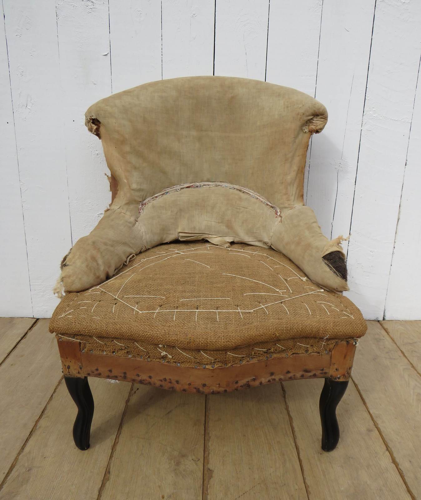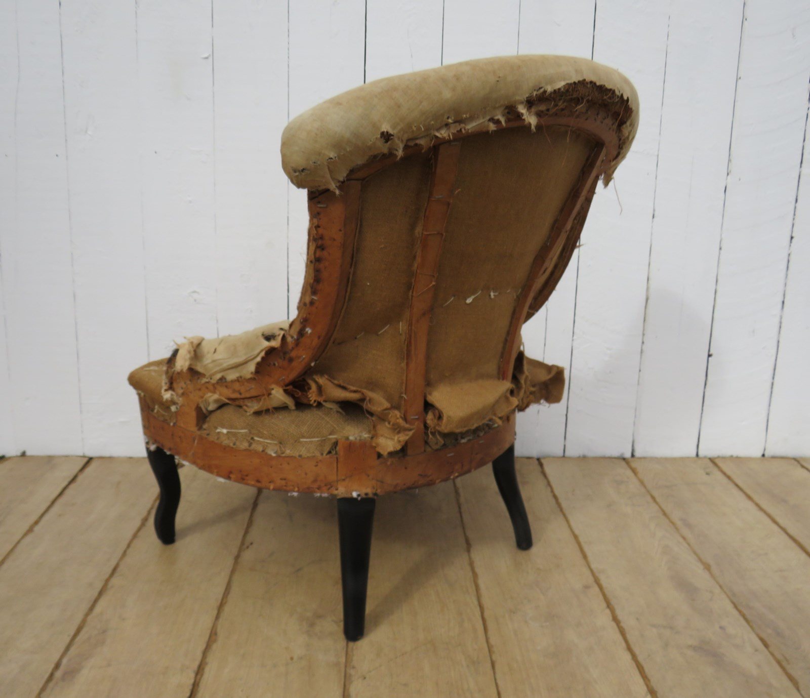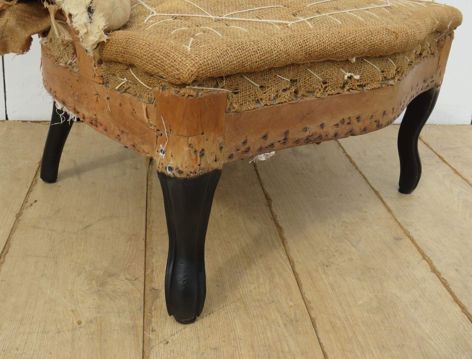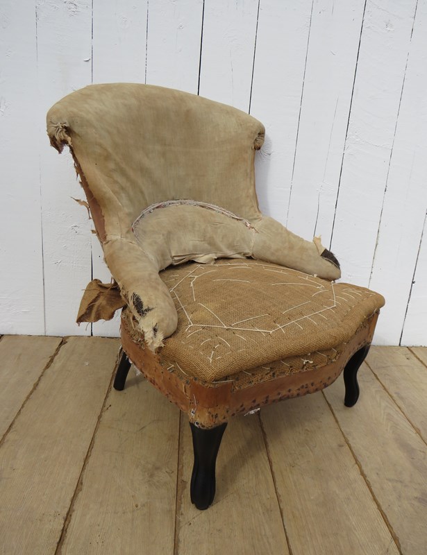 Shapely, sound, sturdy and sprung 19th century French serpentine fronted Napoleon III crapaud slipper, nursing, boudoir, tub armchair on ebonised legs for re-upholstery. Seat height 36cm & seat depth 43cm.