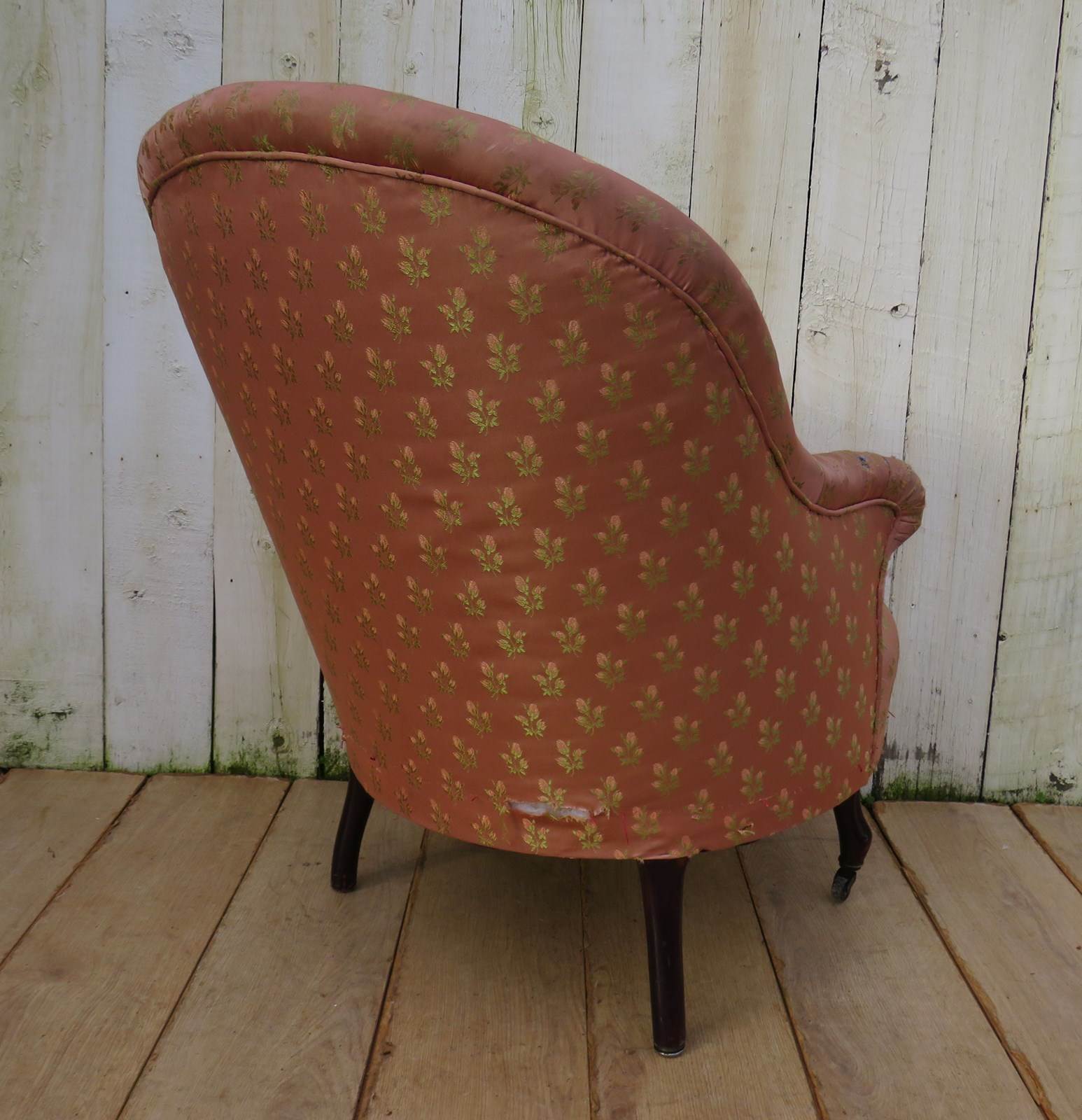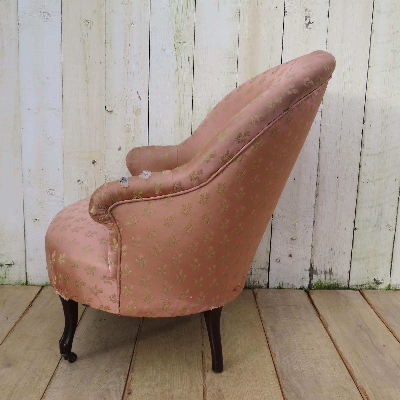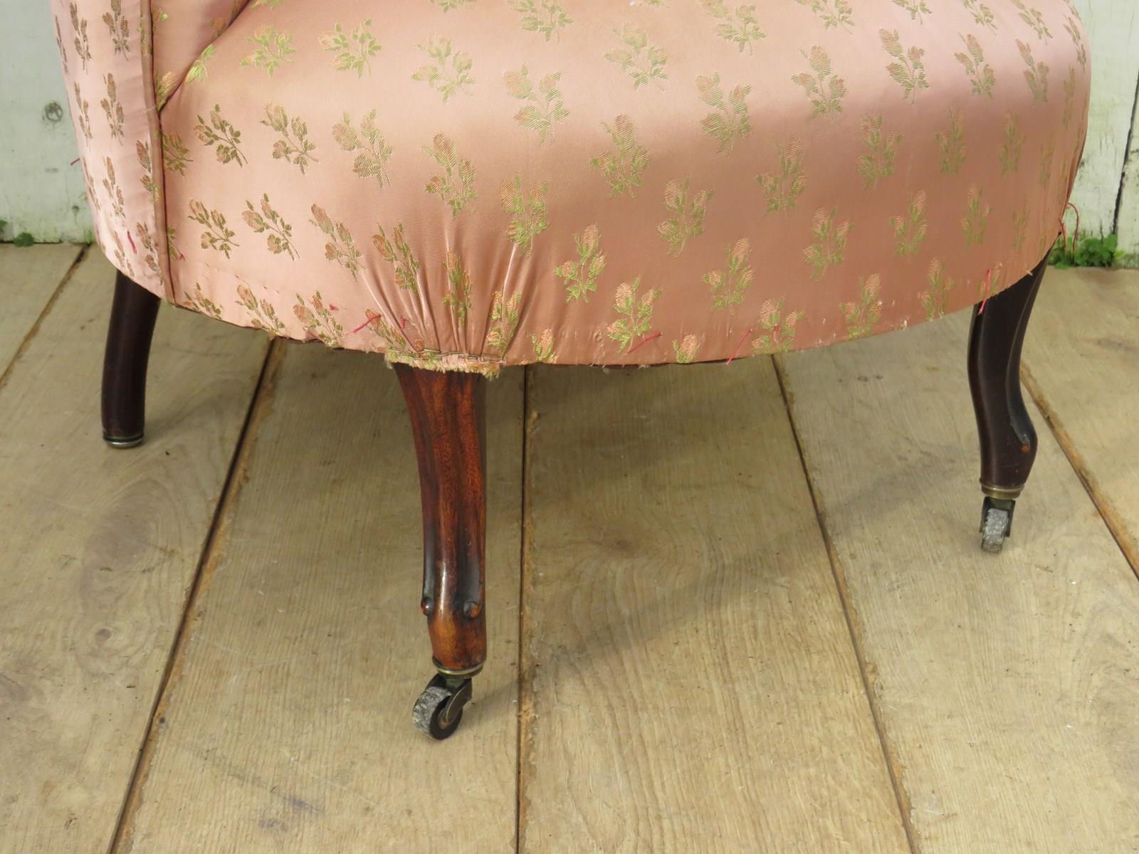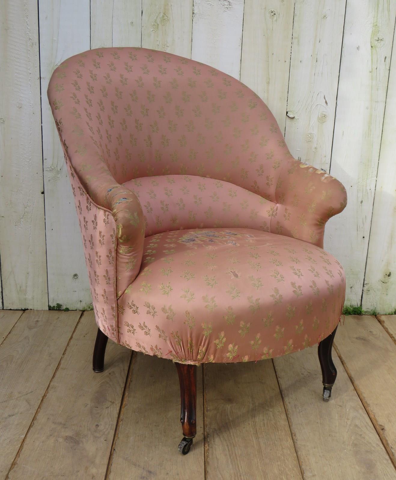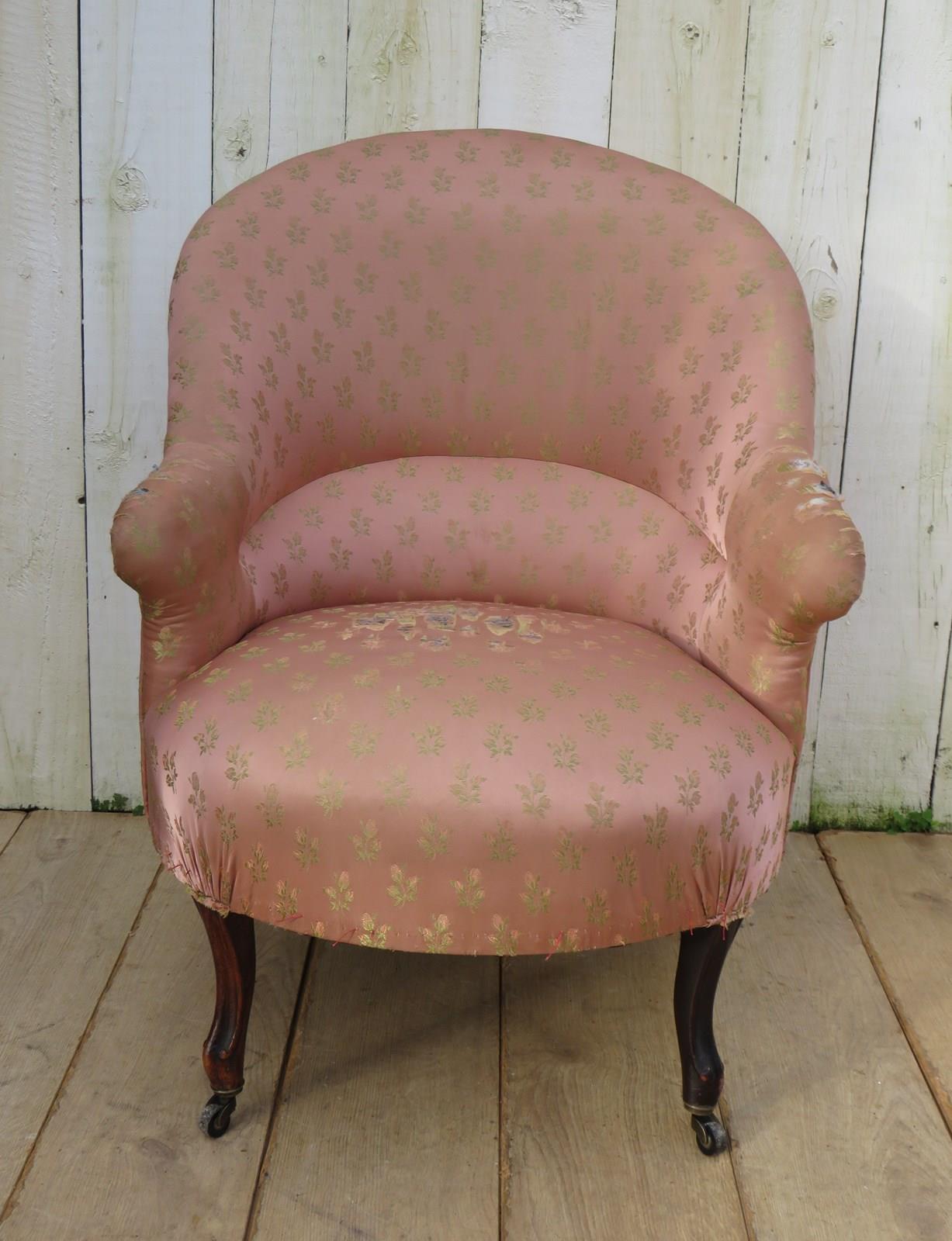 Shapely, sound and sturdy 19th century French crapaud Napoleon III nursing, boudoir, slipper tub armchair on walnut legs and castors to the front for re-upholstery. Seat height 42cm & seat depth 50cm.