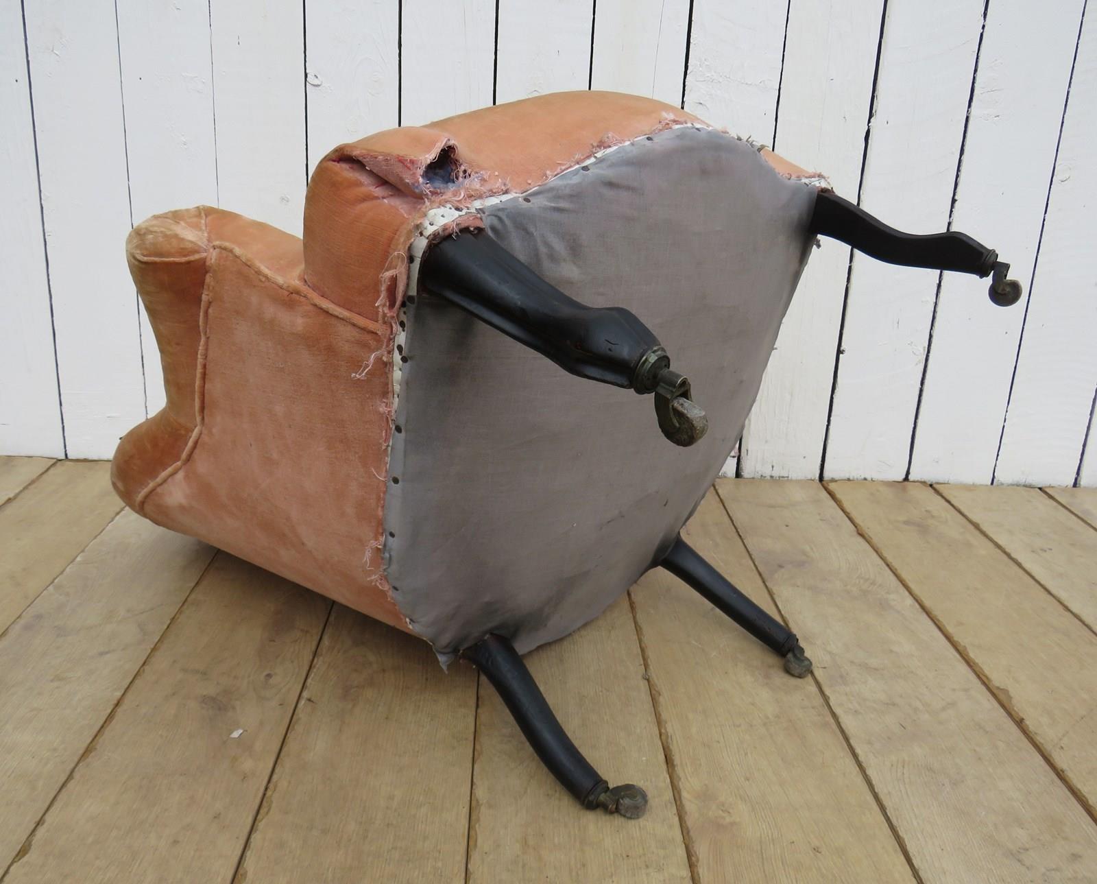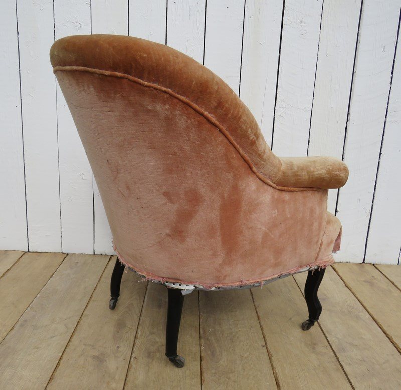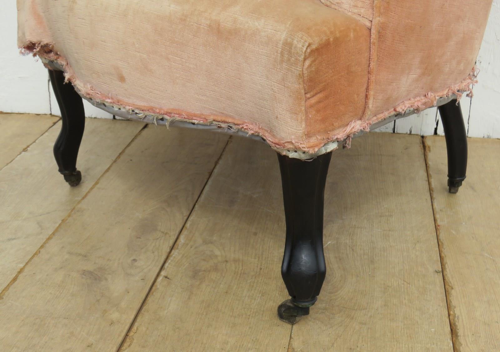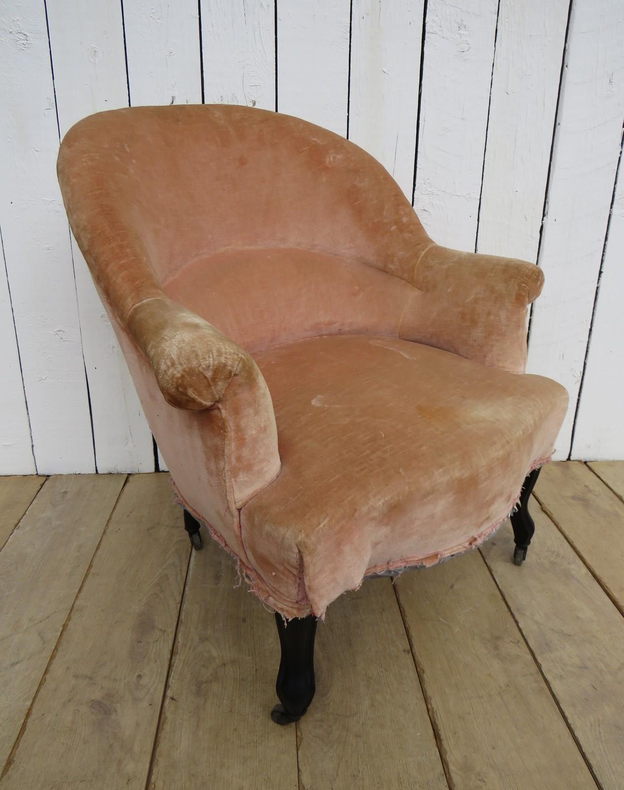 Shapely, sound, sturdy and sprung 19th century French serpentine fronted Napoleon III crapaud tub armchairs on ebonised legs and castors for re-upholstery. Seat height 43cm & seat depth 49cm.