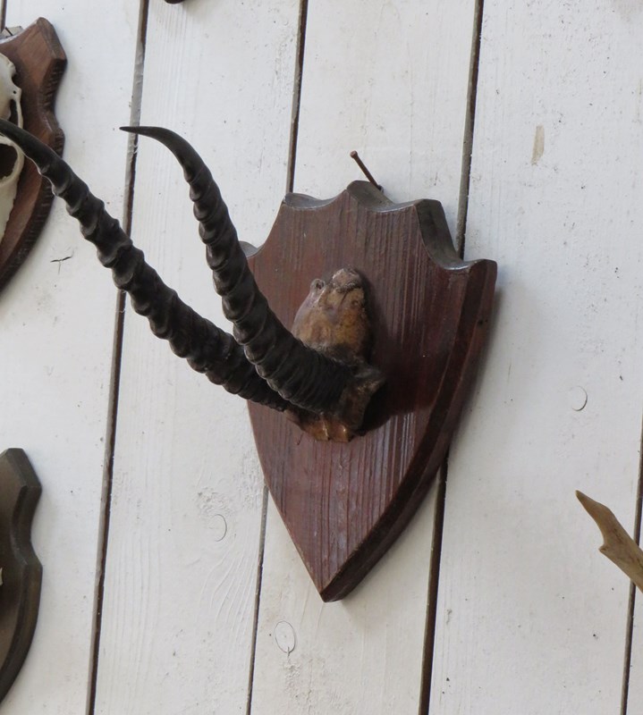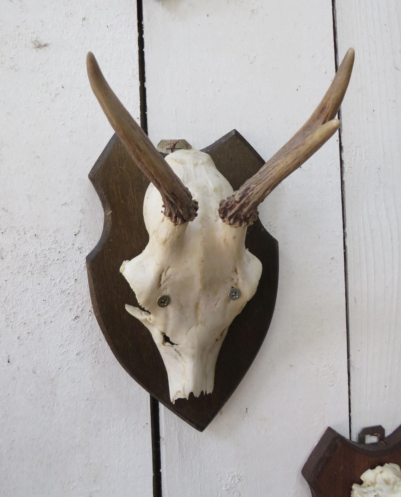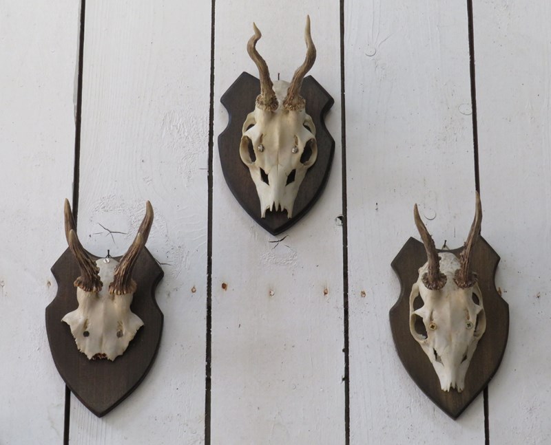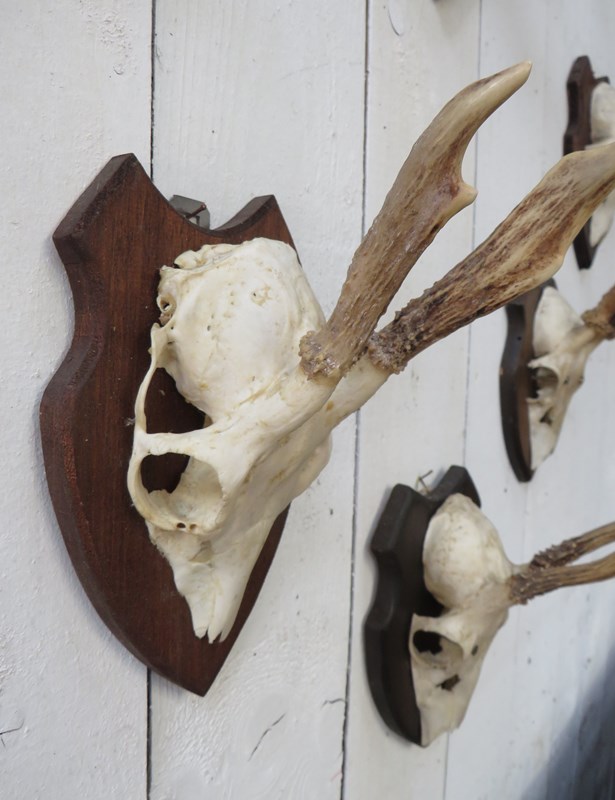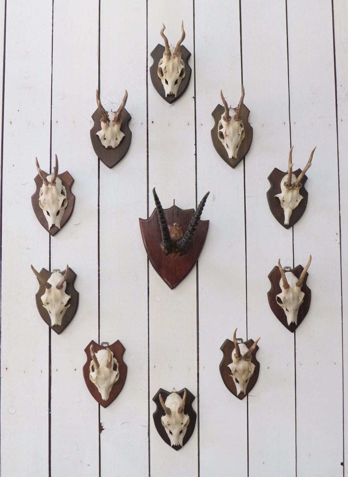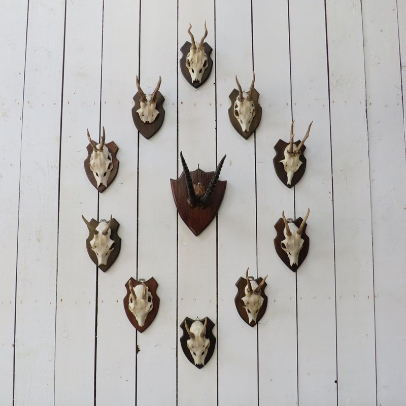Set of eleven decorative wall hanging roe deer and antelope antlers mounted on wooden shields.