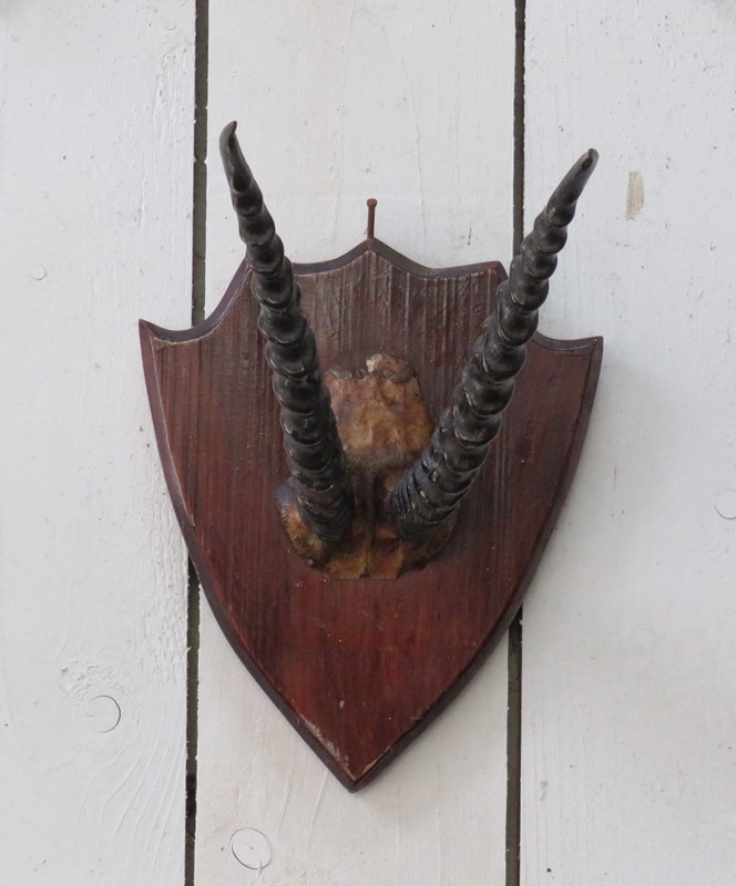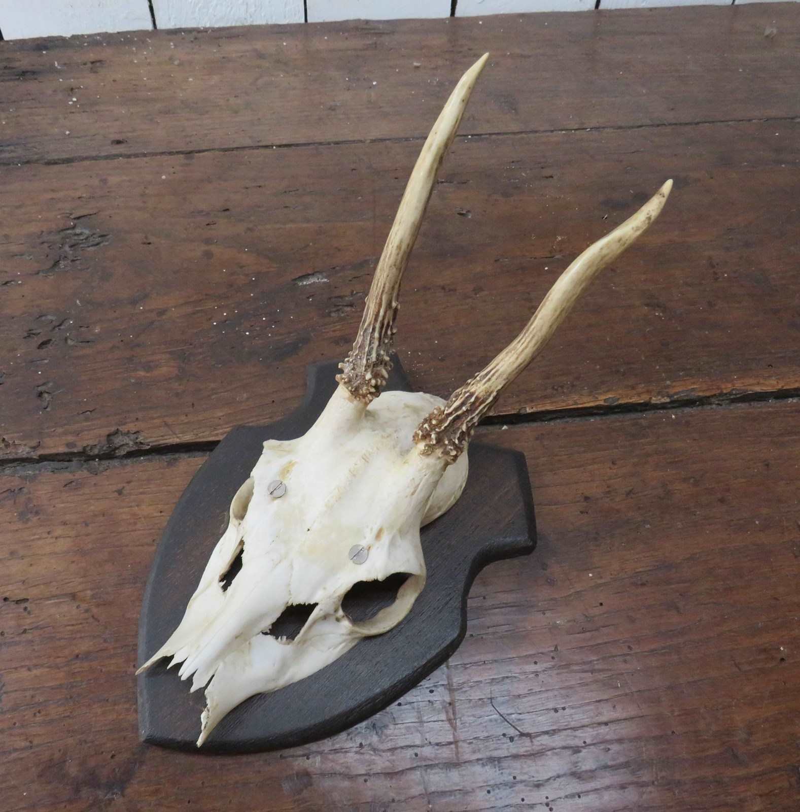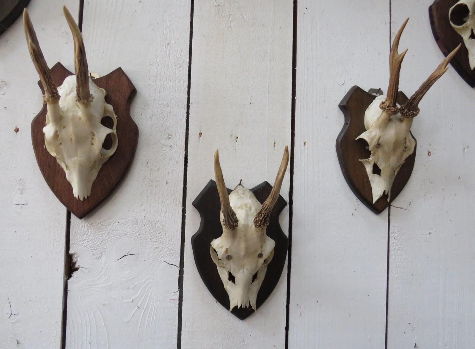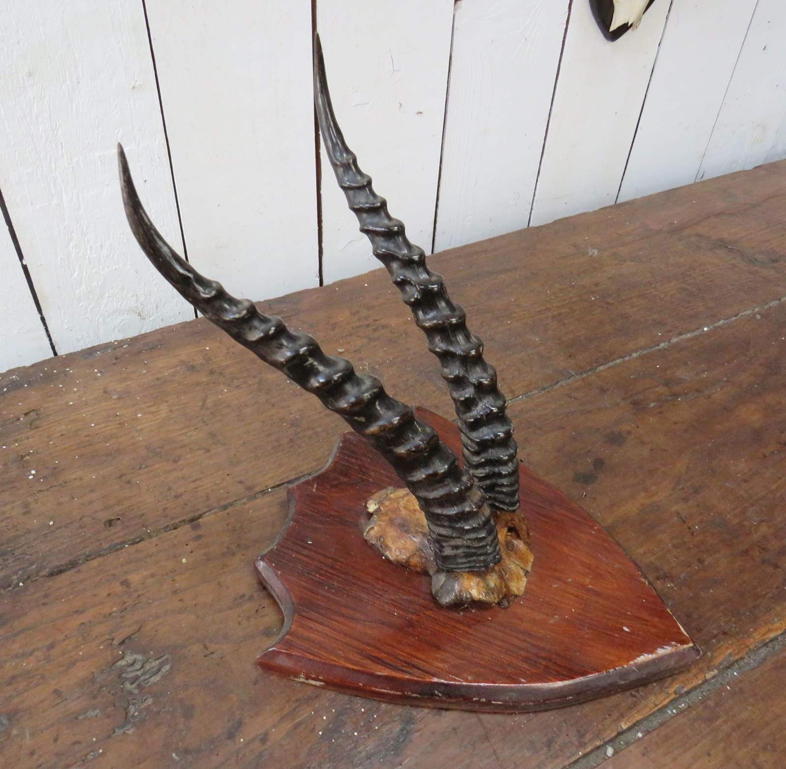Set of eleven decorative wall hanging roe deer and antelope antlers mounted on wooden shields.