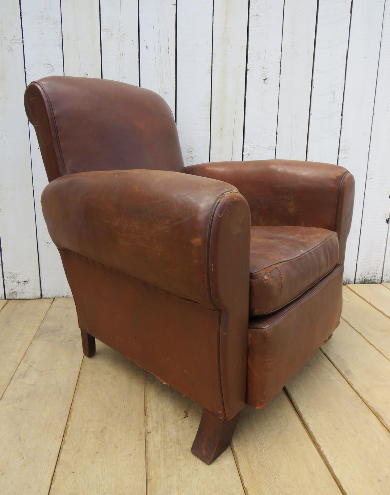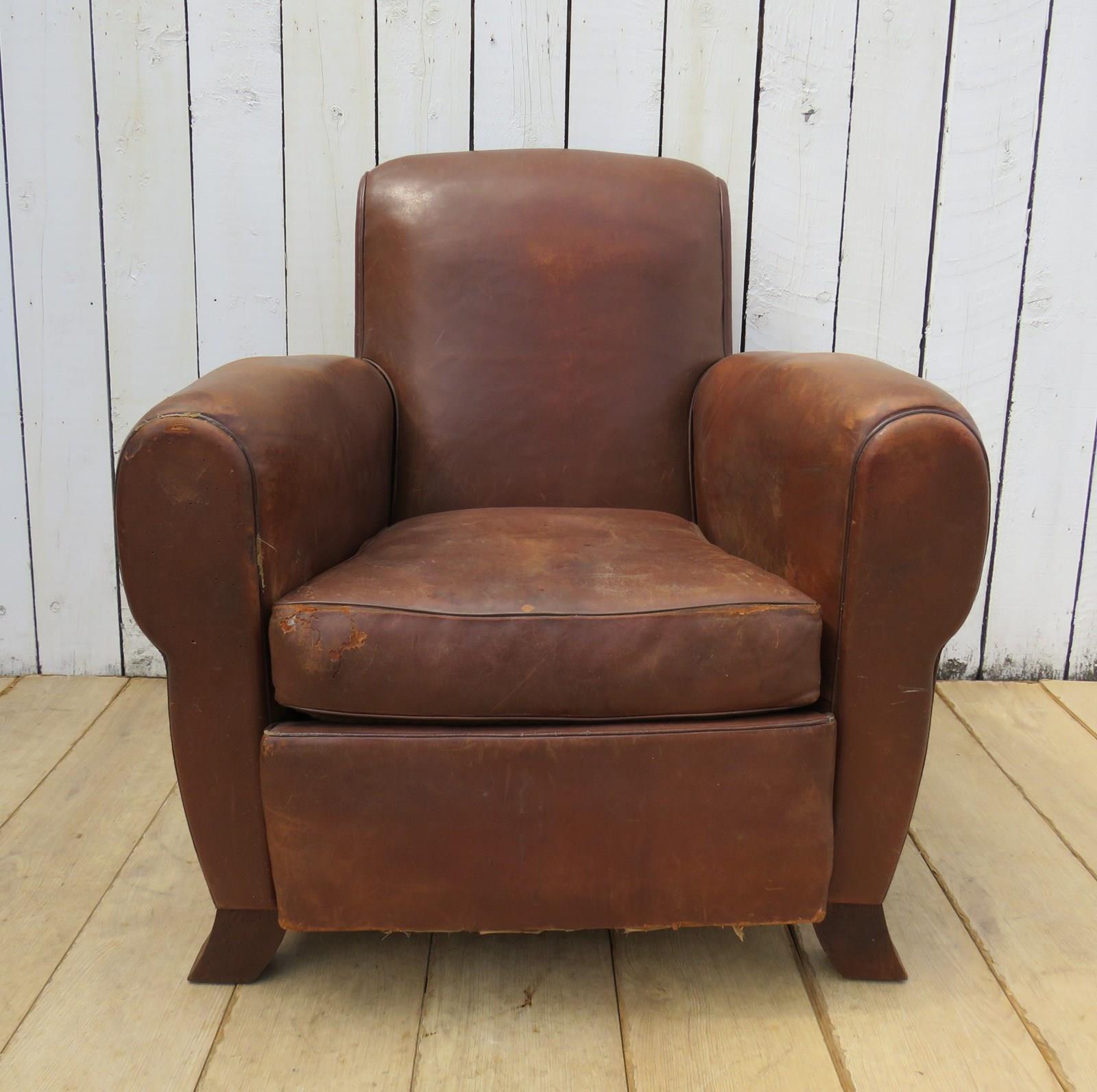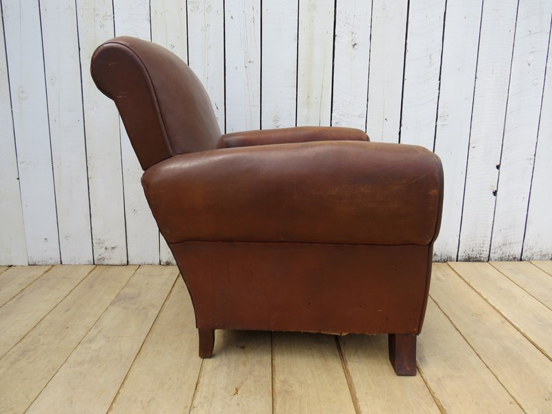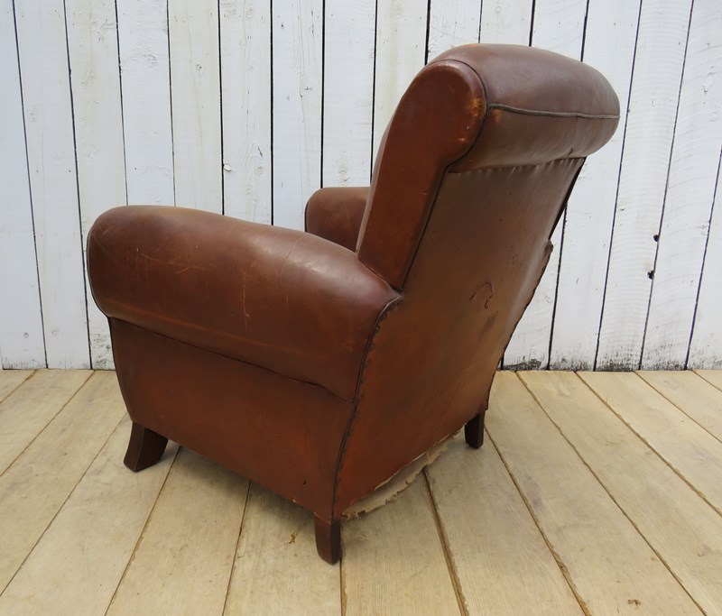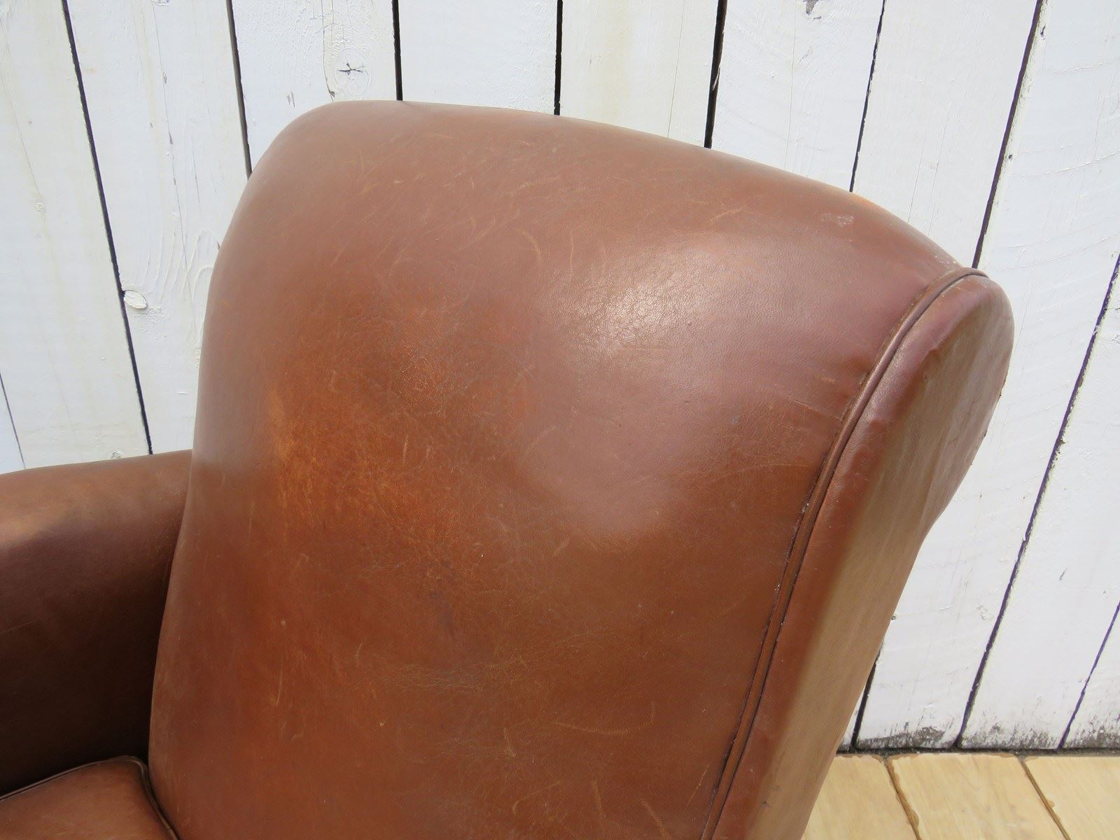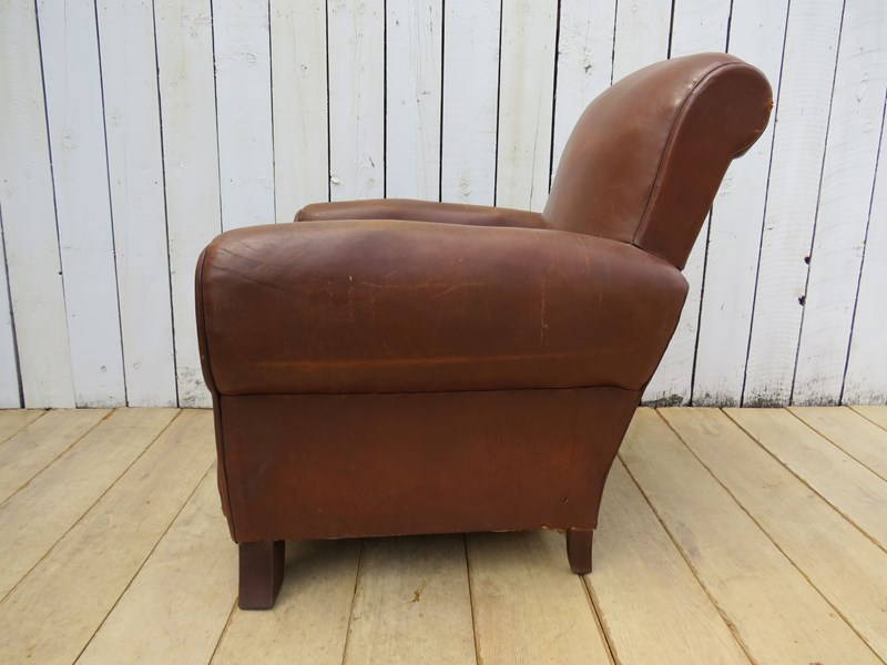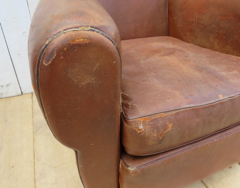 Shapely, sound, sturdy and sprung 1930-40s French scroll top leather club armchair. A few historical worm holes, age related wear and old repair to back highlighted in images. Seat height 43cm & seat depth 52cm.