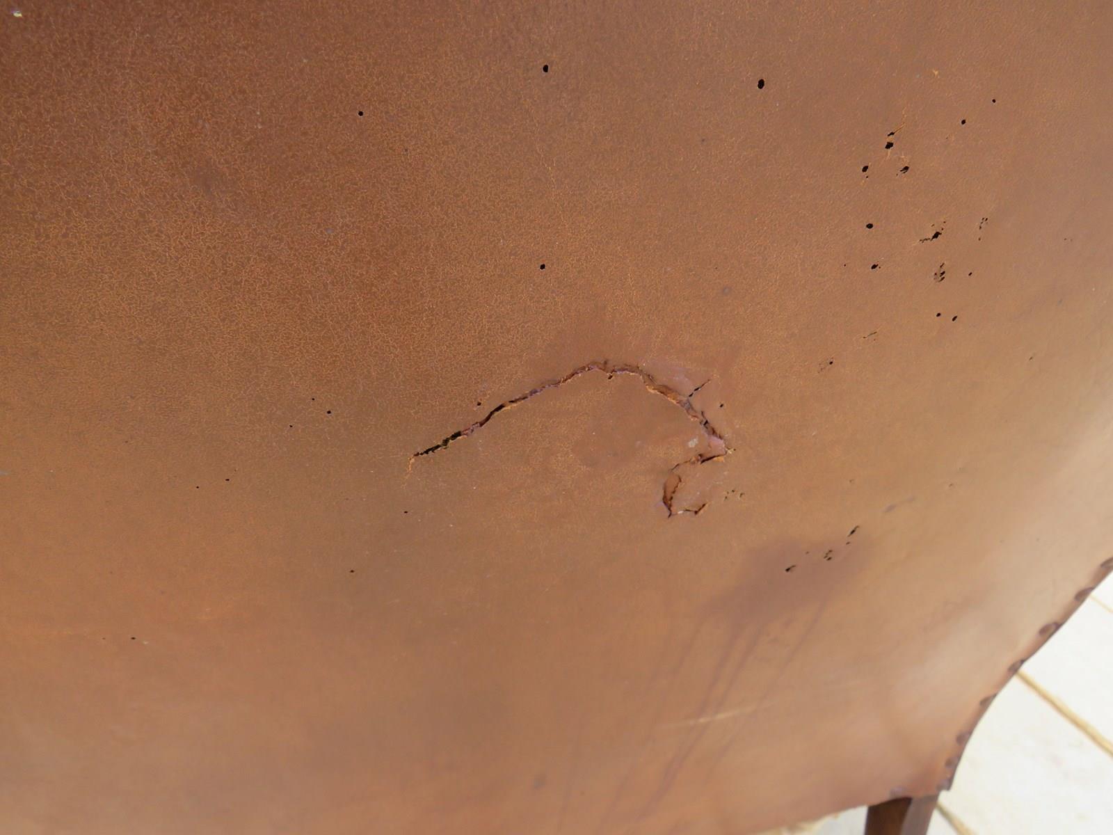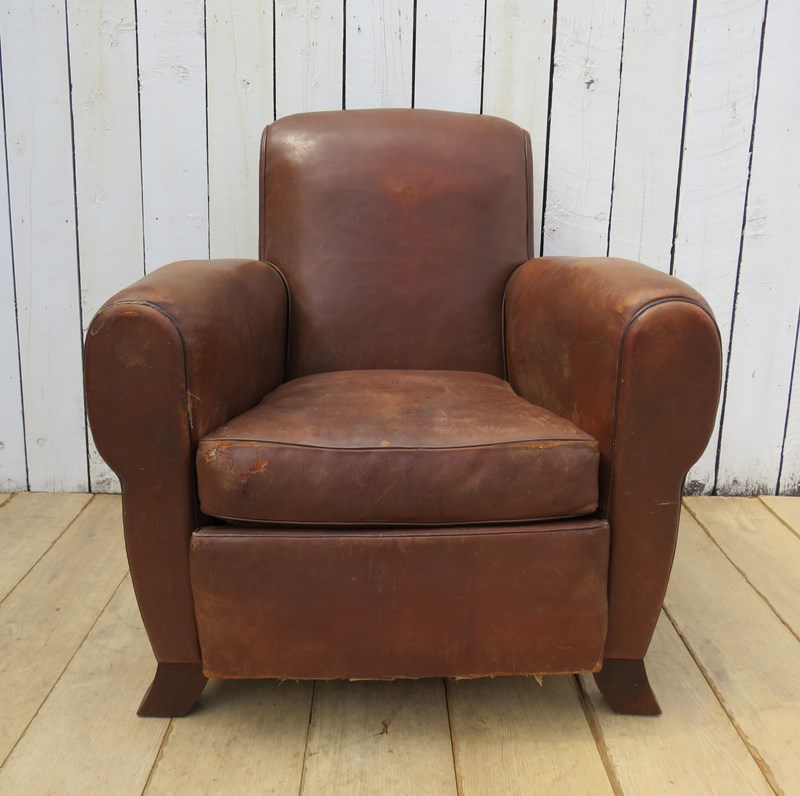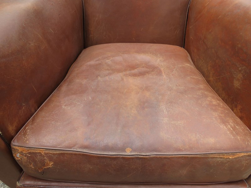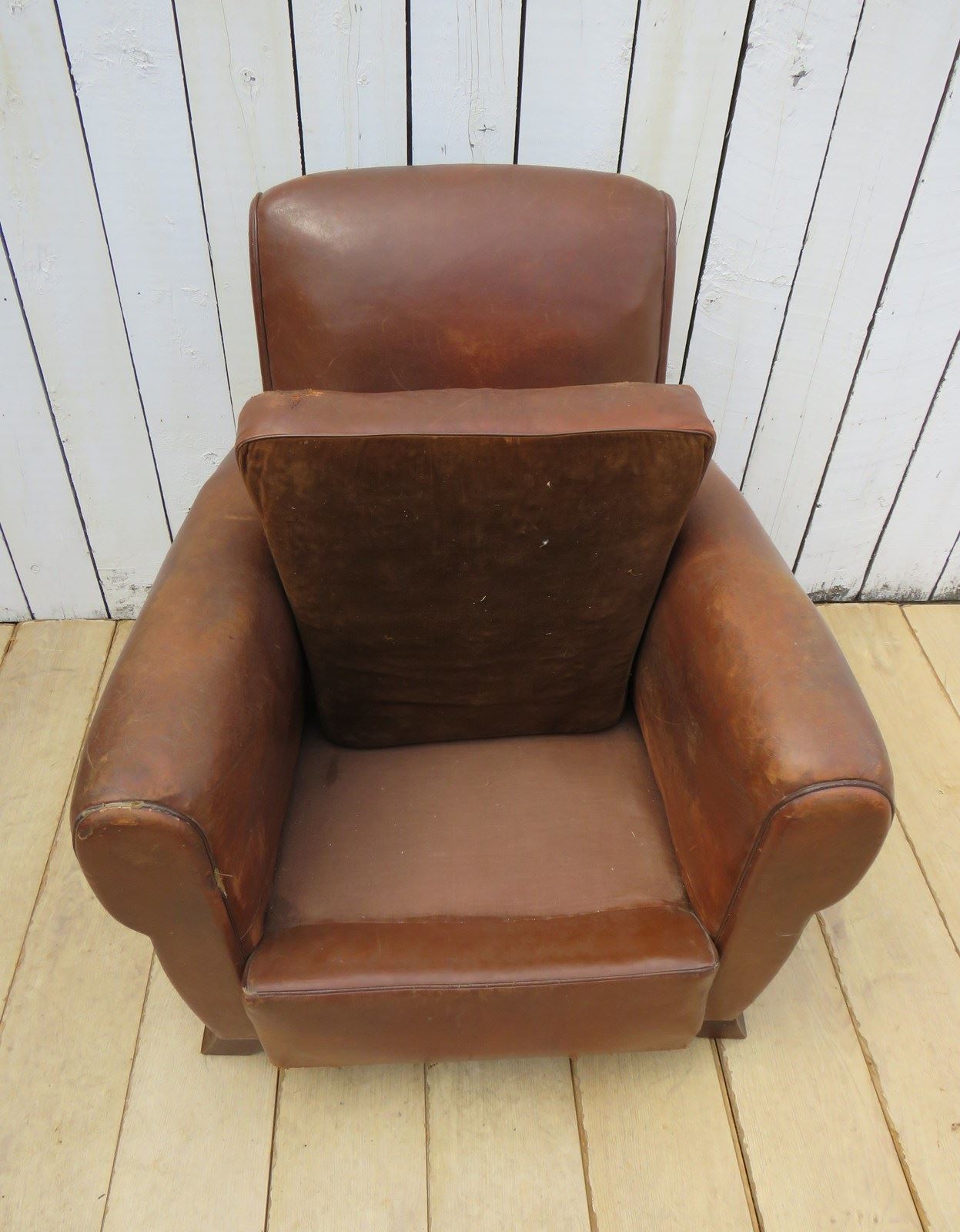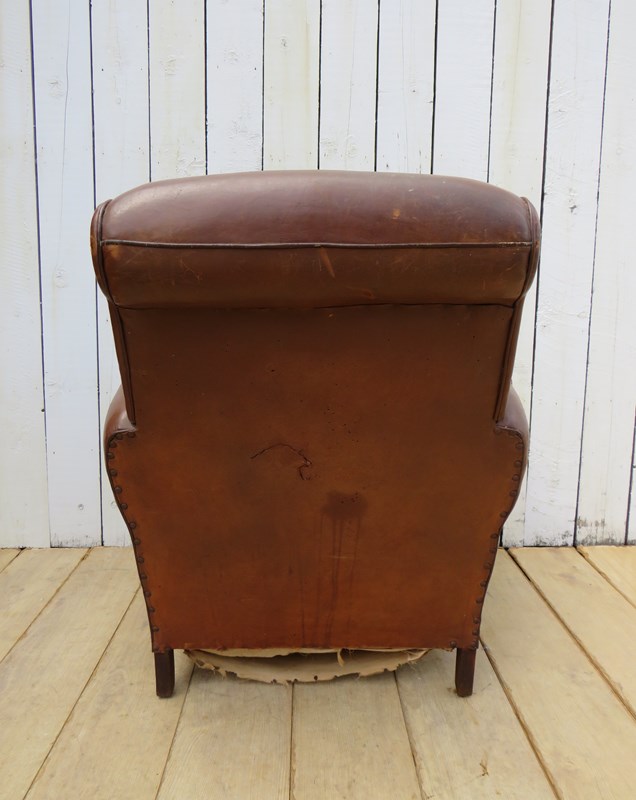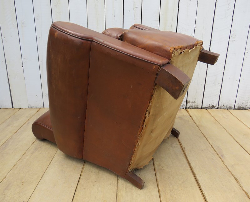 Shapely, sound, sturdy and sprung 1930-40s French scroll top leather club armchair. A few historical worm holes, age related wear and old repair to back highlighted in images. Seat height 43cm & seat depth 52cm.