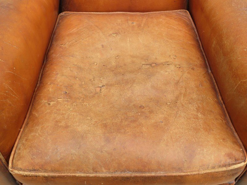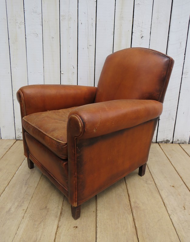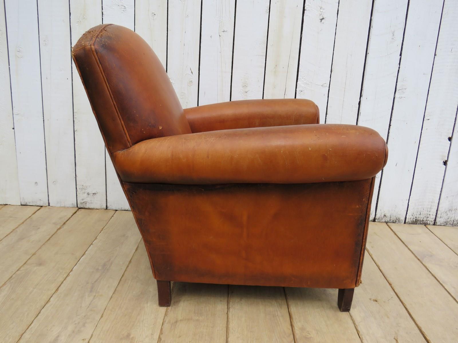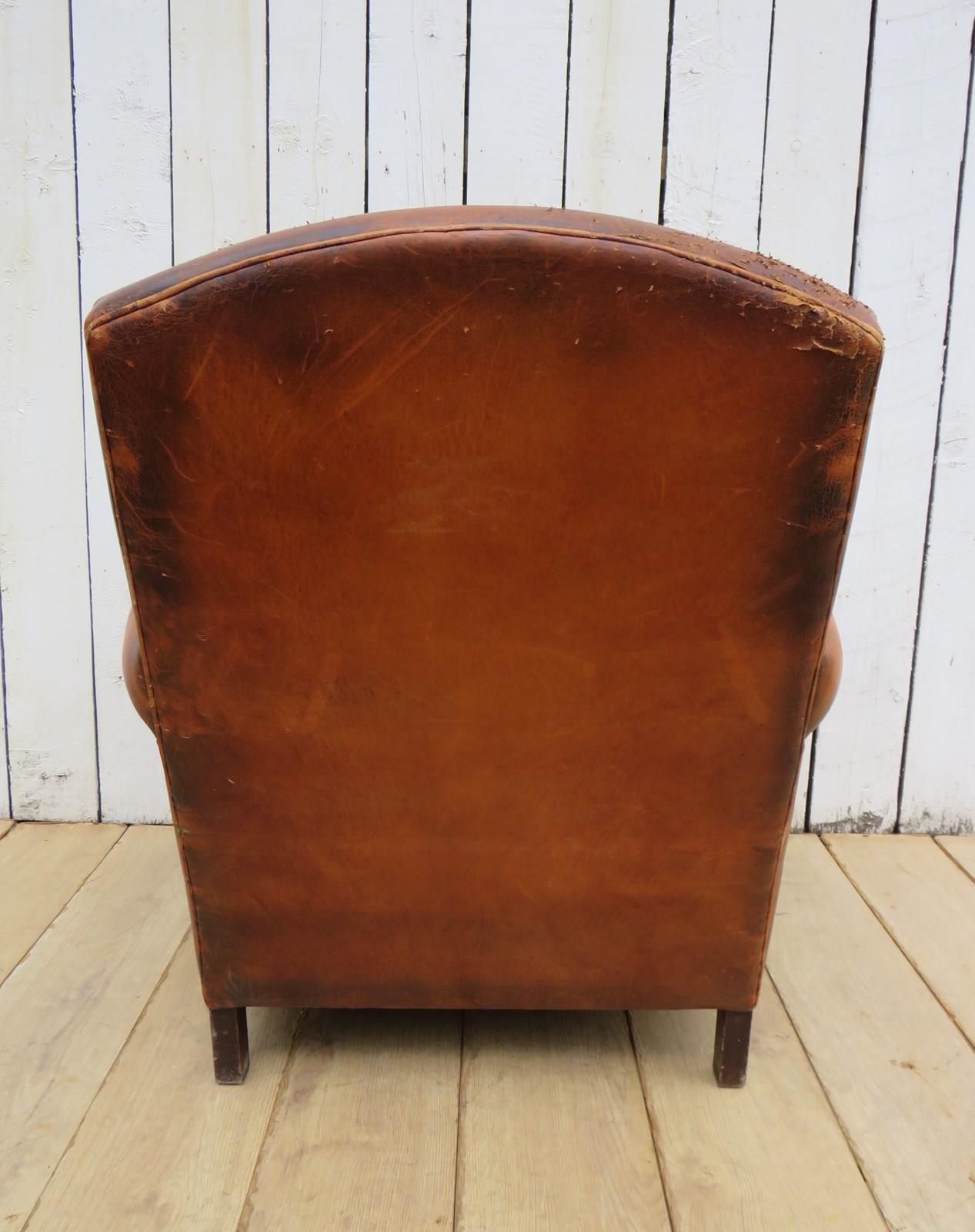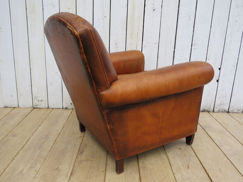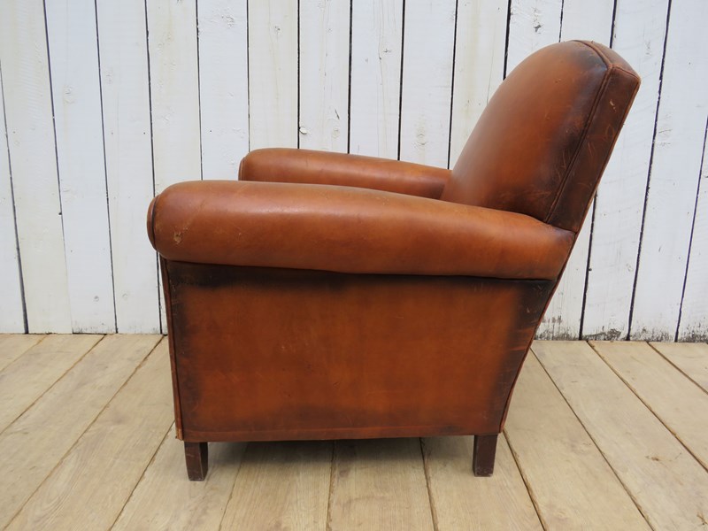 Shapely, sound, sturdy and sprung 1930-40s French leather club armchair. Some age related wear highlighted in images. Seat height 46cm & seat depth 54cm.