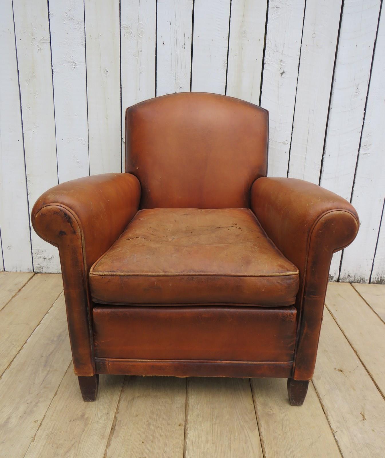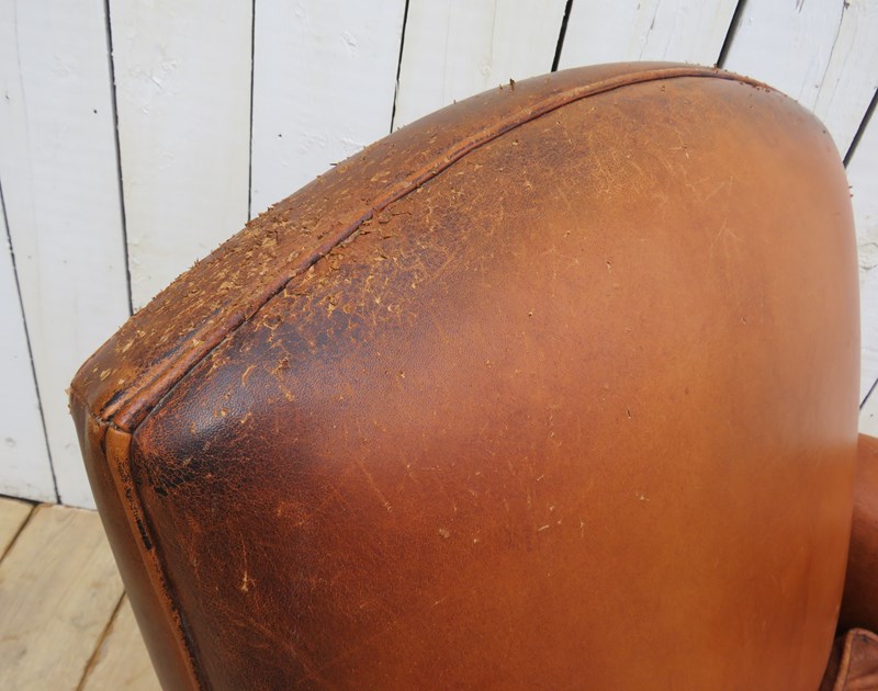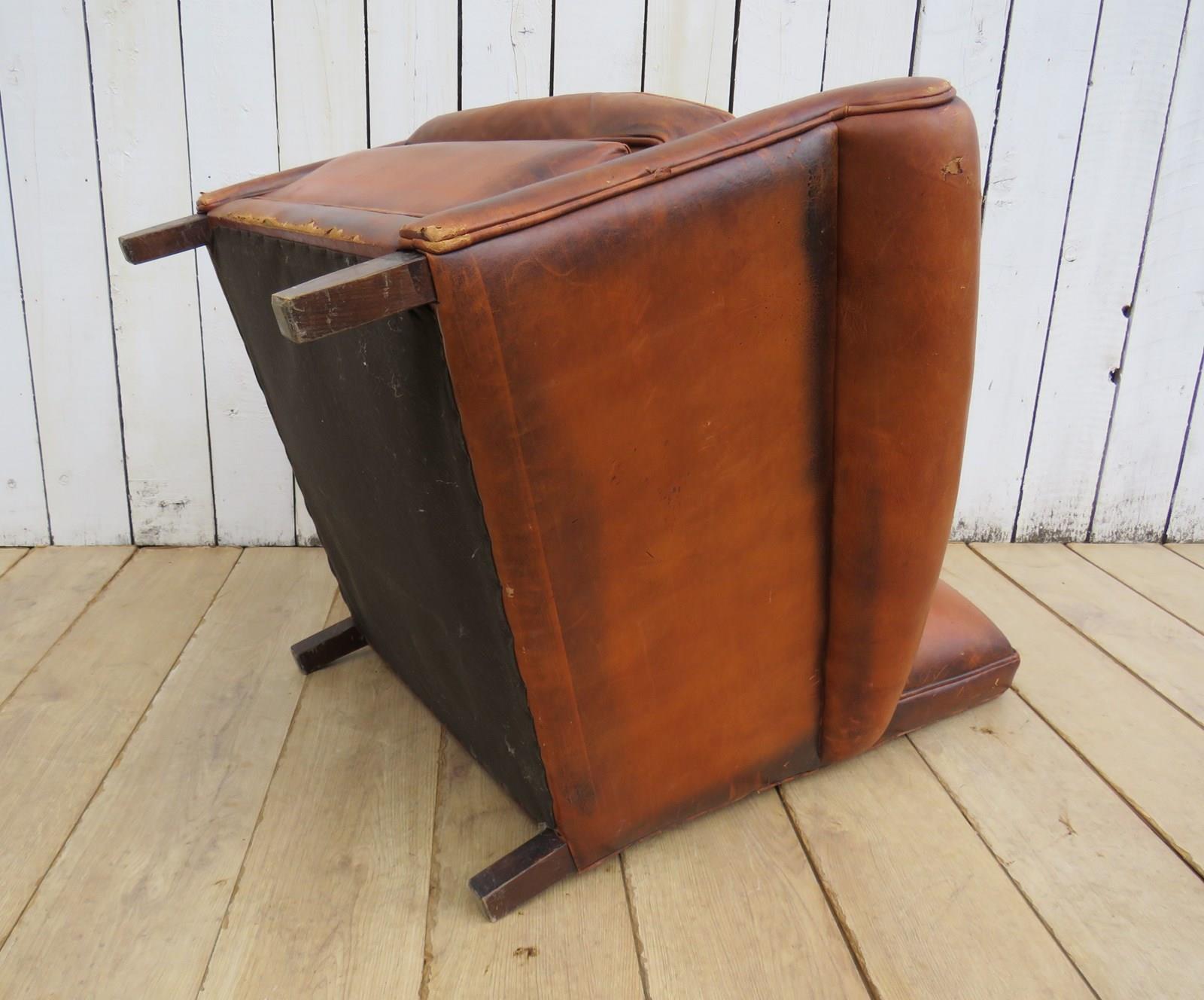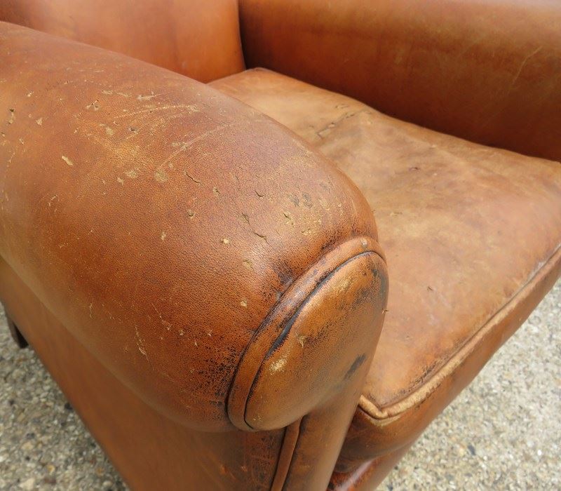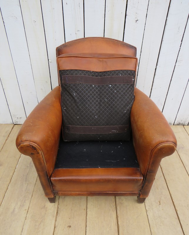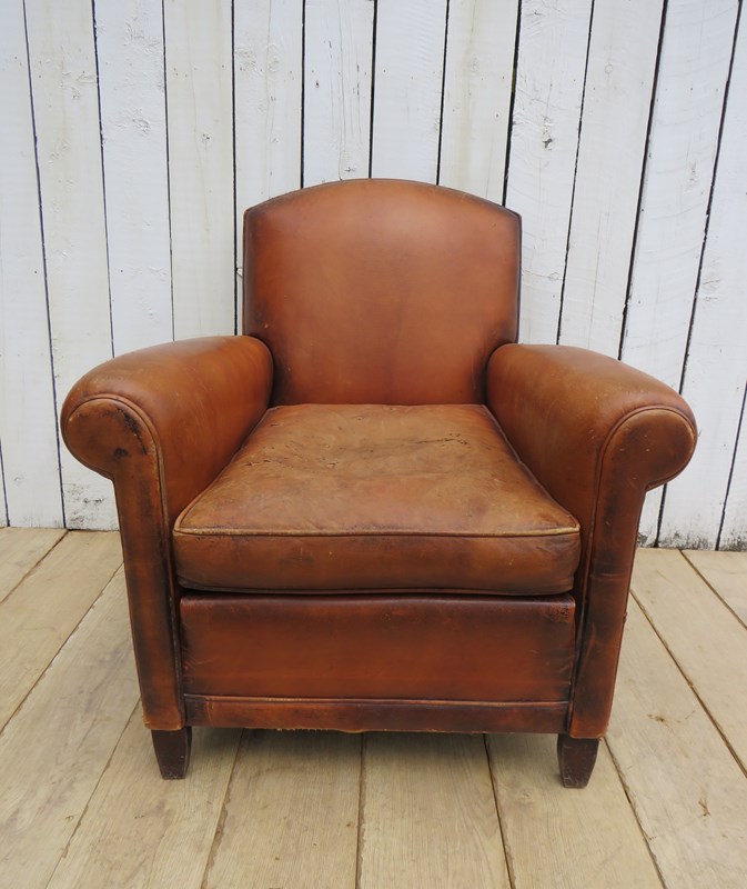 Shapely, sound, sturdy and sprung 1930-40s French leather club armchair. Some age related wear highlighted in images. Seat height 46cm & seat depth 54cm.