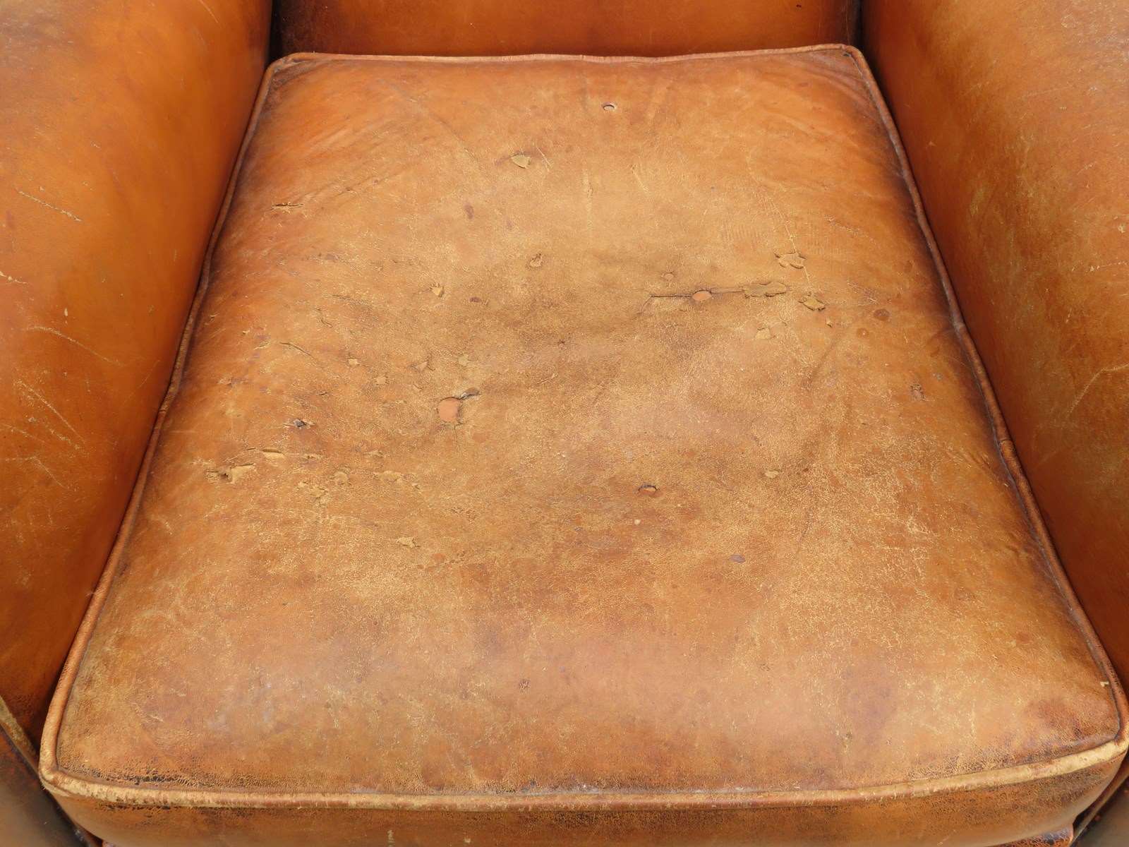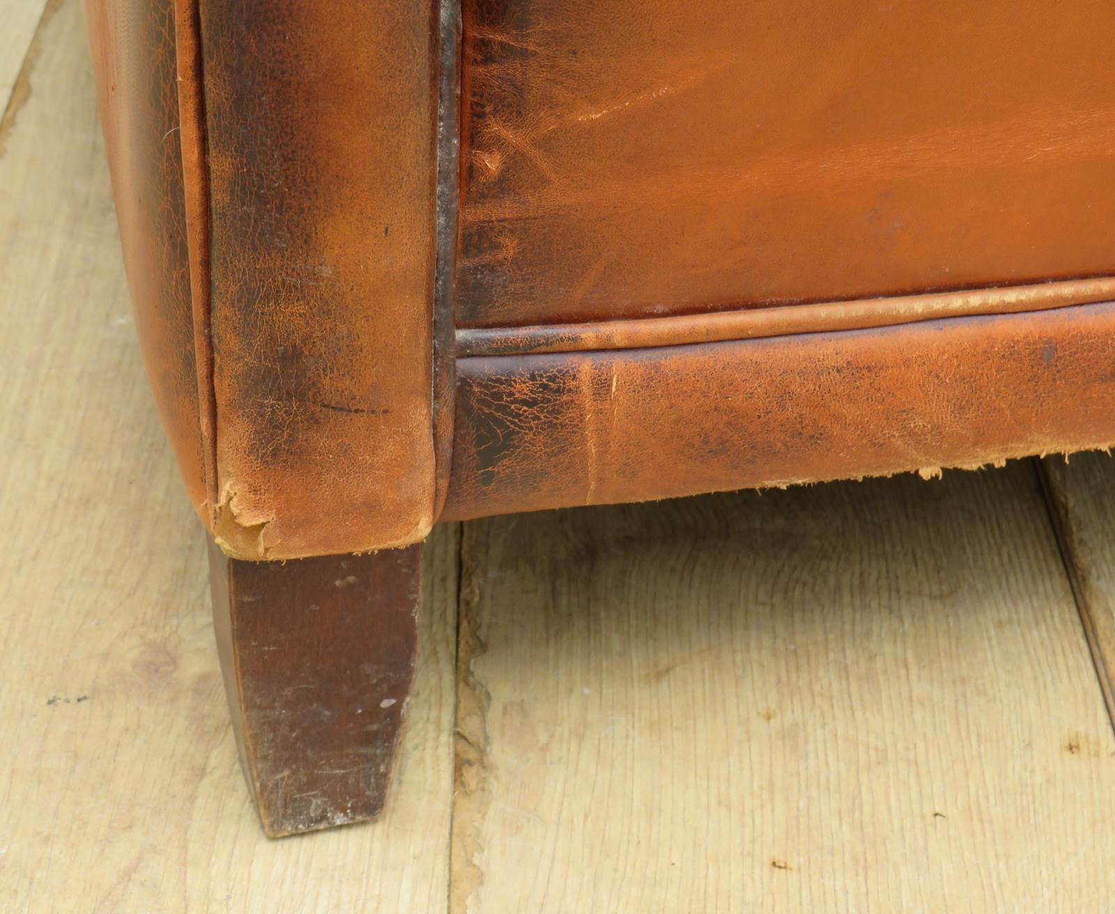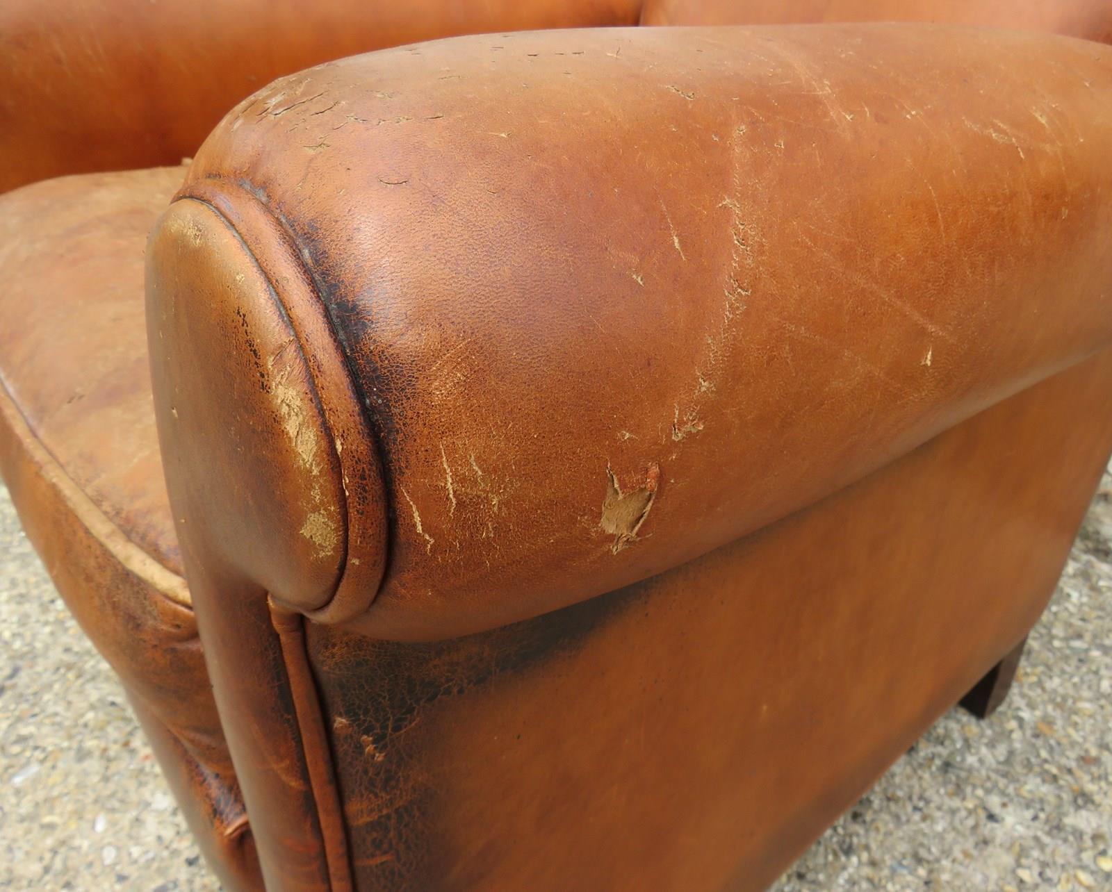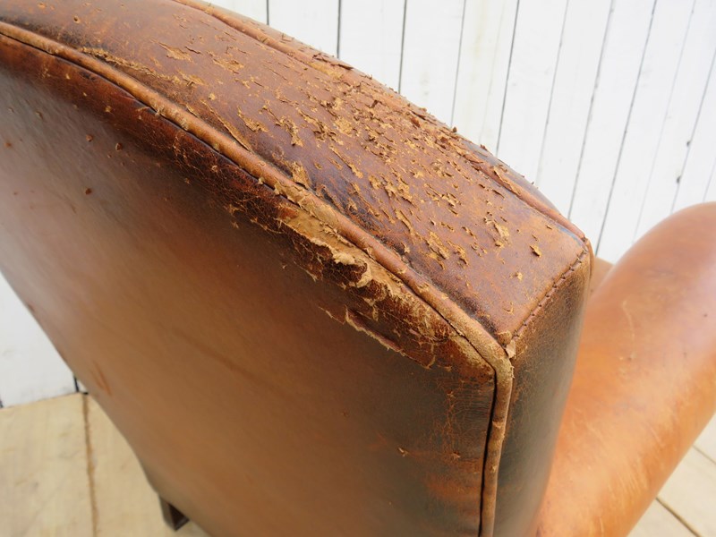 Shapely, sound, sturdy and sprung 1930-40s French leather club armchair. Some age related wear highlighted in images. Seat height 46cm & seat depth 54cm.