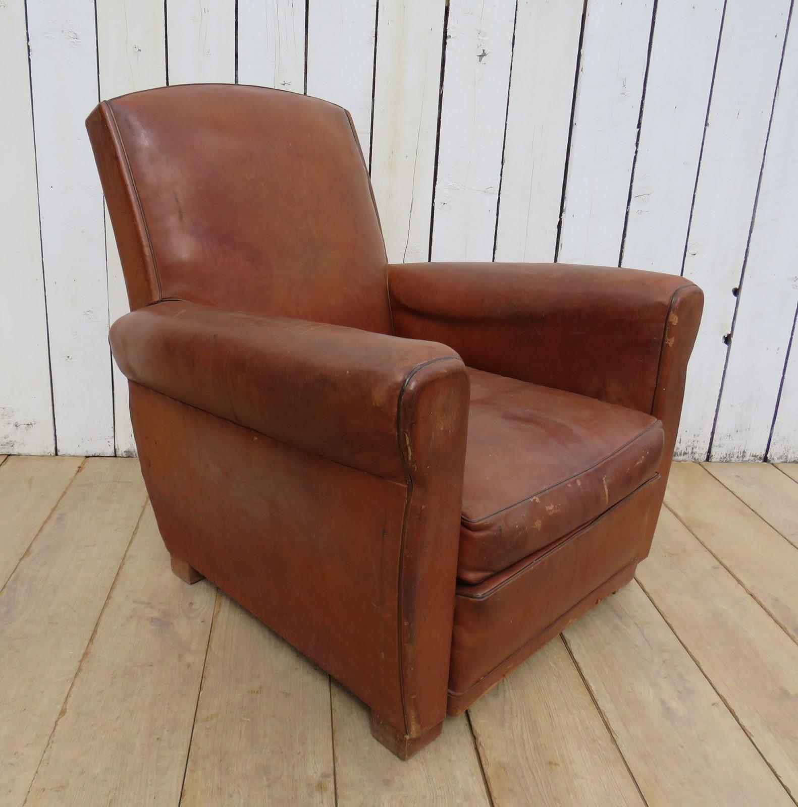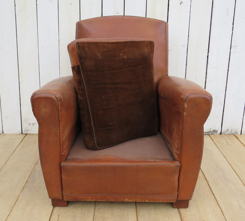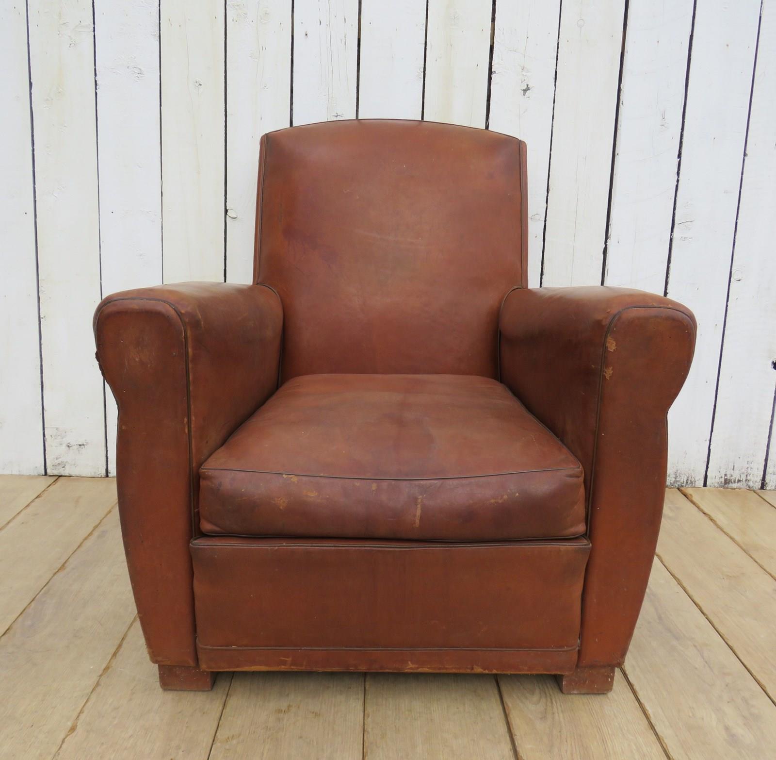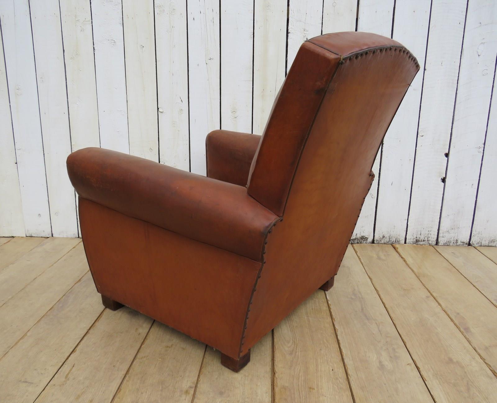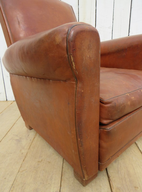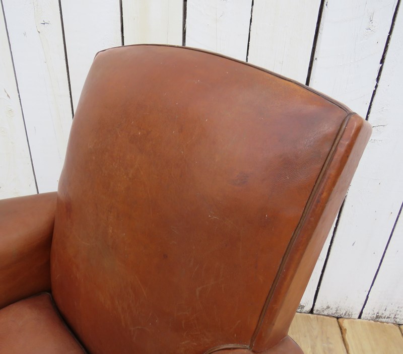 Shapely, sound, sturdy and sprung 1930-40s French leather club armchair retaining original seat cushion. Some historical worm holes and minor age related wear. Seat height 40cm & seat depth 53cm.