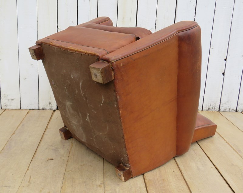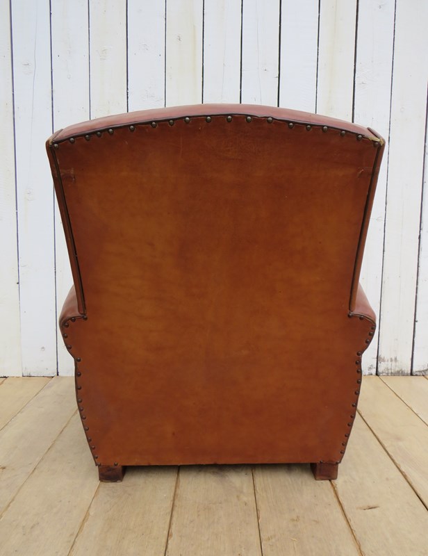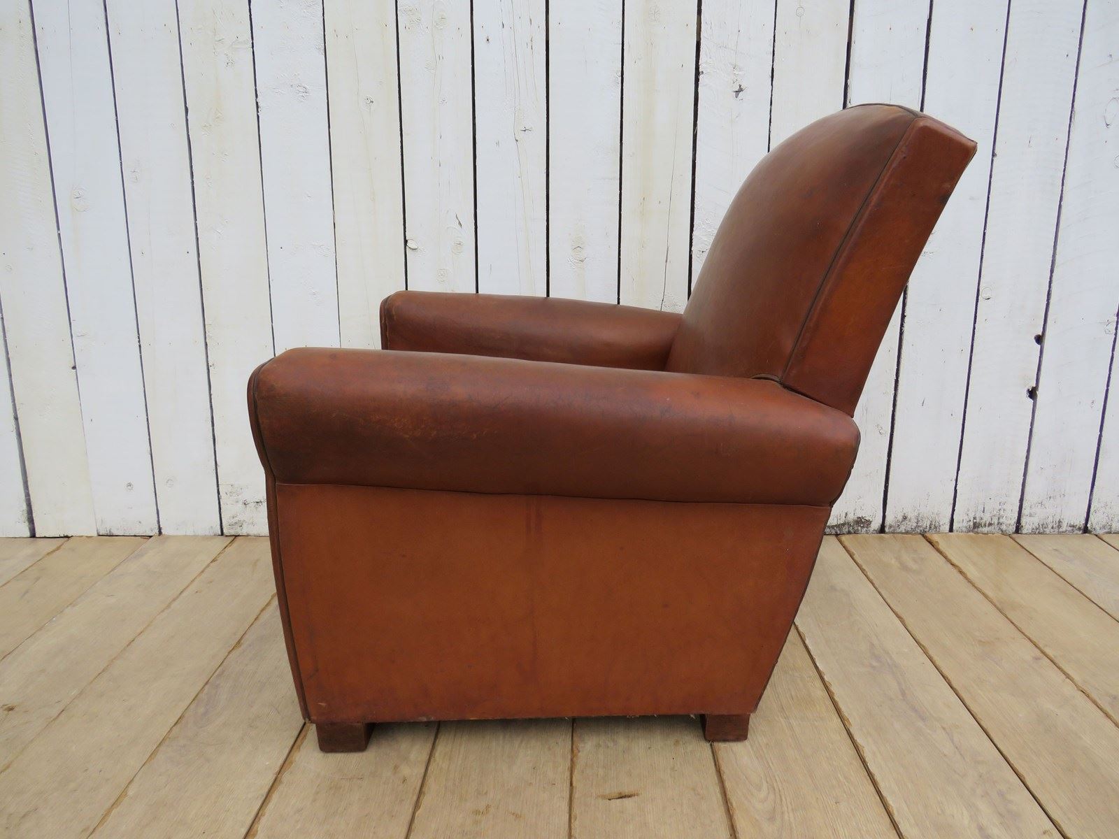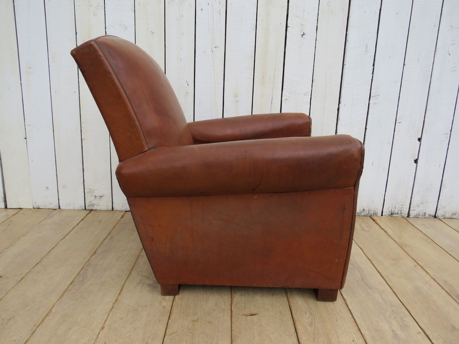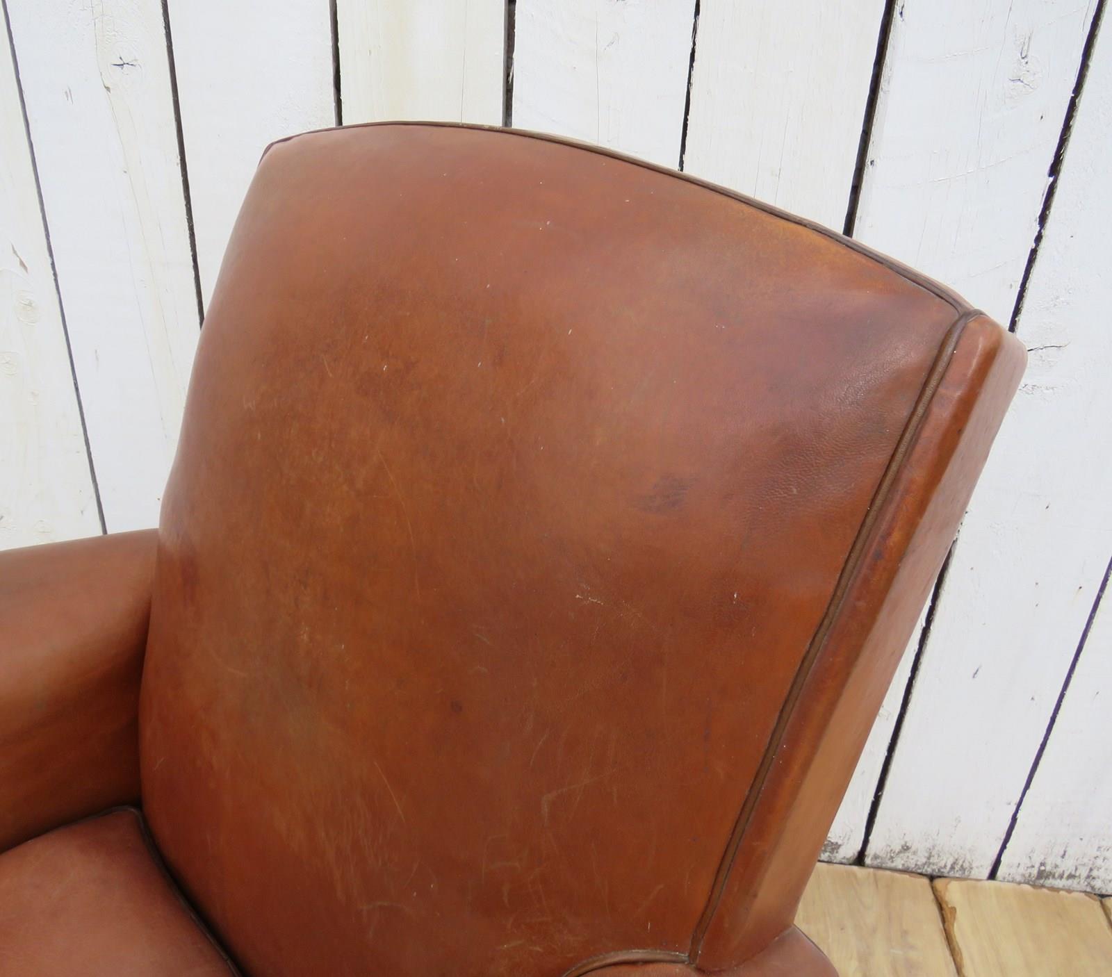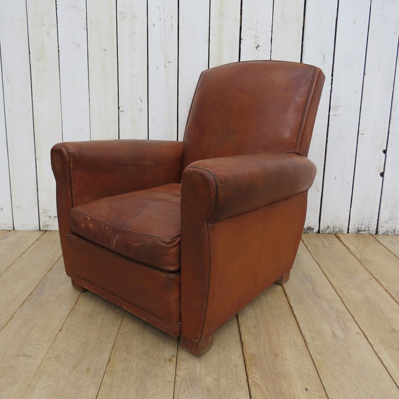 Shapely, sound, sturdy and sprung 1930-40s French leather club armchair retaining original seat cushion. Some historical worm holes and minor age related wear. Seat height 40cm & seat depth 53cm.