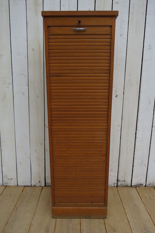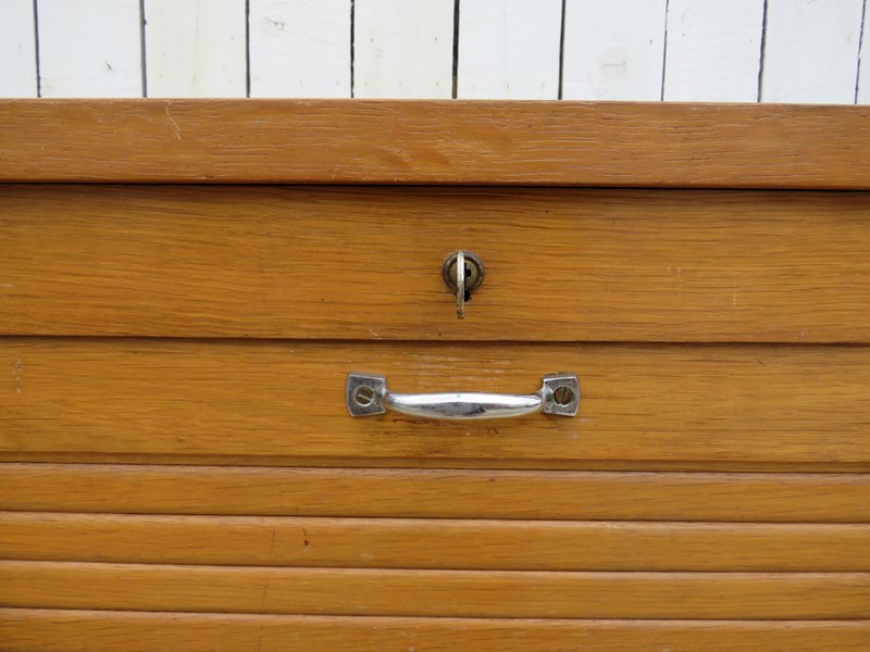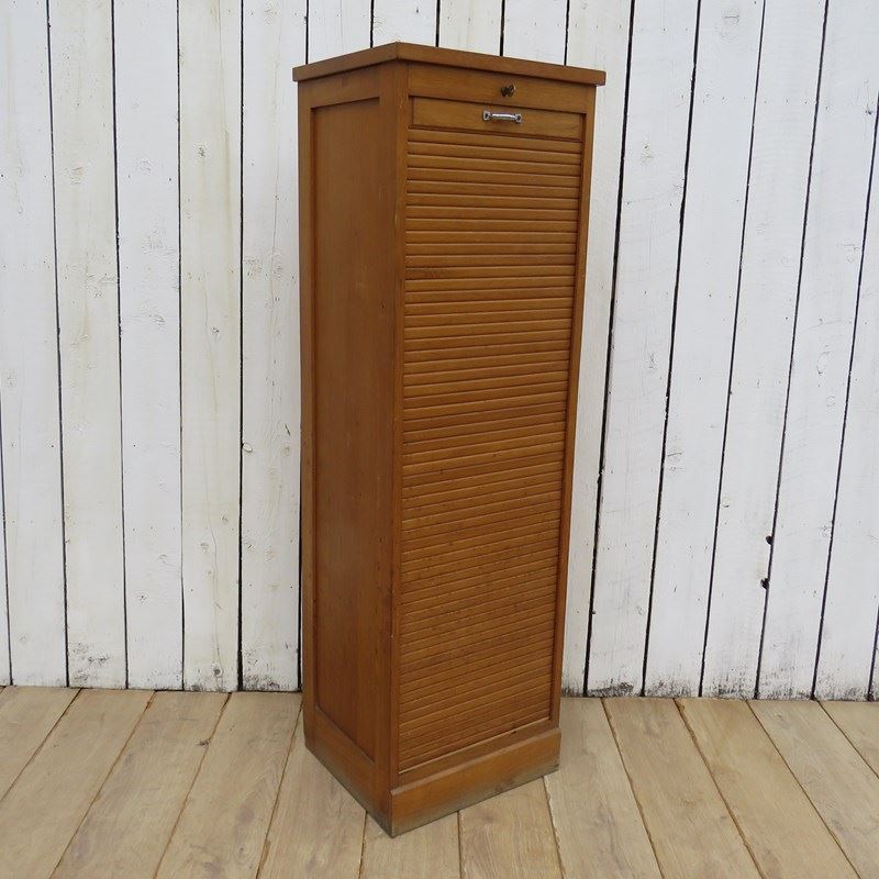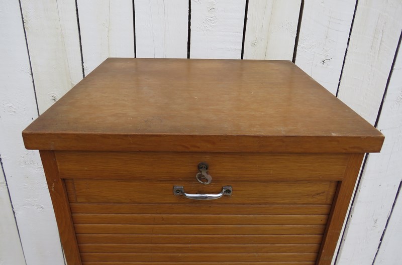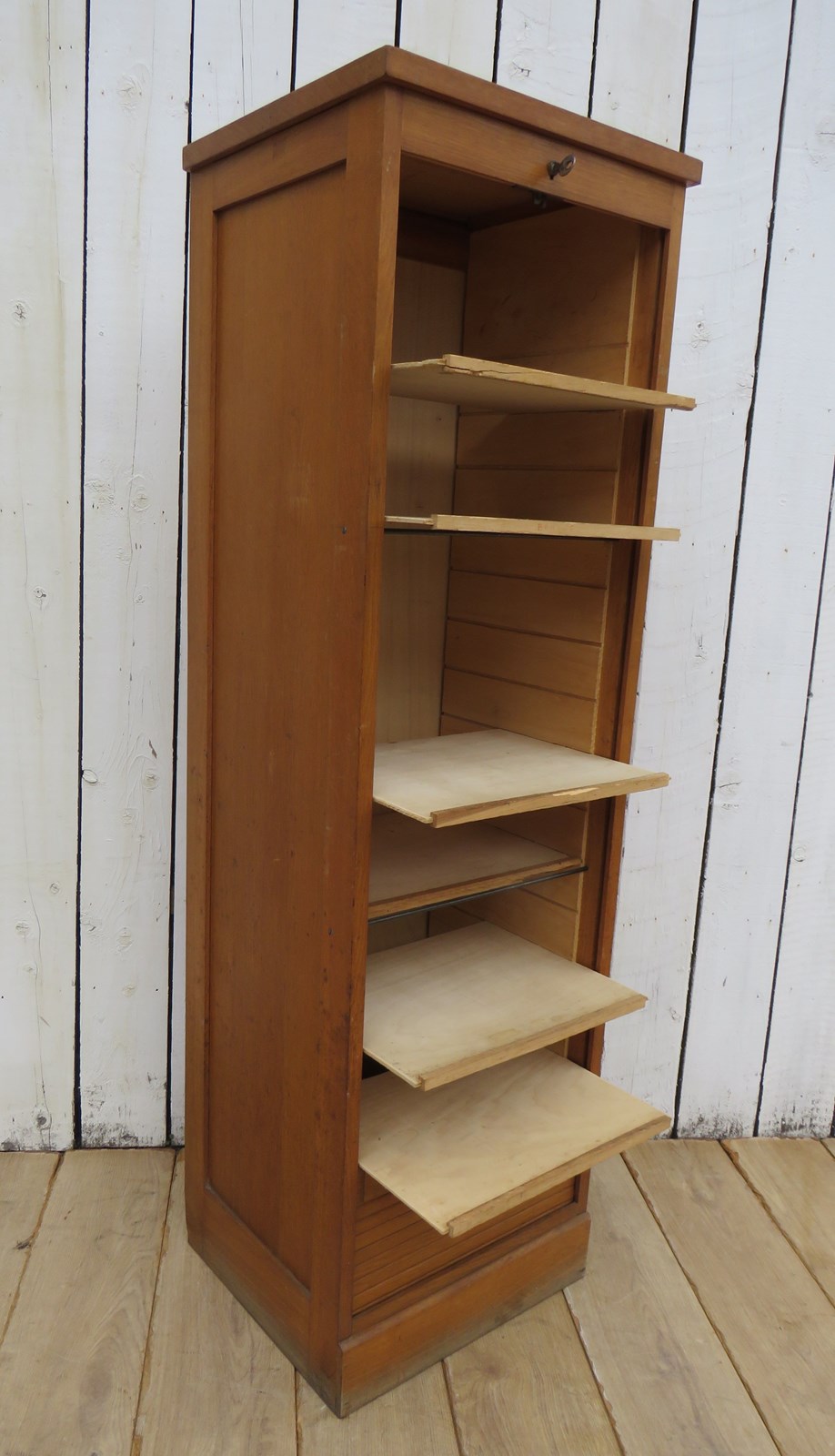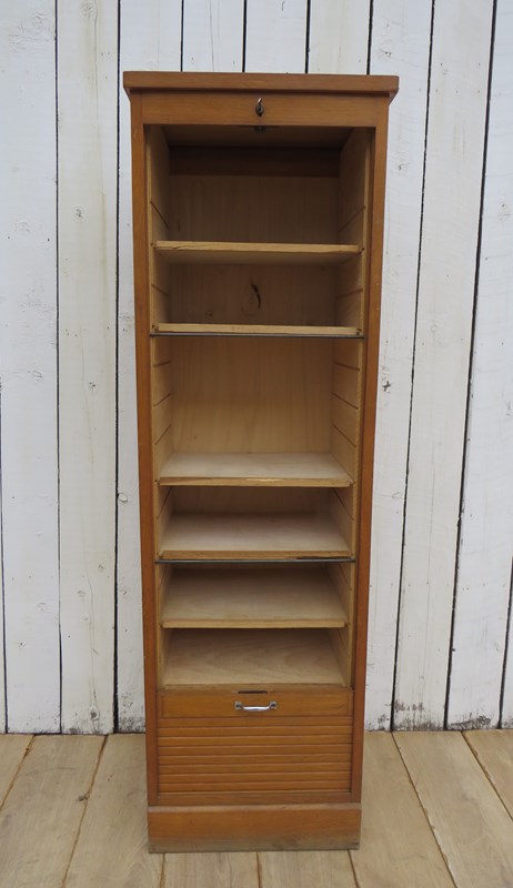 Sound and sturdy mid 20th century French oak industrial filing, haberdashery tambour front cabinet with one fixed and five removable/adjustable shelves, smooth working roller shutter door and working lock and key. Usable interior width 38cm and depth 30cm.