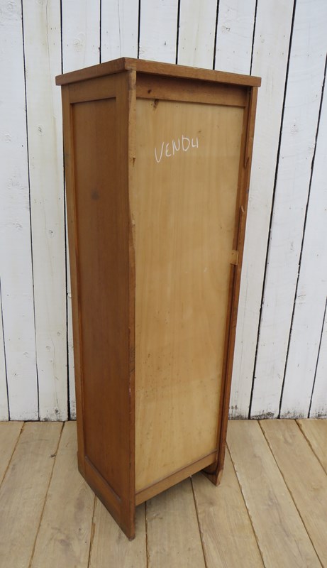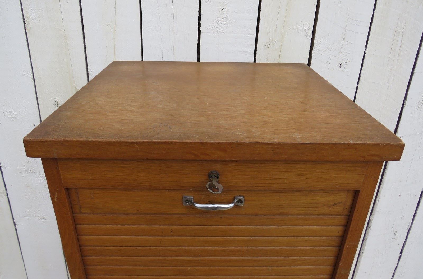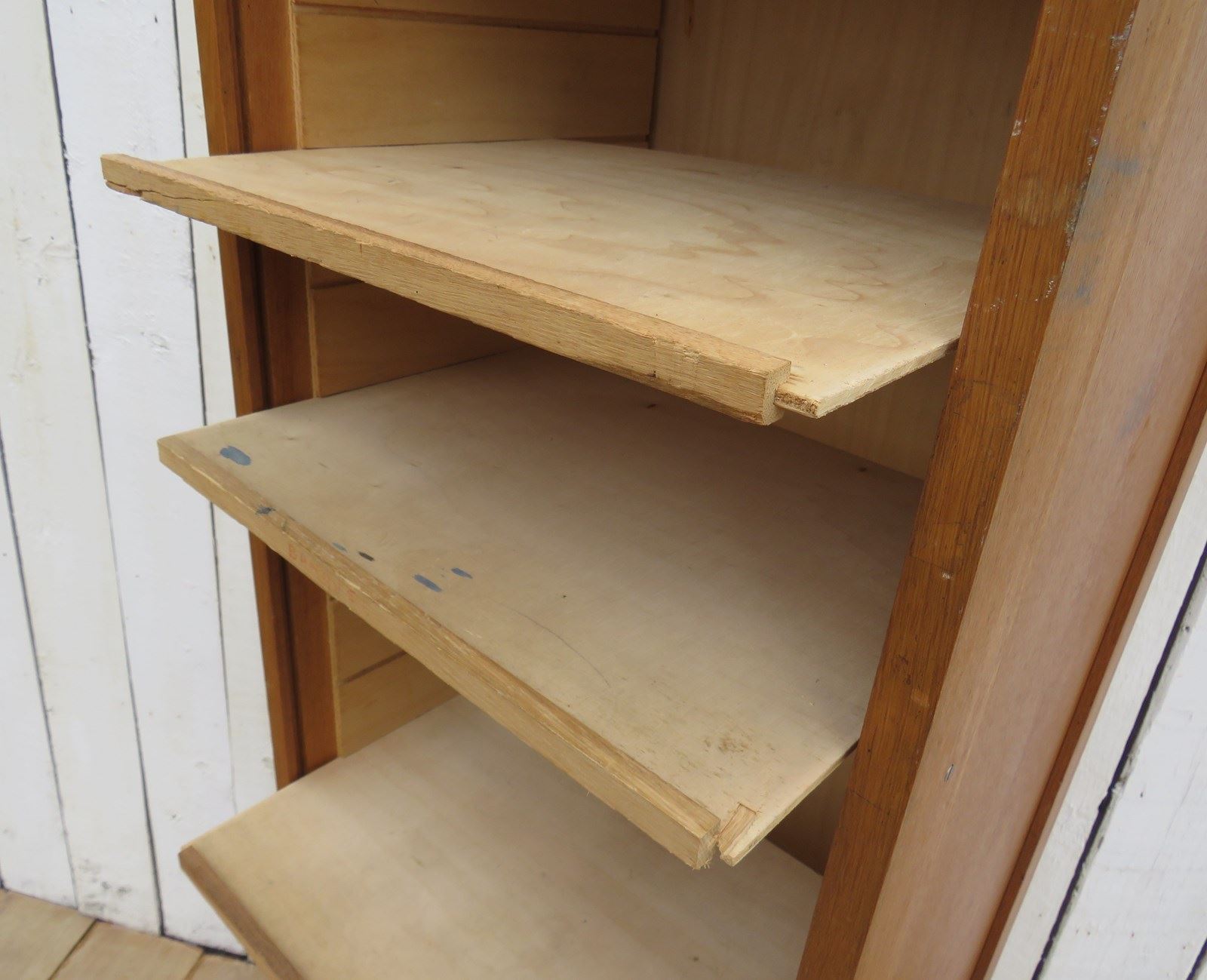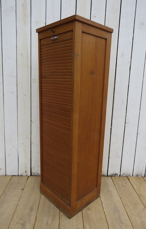 Sound and sturdy mid 20th century French oak industrial filing, haberdashery tambour front cabinet with one fixed and five removable/adjustable shelves, smooth working roller shutter door and working lock and key. Usable interior width 38cm and depth 30cm.