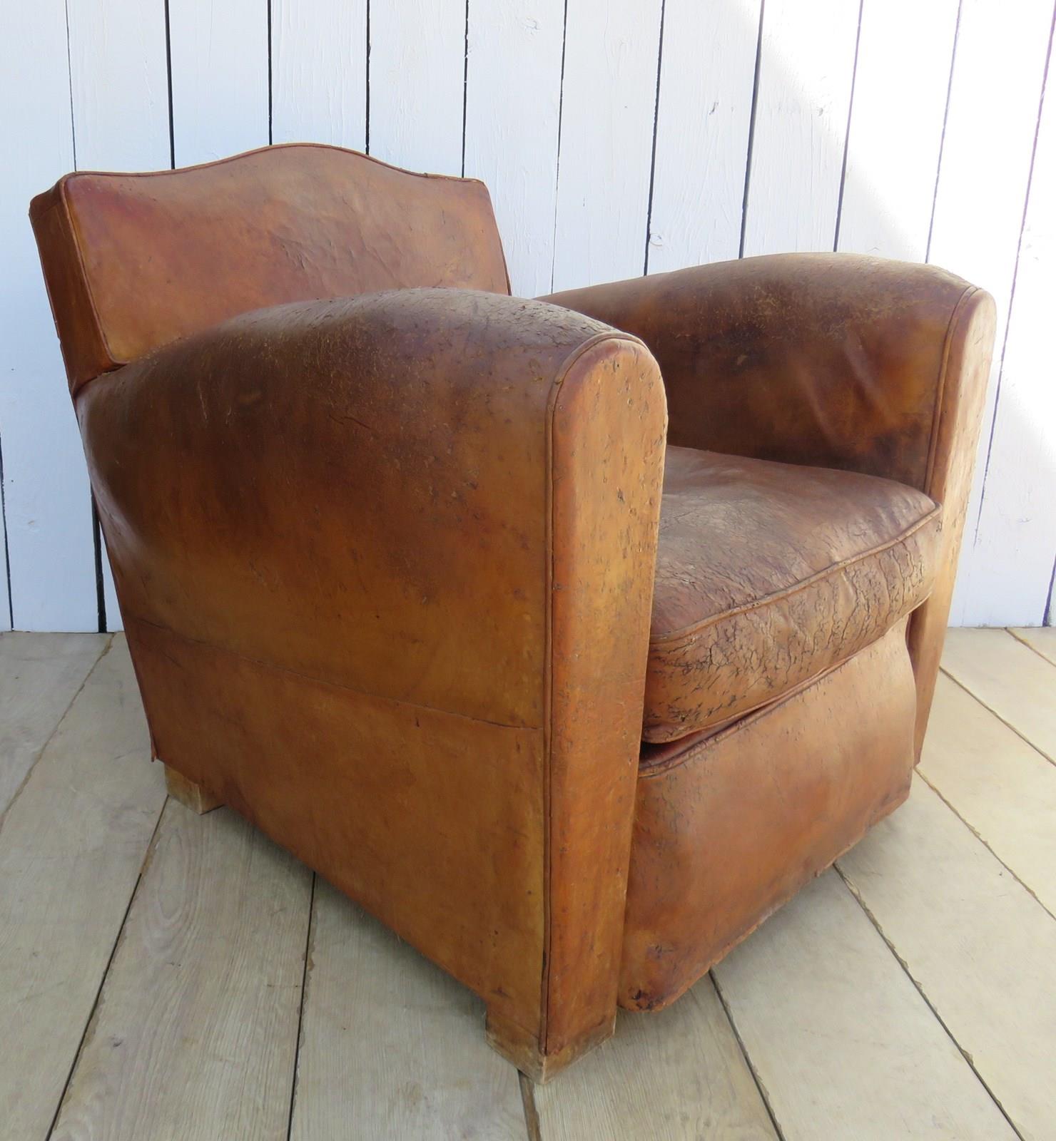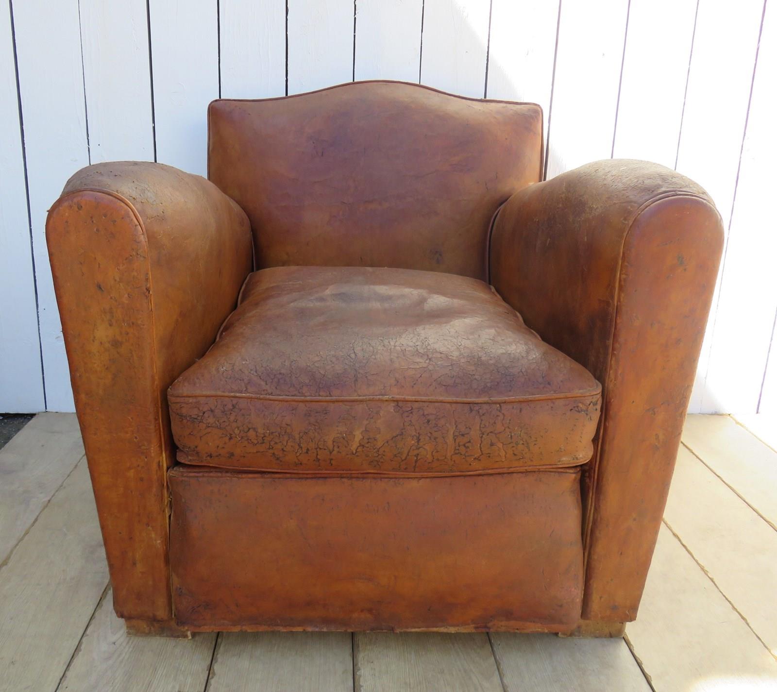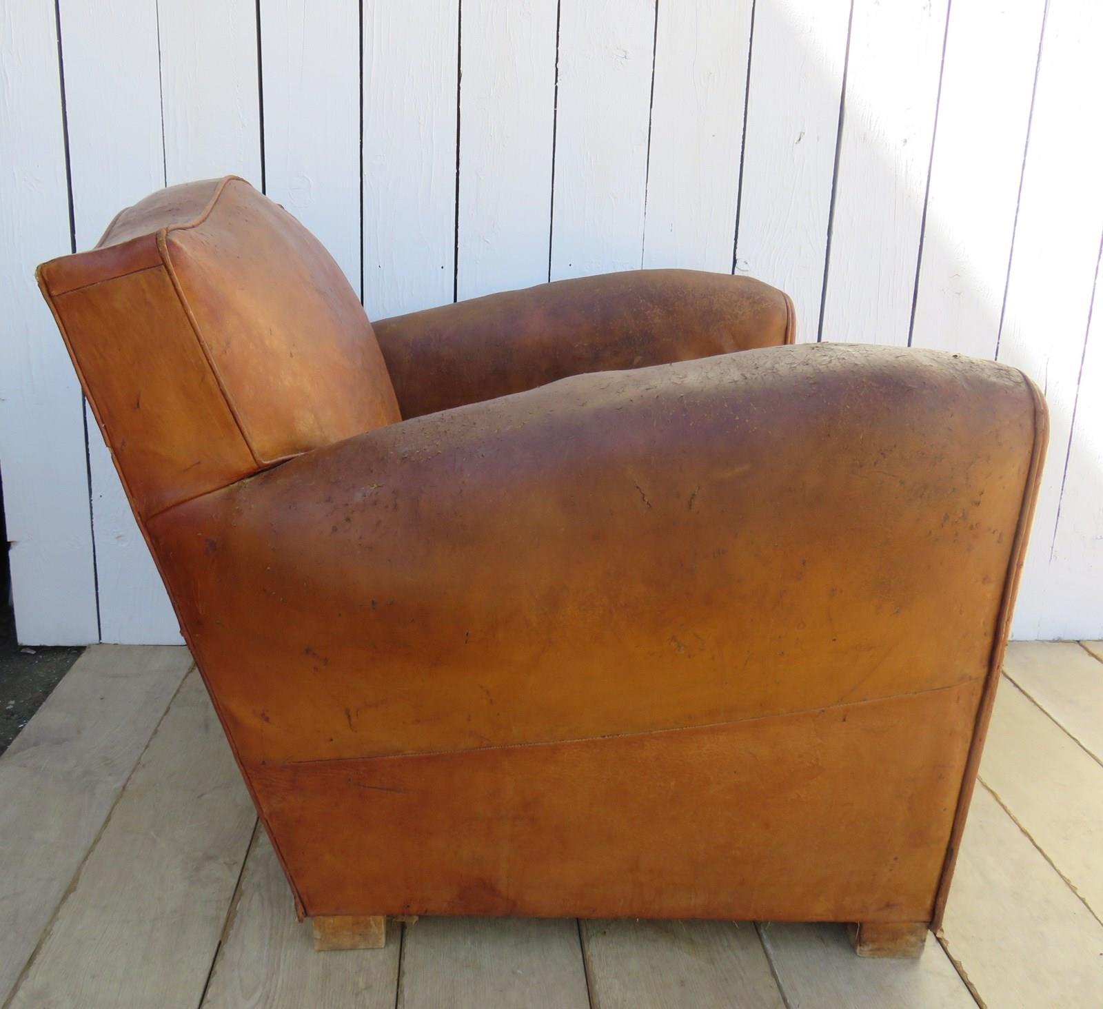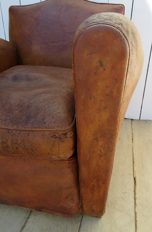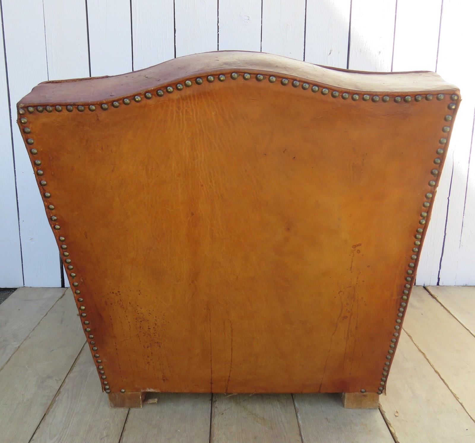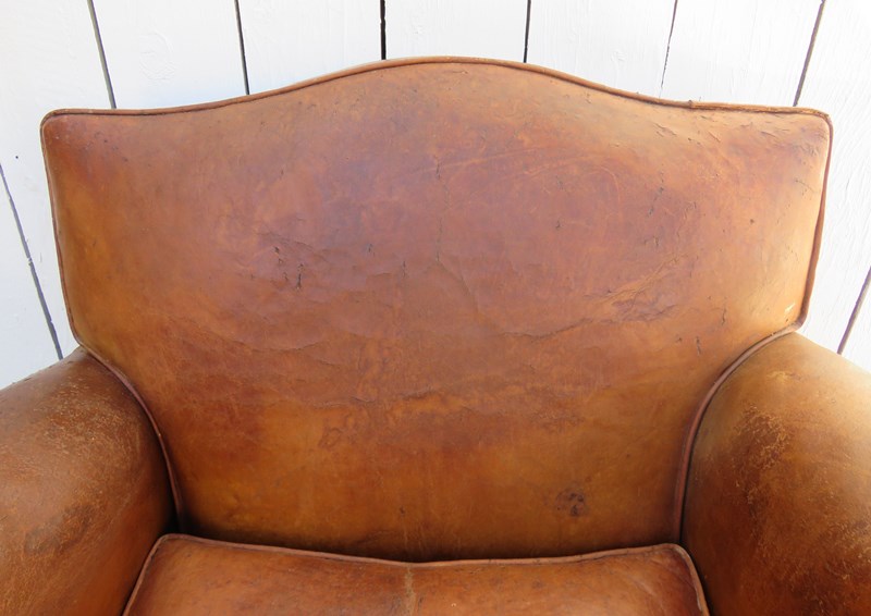 Shapely, sound, sturdy and sprung 1920-30's French moustache back leather club armchair. Age related wear highlighted in images. Seat height 40cm & seat depth 59cm.