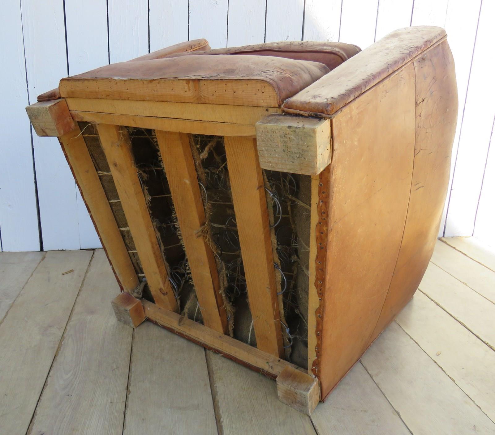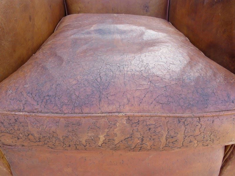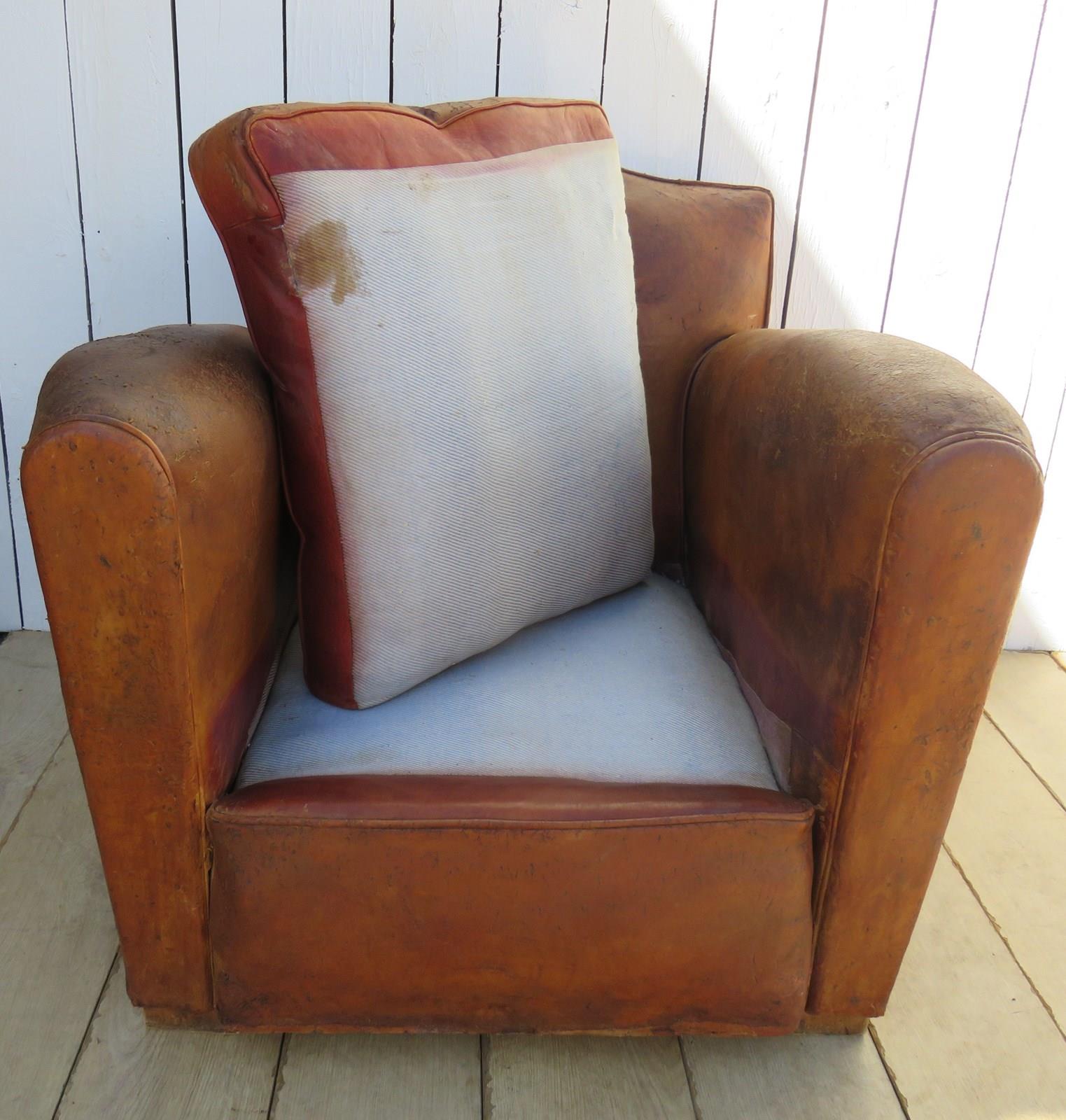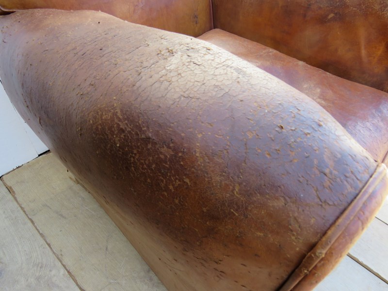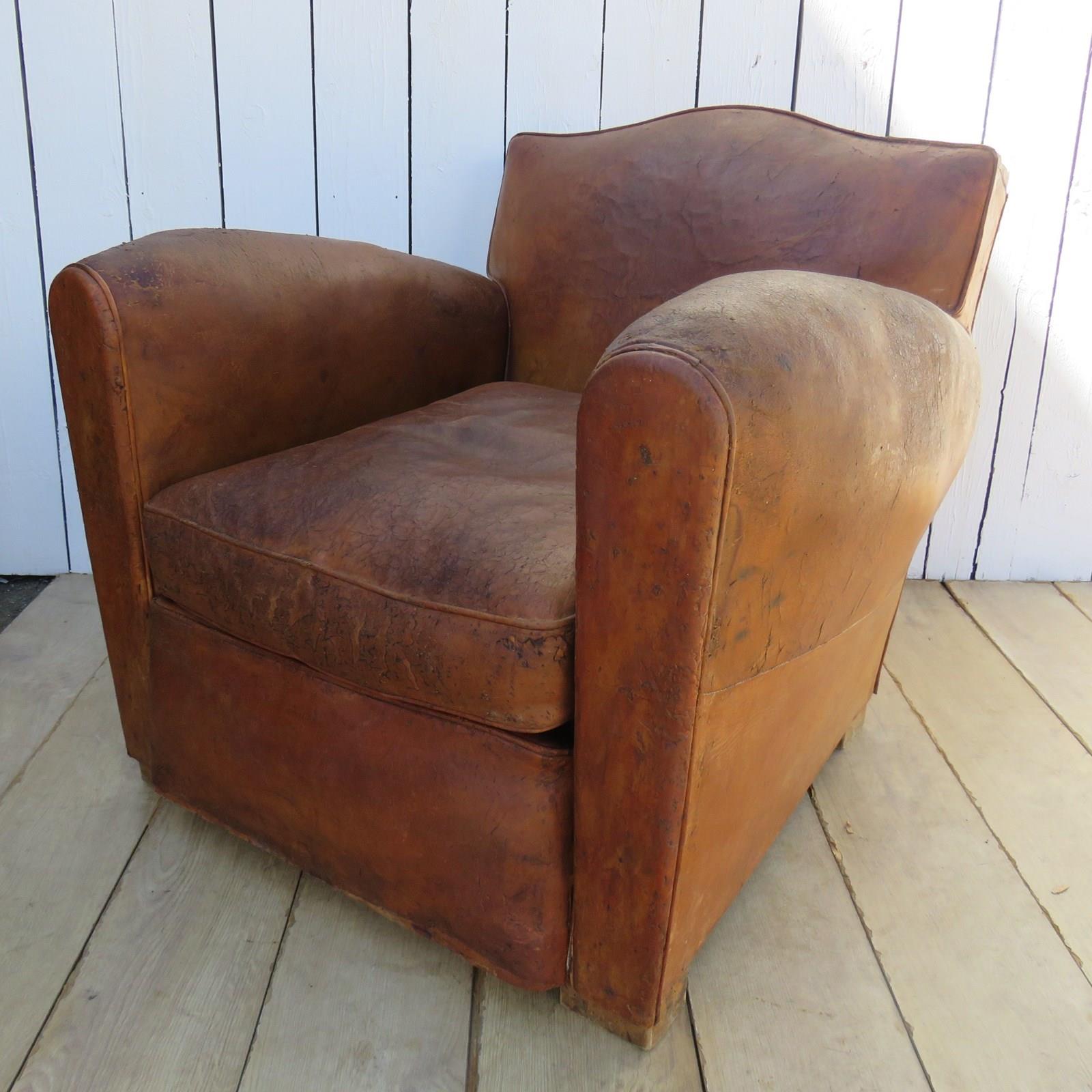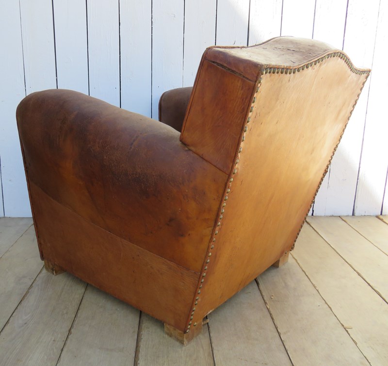 Shapely, sound, sturdy and sprung 1920-30's French moustache back leather club armchair. Age related wear highlighted in images. Seat height 40cm & seat depth 59cm.