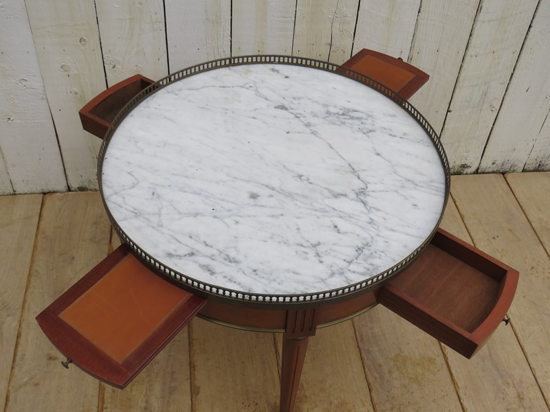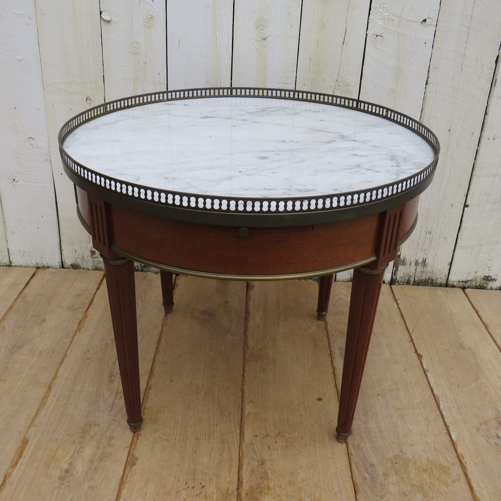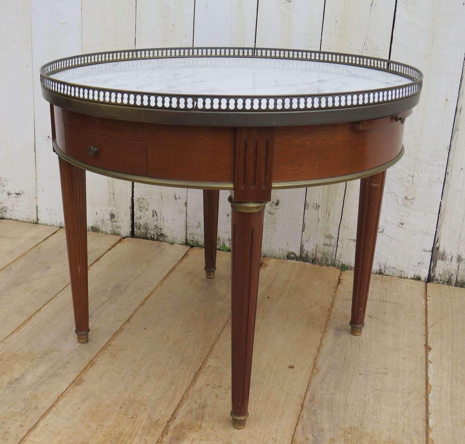 Shapely, sound and sturdy mid 20th century French marble top and mahogany games, coffee, lamp, wine, side table with two drawers, two candle slides and pierced brass top gallery.