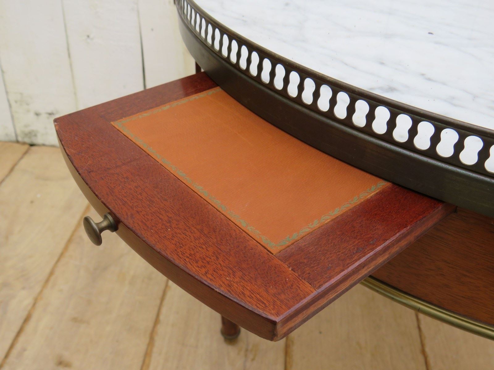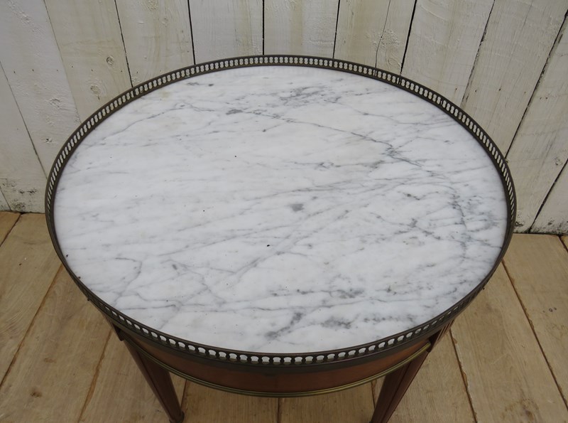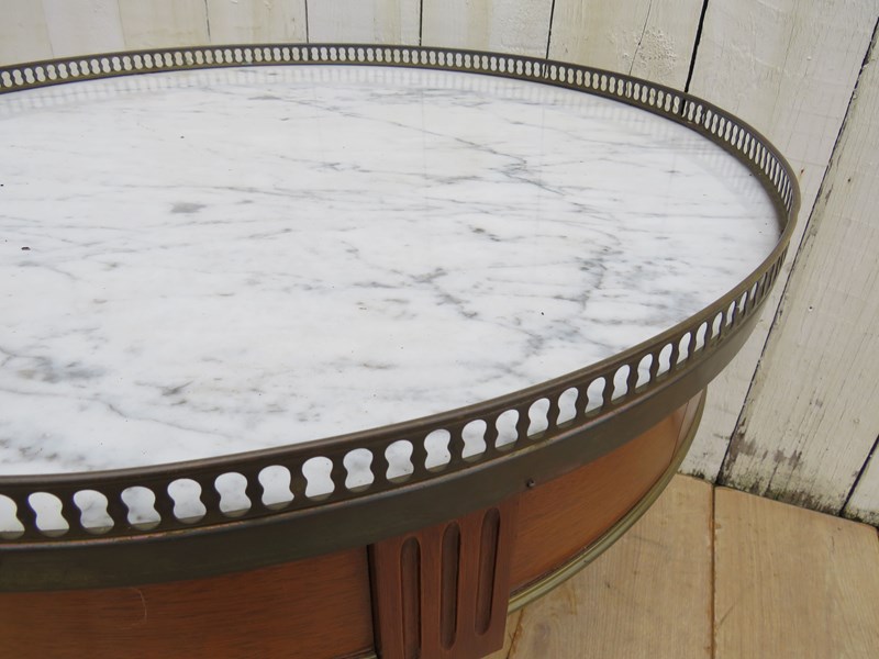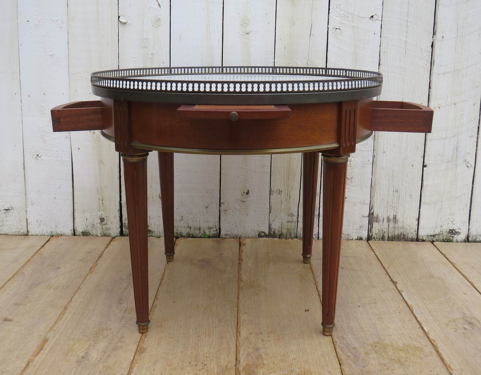 Shapely, sound and sturdy mid 20th century French marble top and mahogany games, coffee, lamp, wine, side table with two drawers, two candle slides and pierced brass top gallery.
