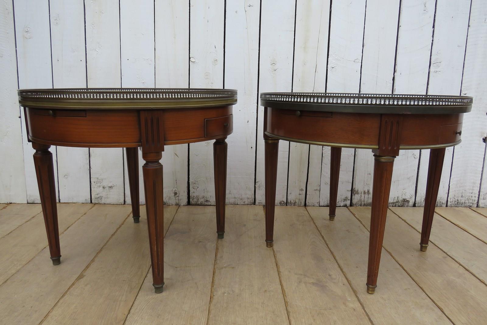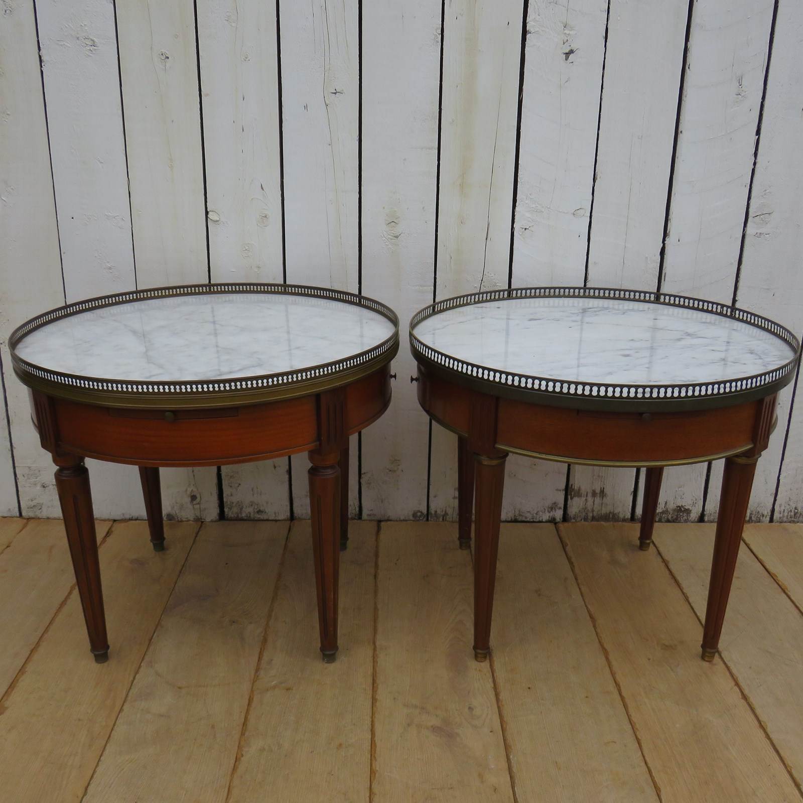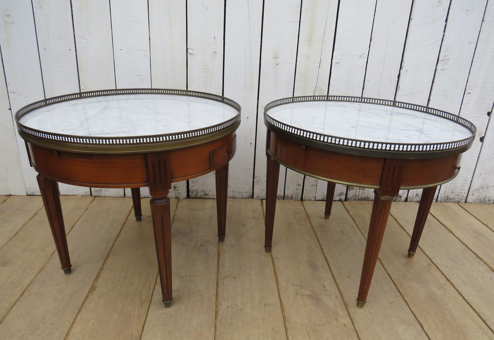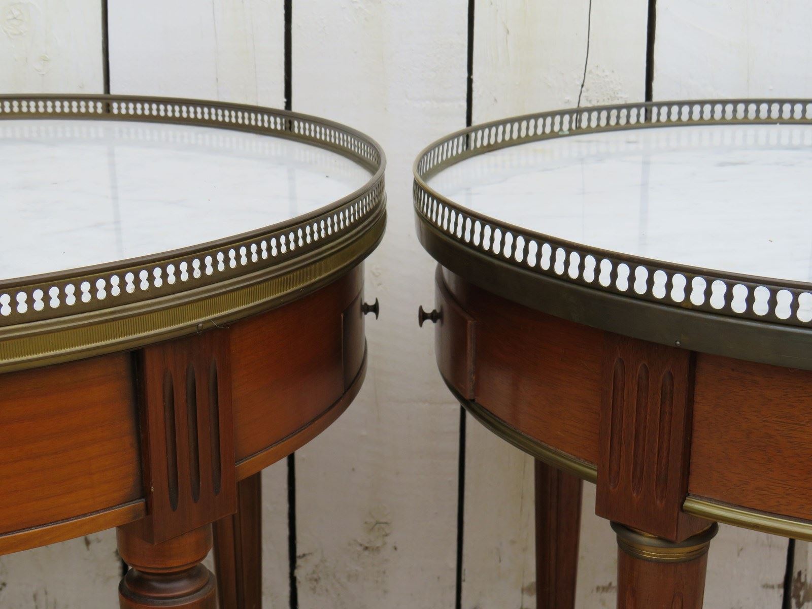 Very near pair of shapely, sound and sturdy mid 20th century French marble top and walnut, two drawer, two candle slides, games, side, coffee, lamp, wine tables with pierced brass top gallery.
