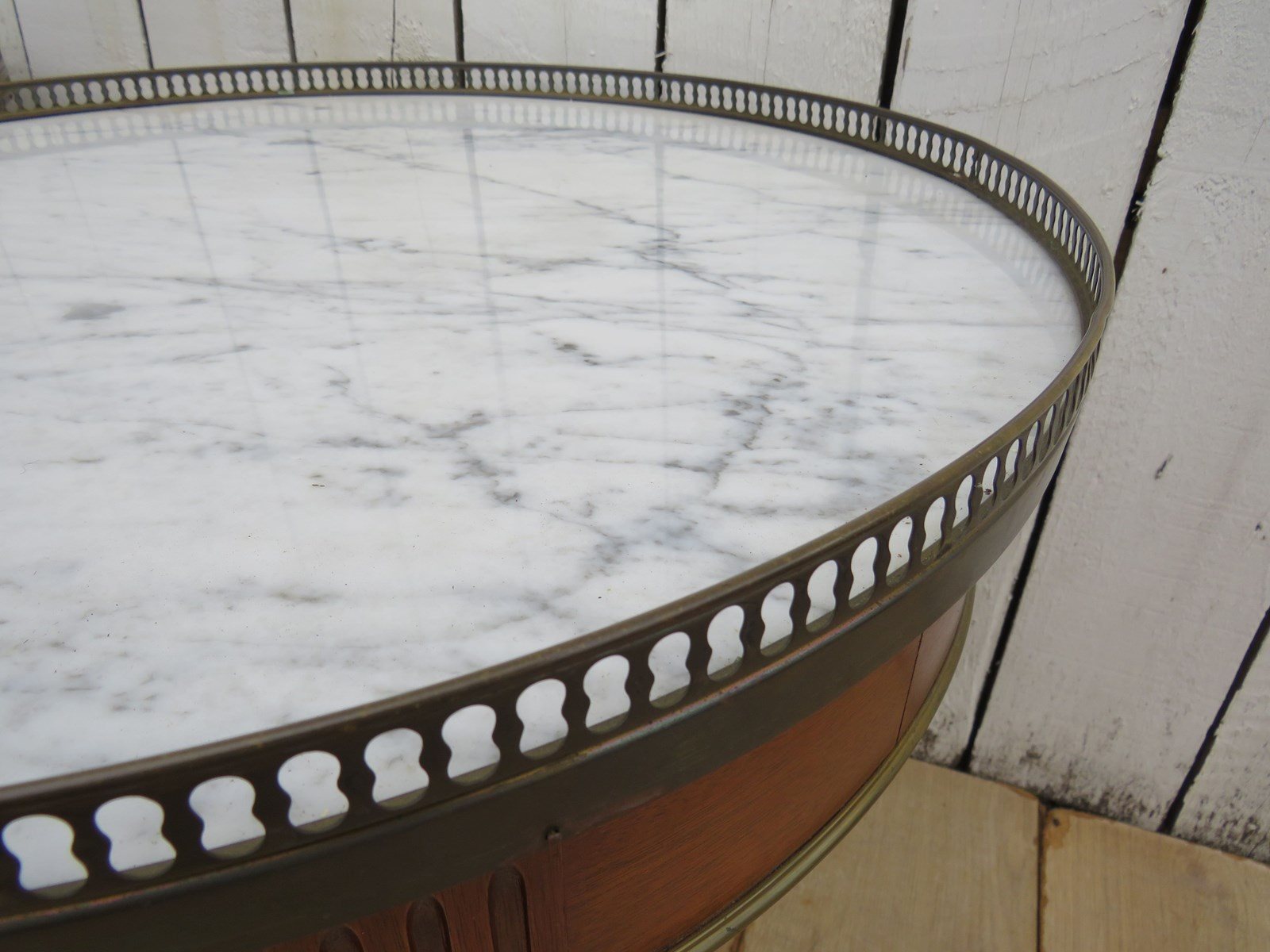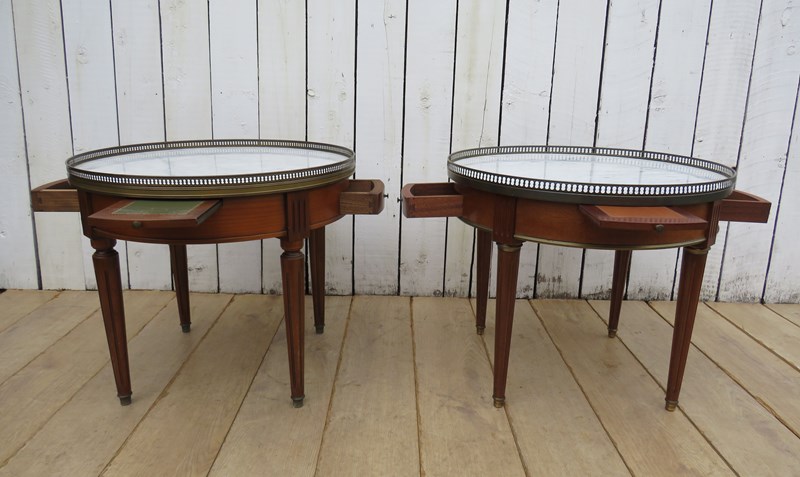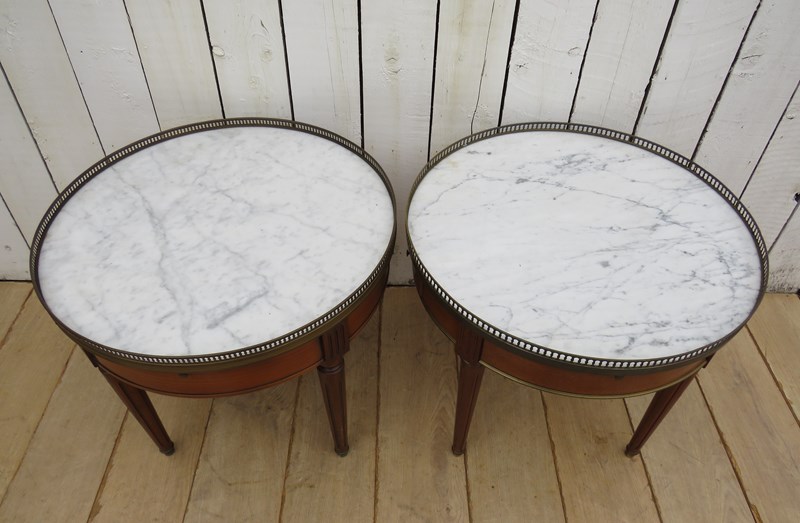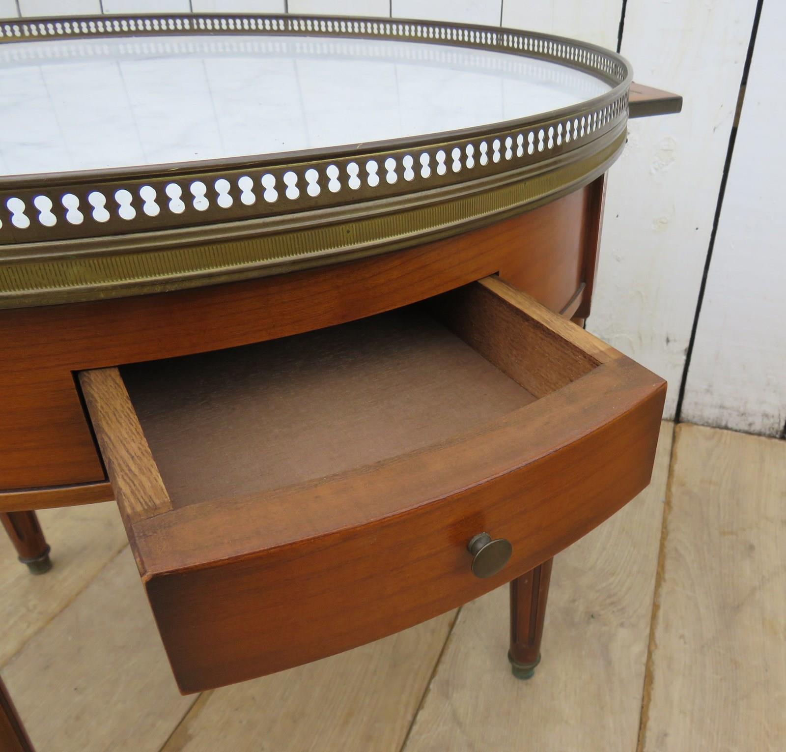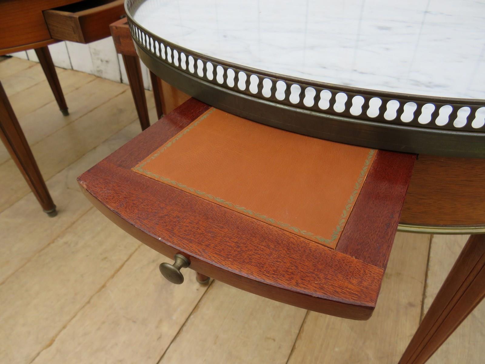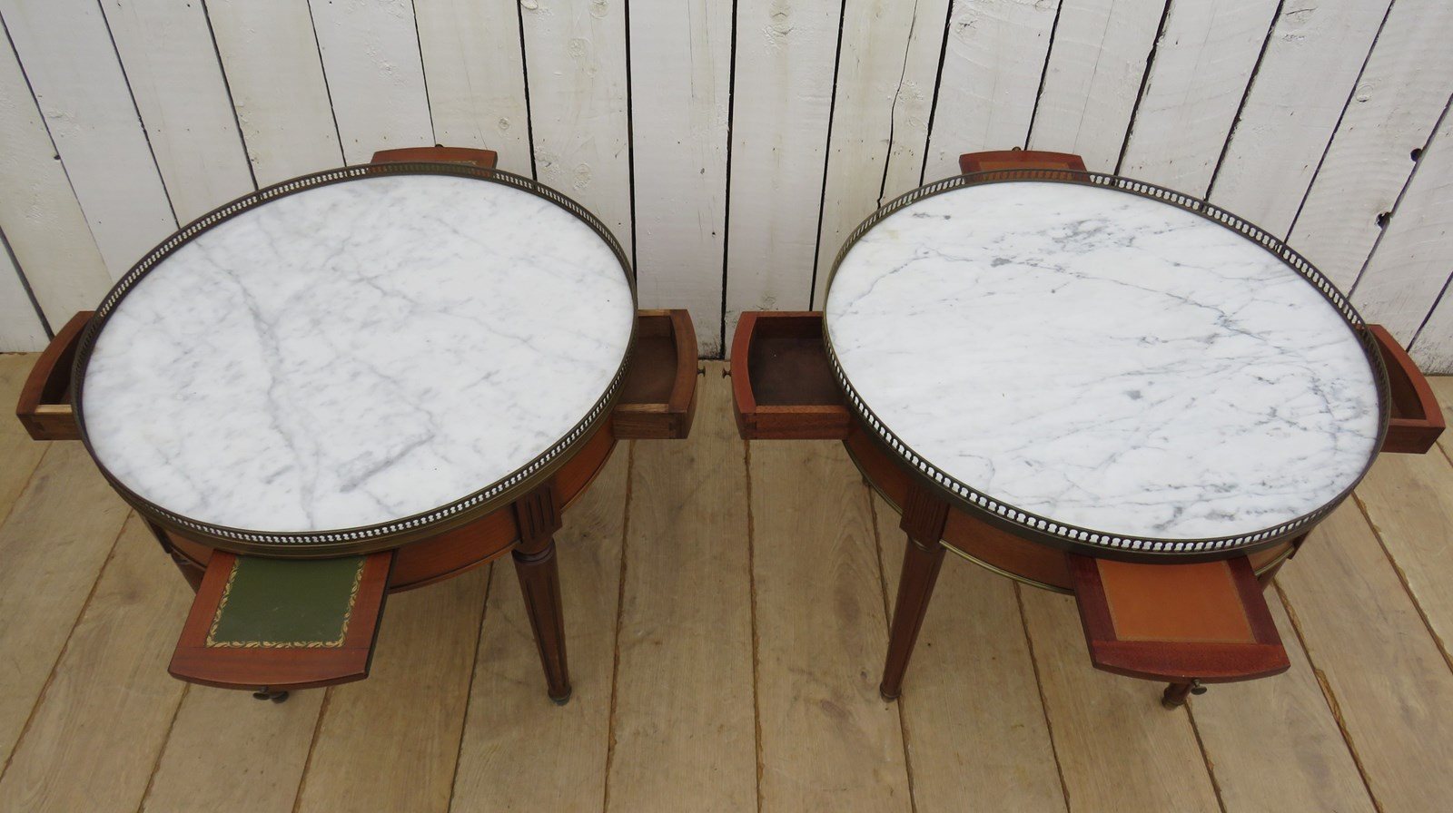 Very near pair of shapely, sound and sturdy mid 20th century French marble top and walnut, two drawer, two candle slides, games, side, coffee, lamp, wine tables with pierced brass top gallery.