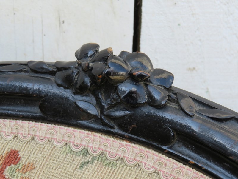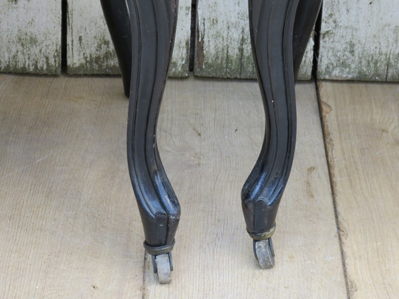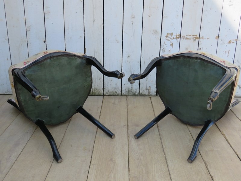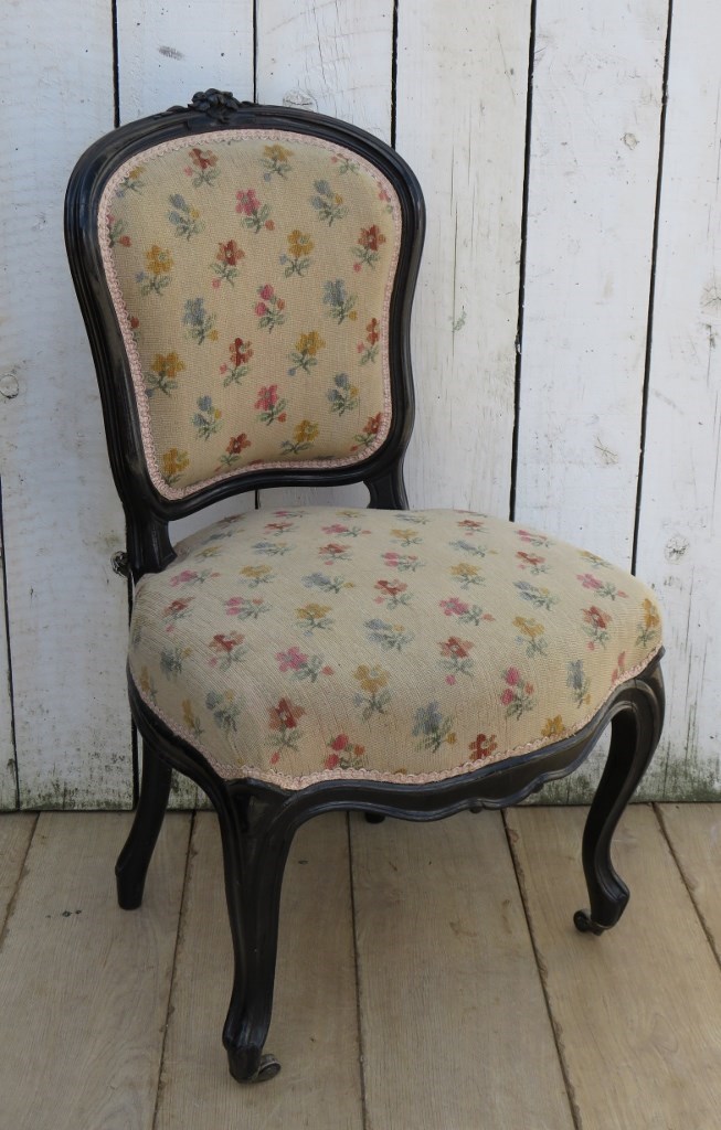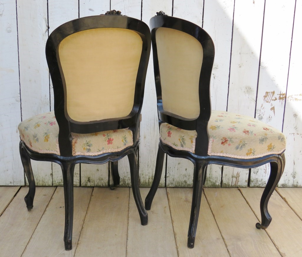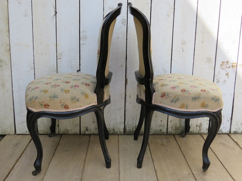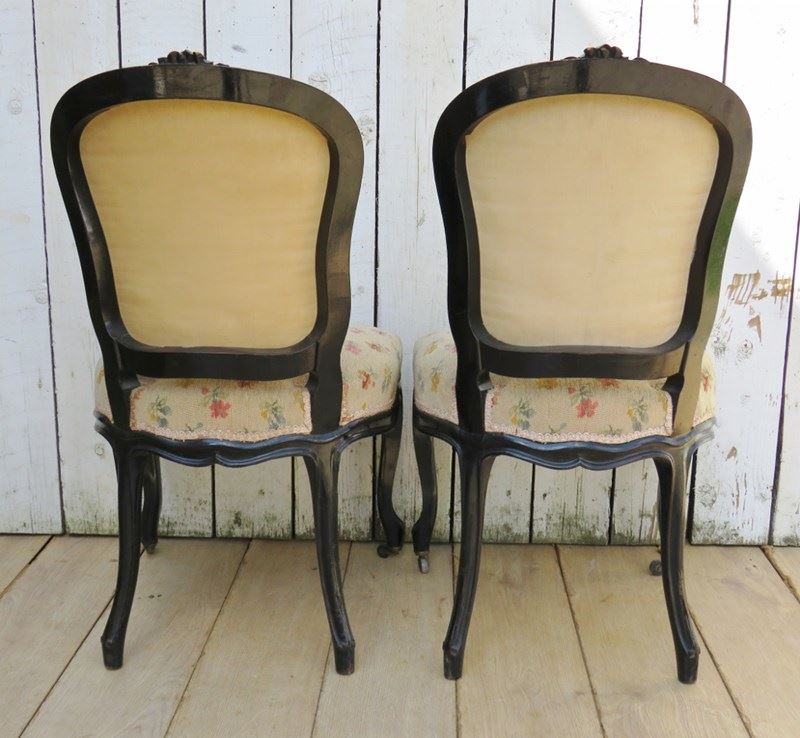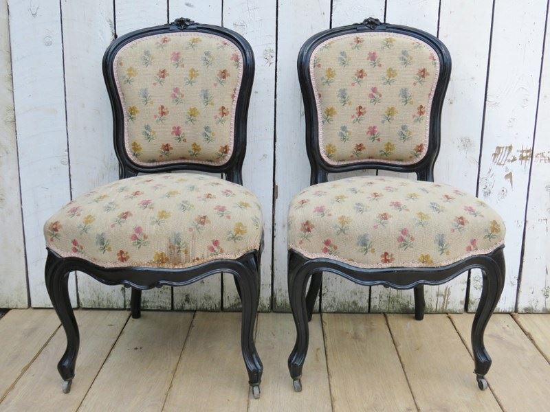 Shapely pair of sound, sturdy and sprung 19th century French ebonised salon side chairs with castors to the front legs for either re-upholstery or used as they are.