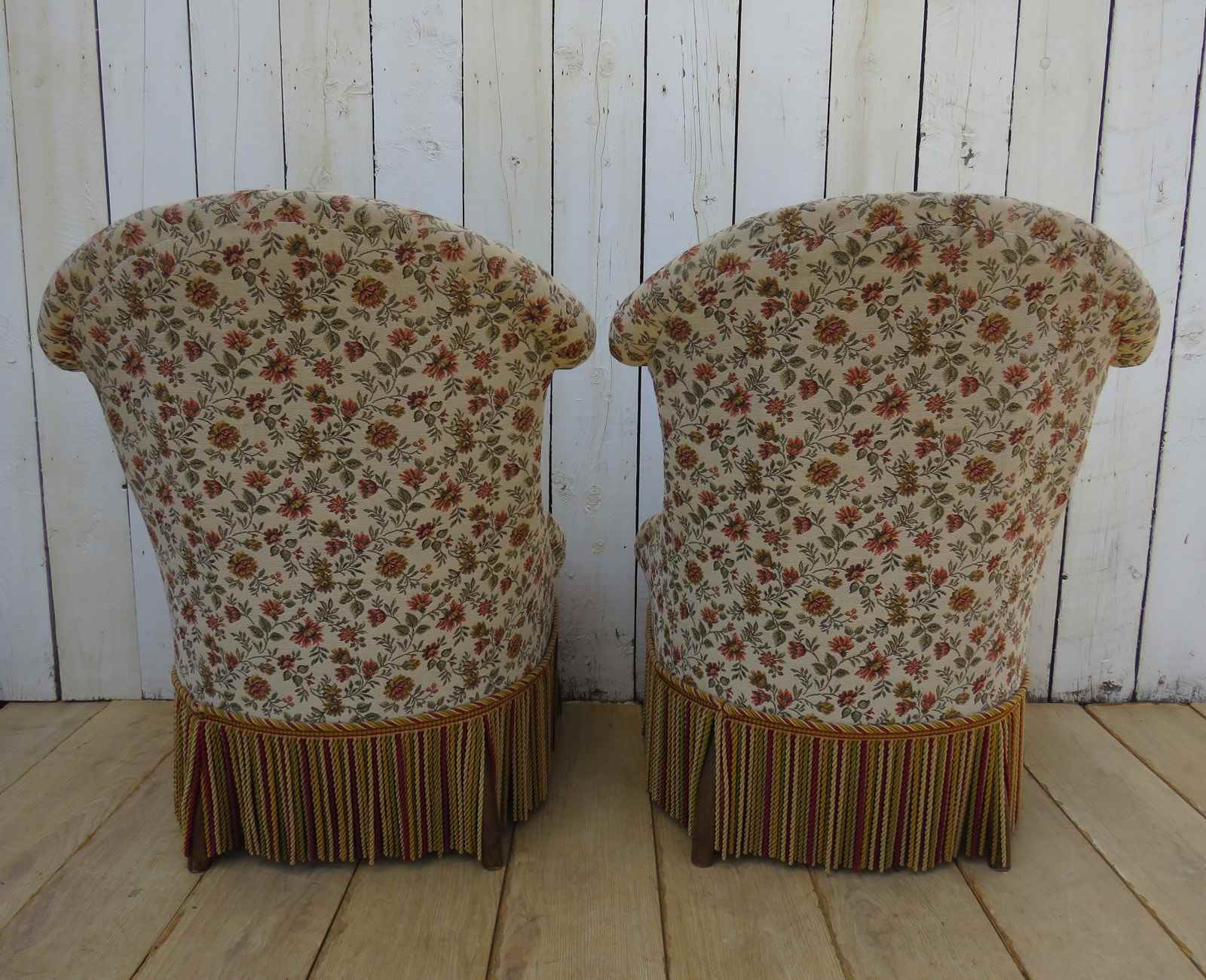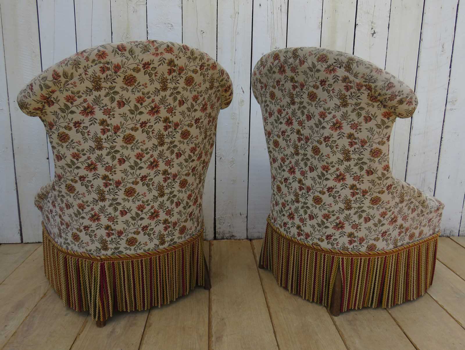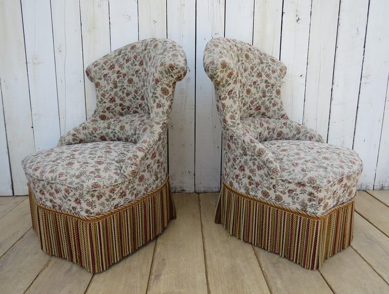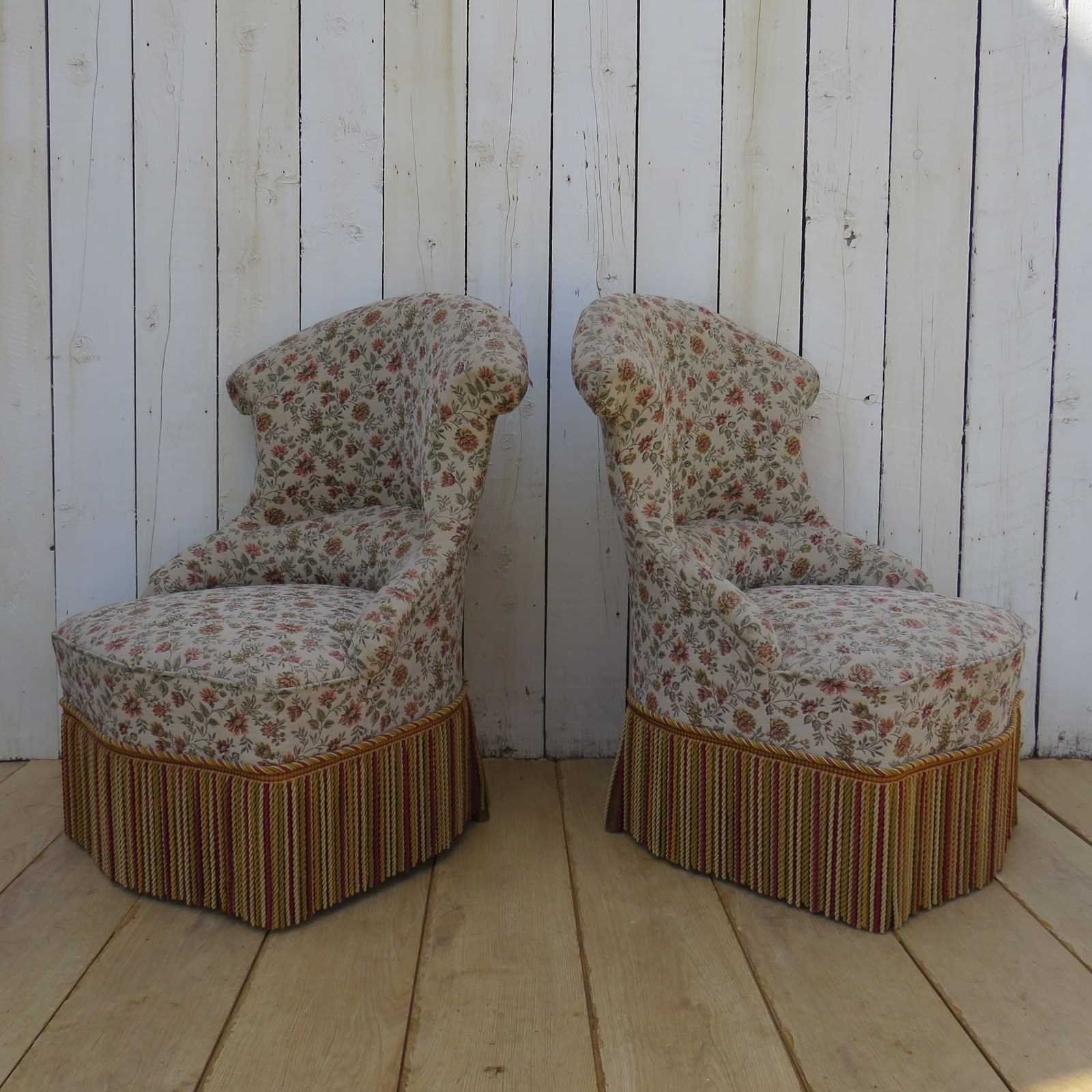 Shapely pair of sound, sturdy and sprung 19th century French serpentine fronted Napoleon III crapaud nursing, boudoir, tub armchairs on oak legs for either re-upholstery or used as they are with a light clean. Seat height 39cm & seat depth 46cm.
