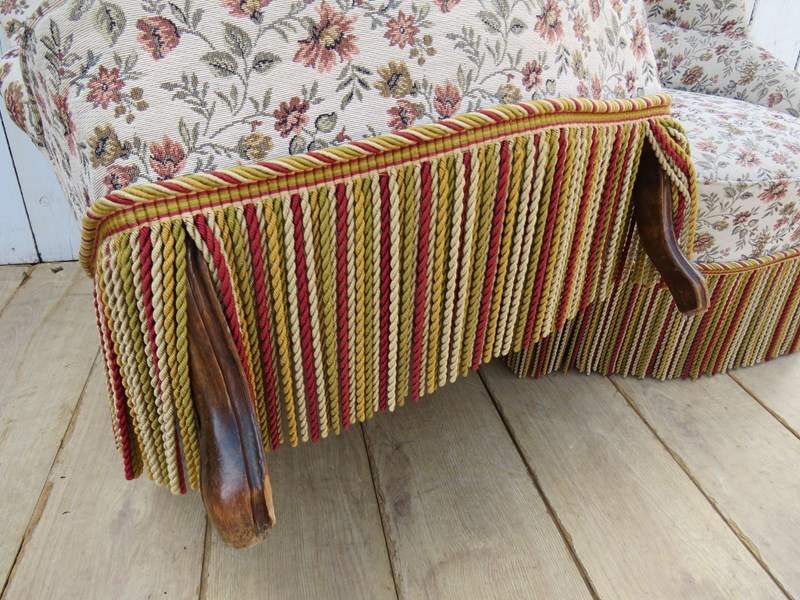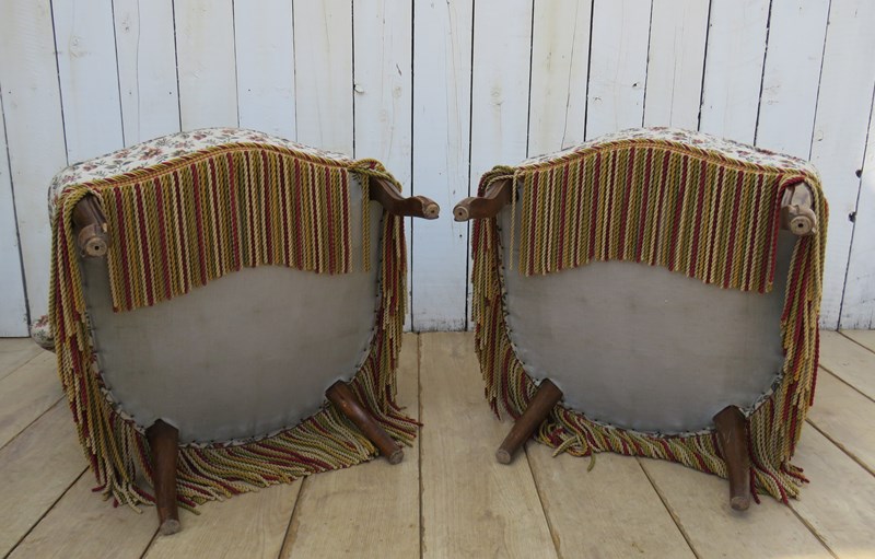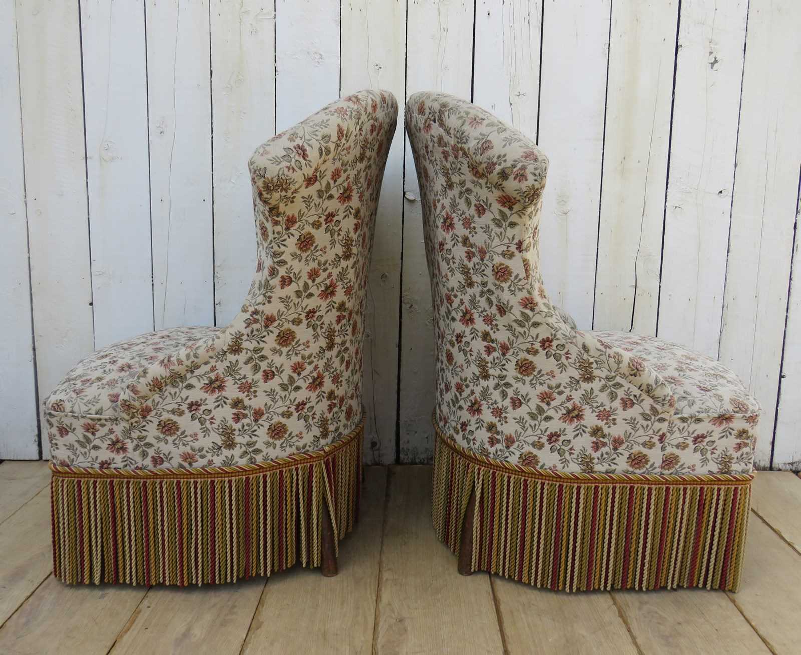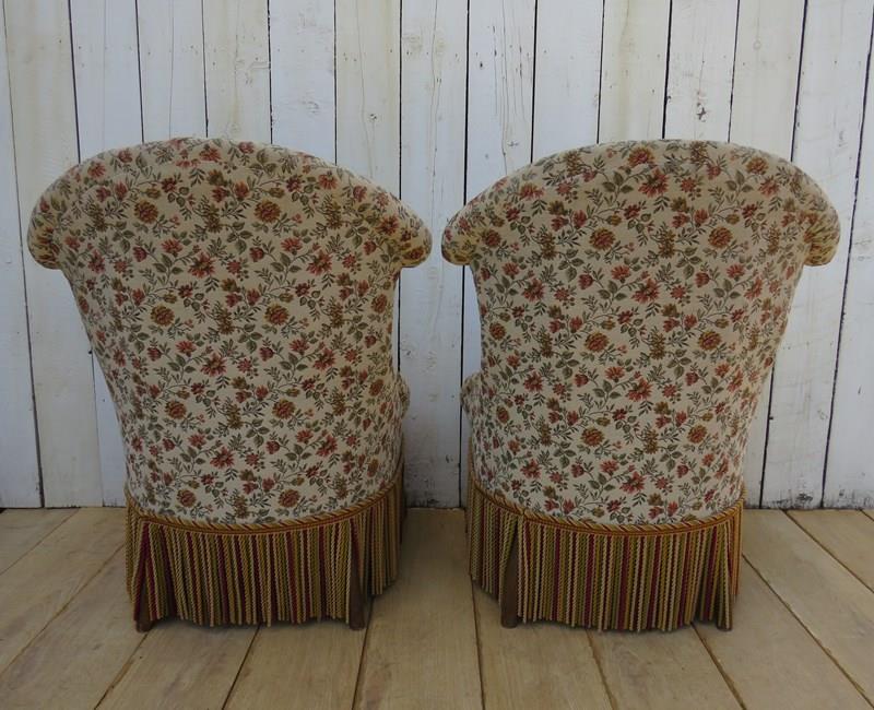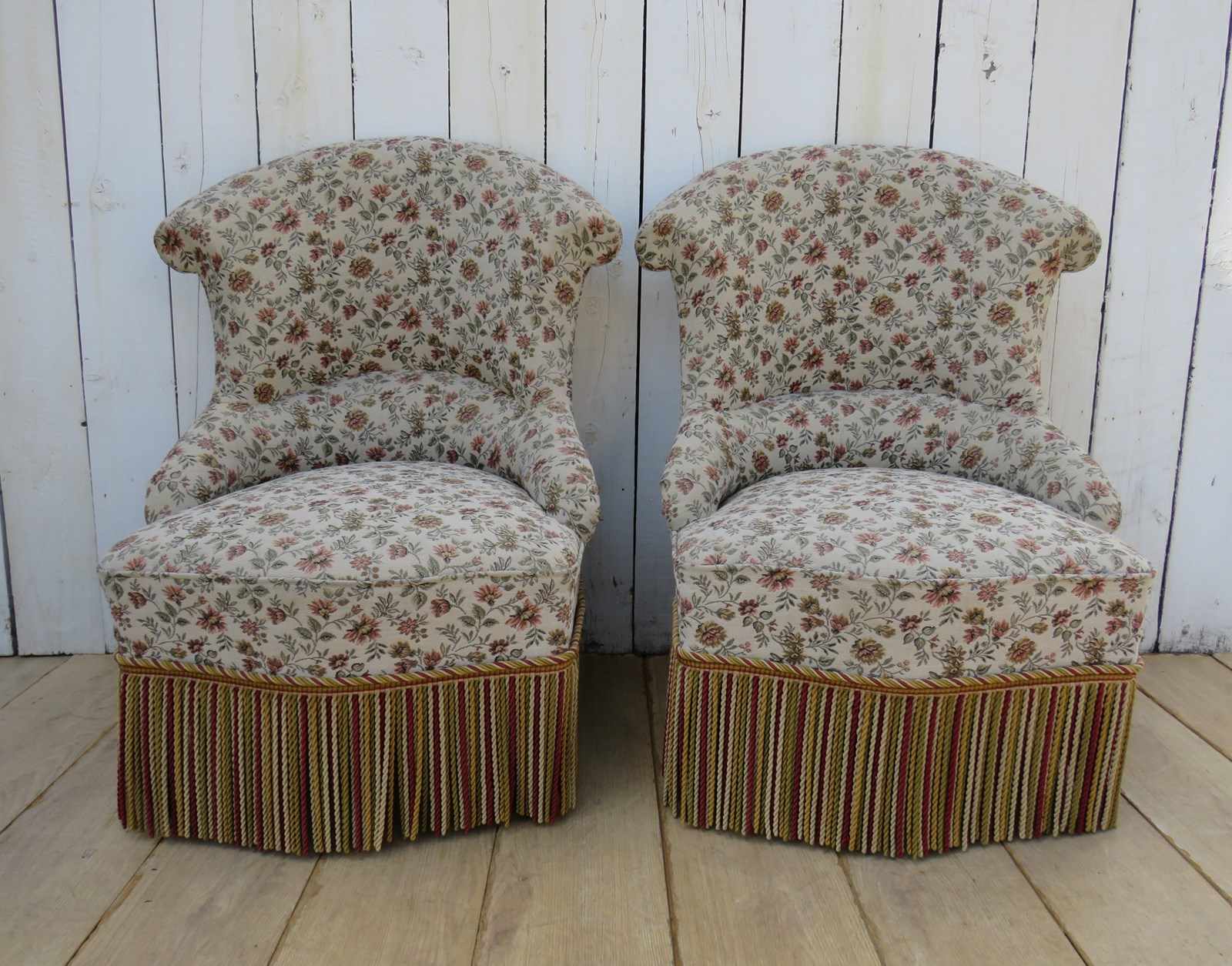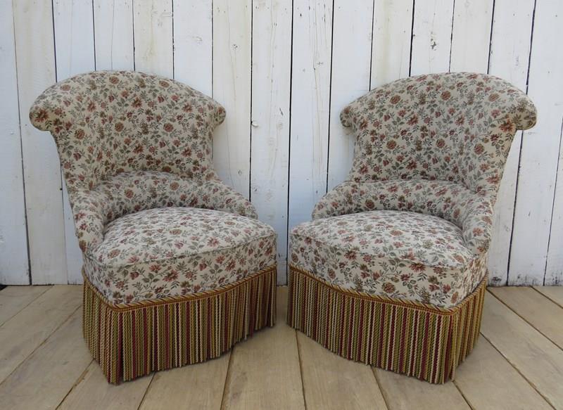 Shapely pair of sound, sturdy and sprung 19th century French serpentine fronted Napoleon III crapaud nursing, boudoir, tub armchairs on oak legs for either re-upholstery or used as they are with a light clean. Seat height 39cm & seat depth 46cm.