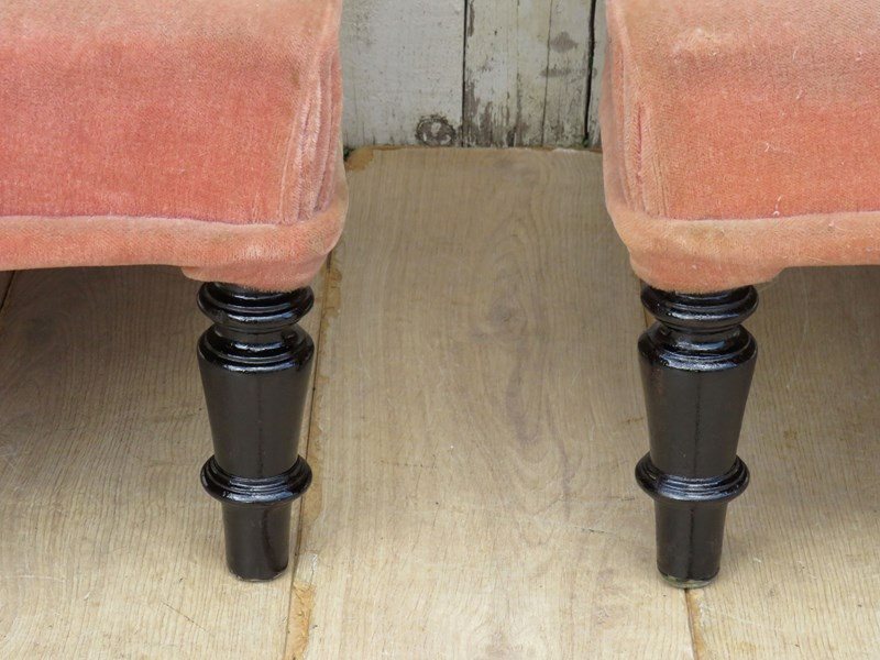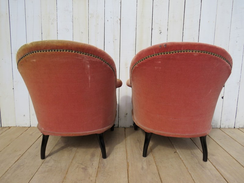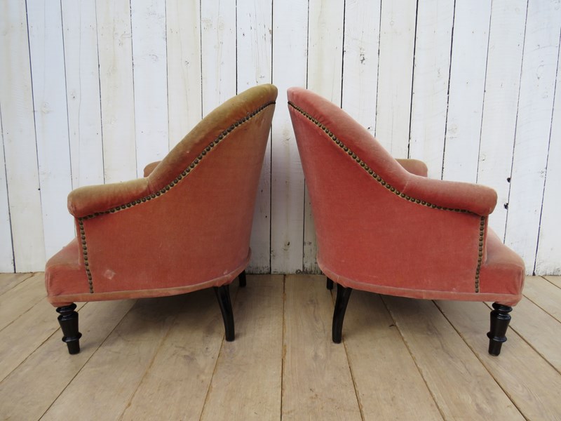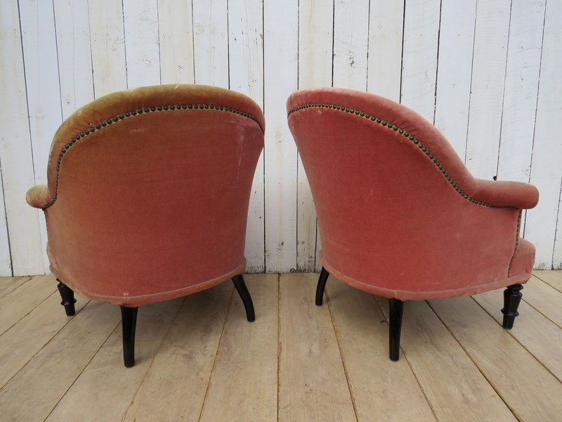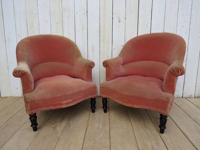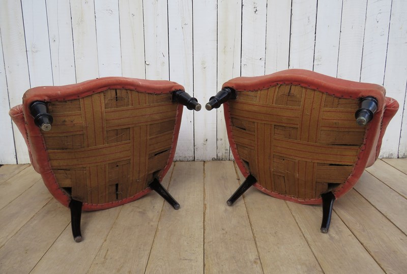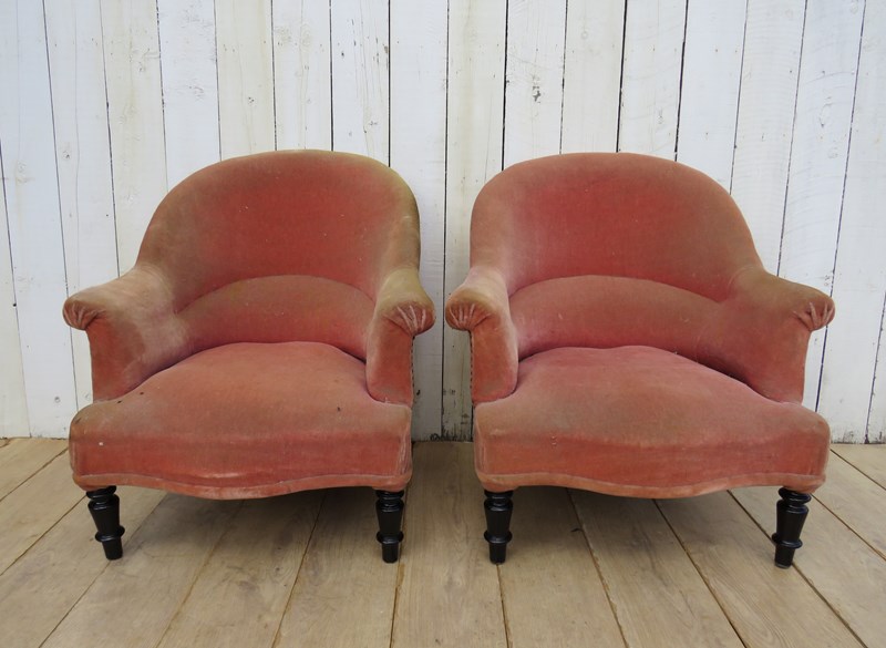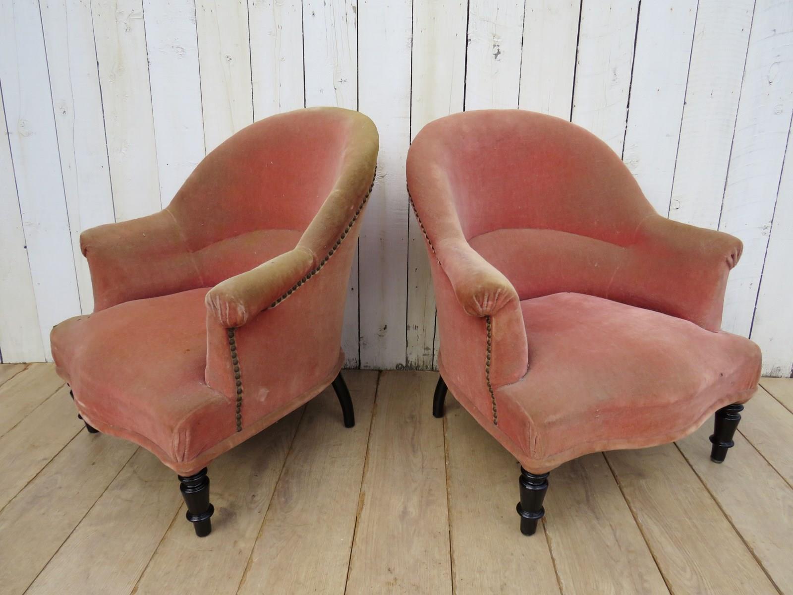 Shapely pair of sound and sturdy 19th century French serpentine fronted Napoleon III crapaud tub armchairs on ebonised legs for full re-upholstery. Seat height 37cm & seat depth 51cm.