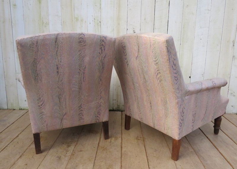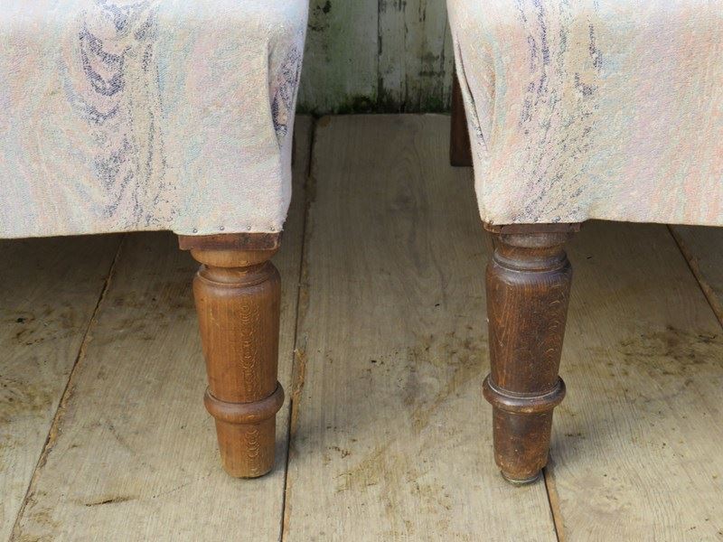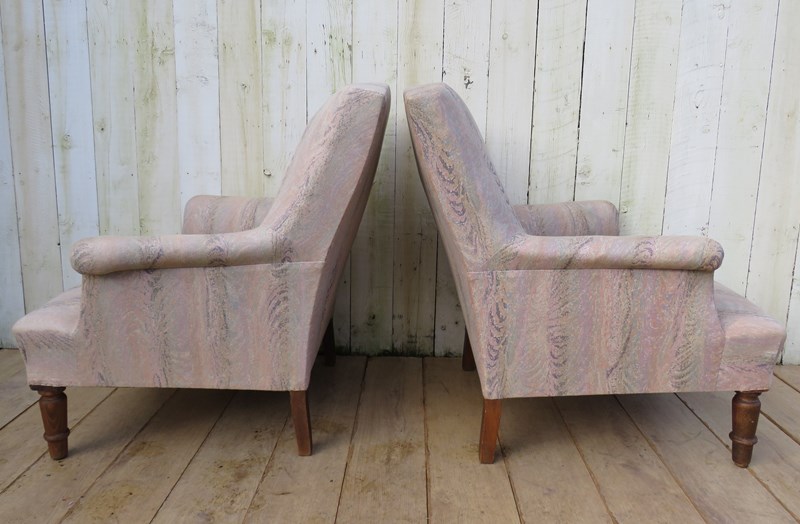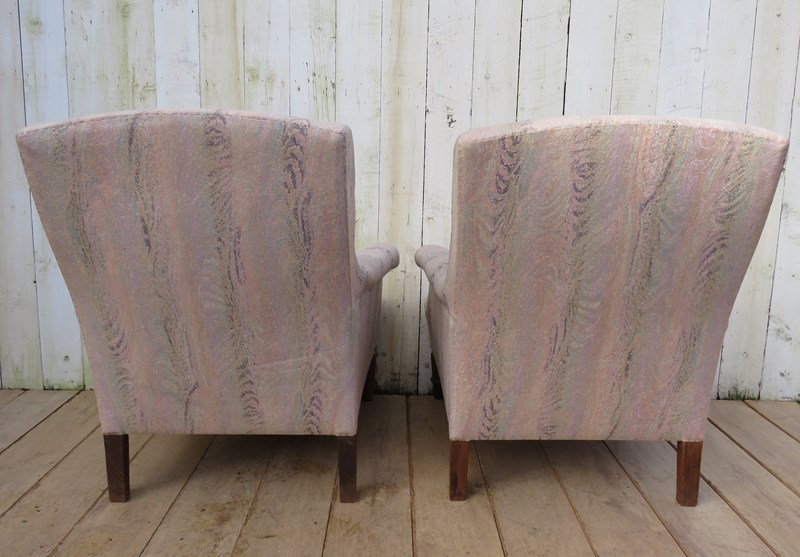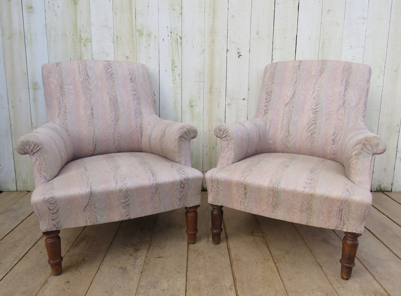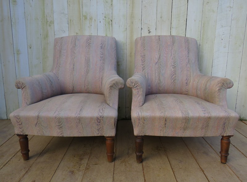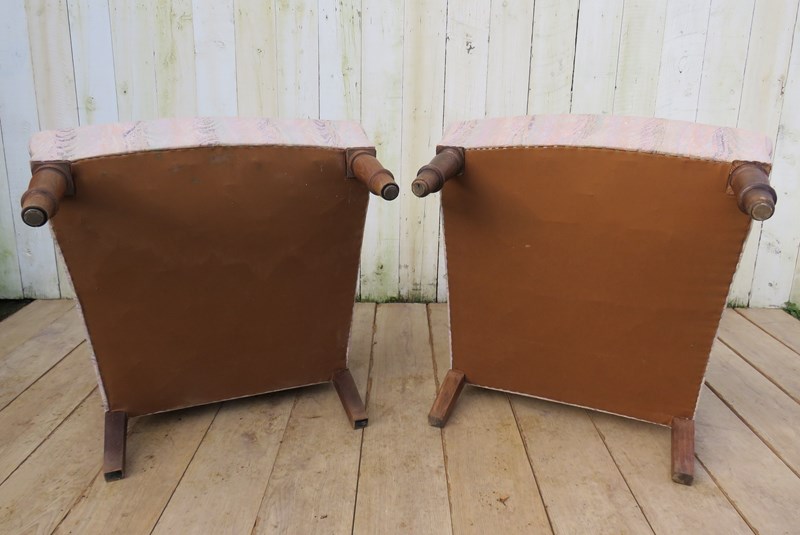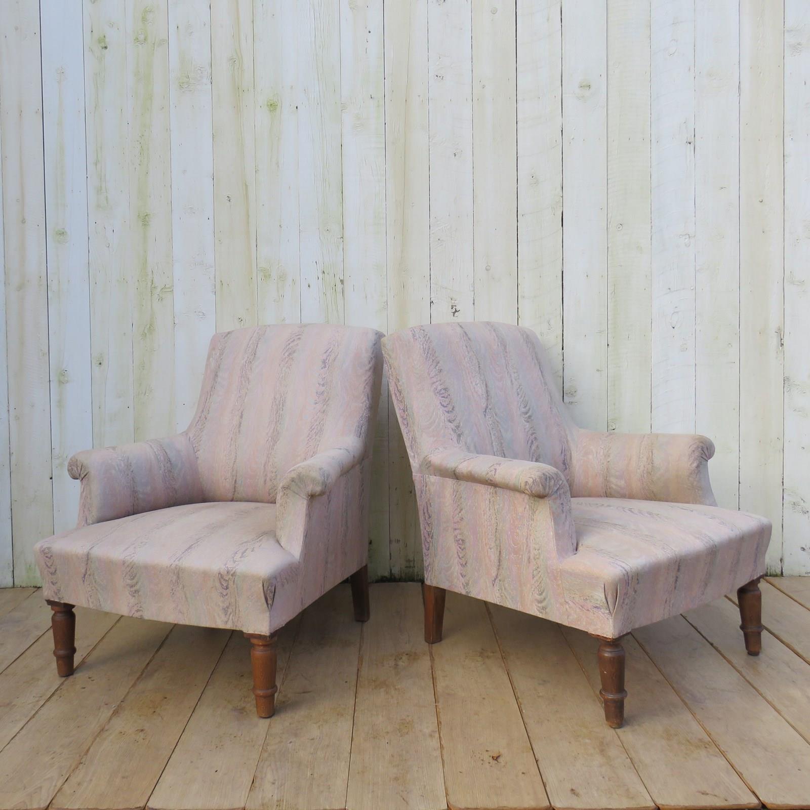Shapely pair of sound, sturdy and sprung early 20th century French high back library easy armchairs on oak legs for re-upholstery. Seat height 42cm & seat depth 60cm.