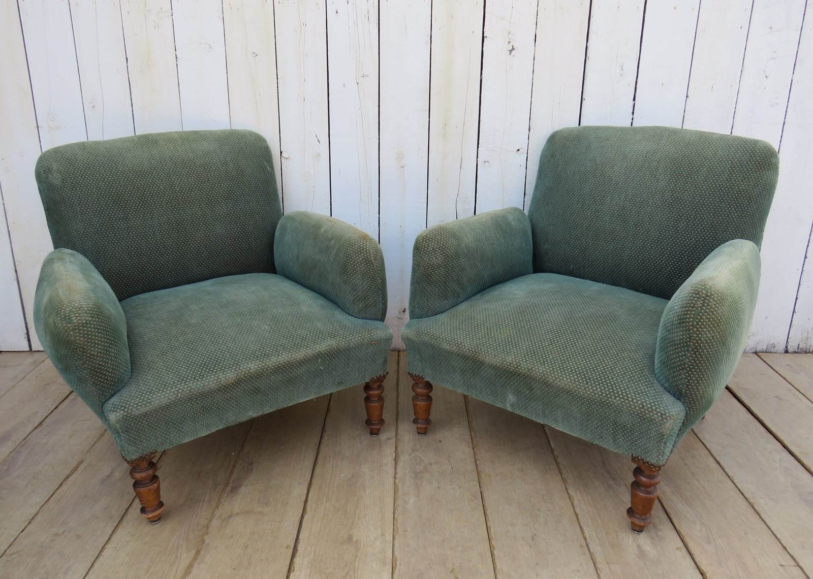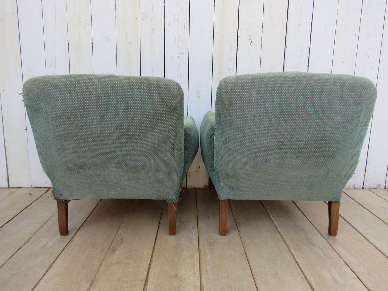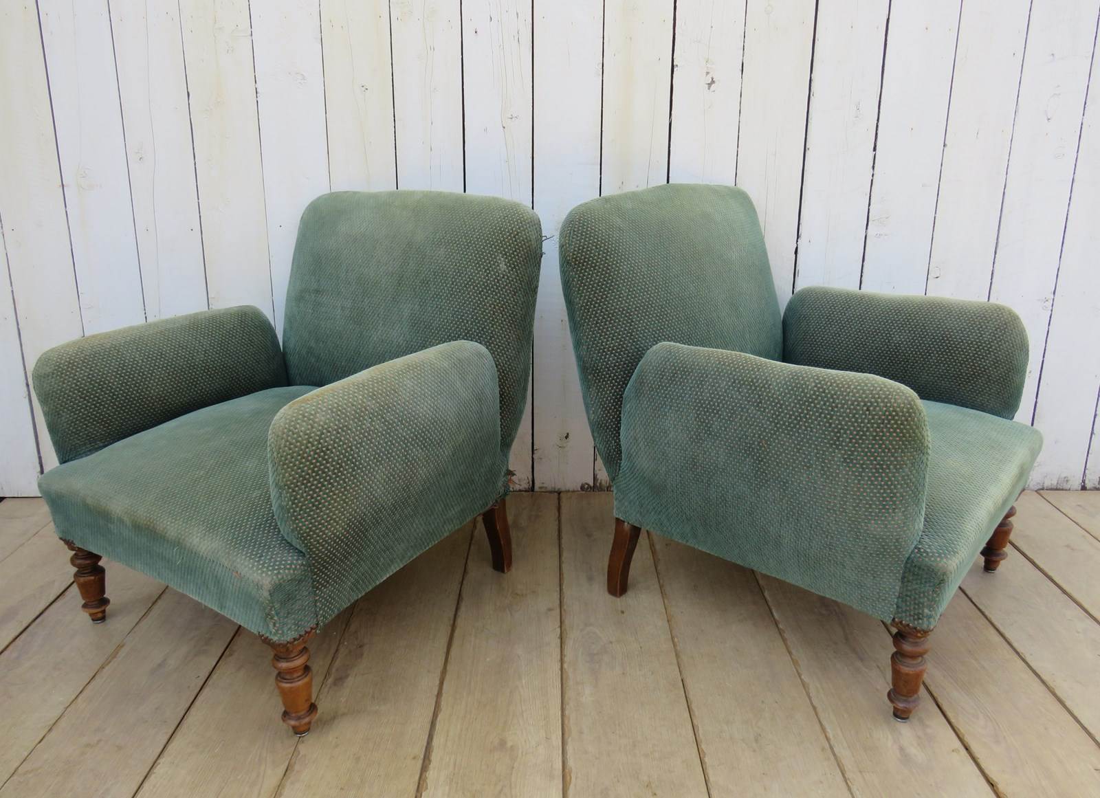 Shapely pair of sound, sturdy and sprung 19th century French fireside Napoleon III chauffeuse armchairs on oak legs for re-upholstery. Seat height 38cm & seat depth 50cm.