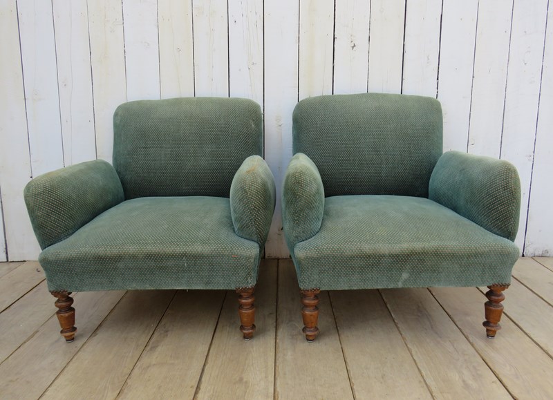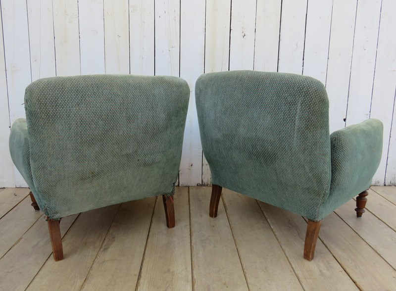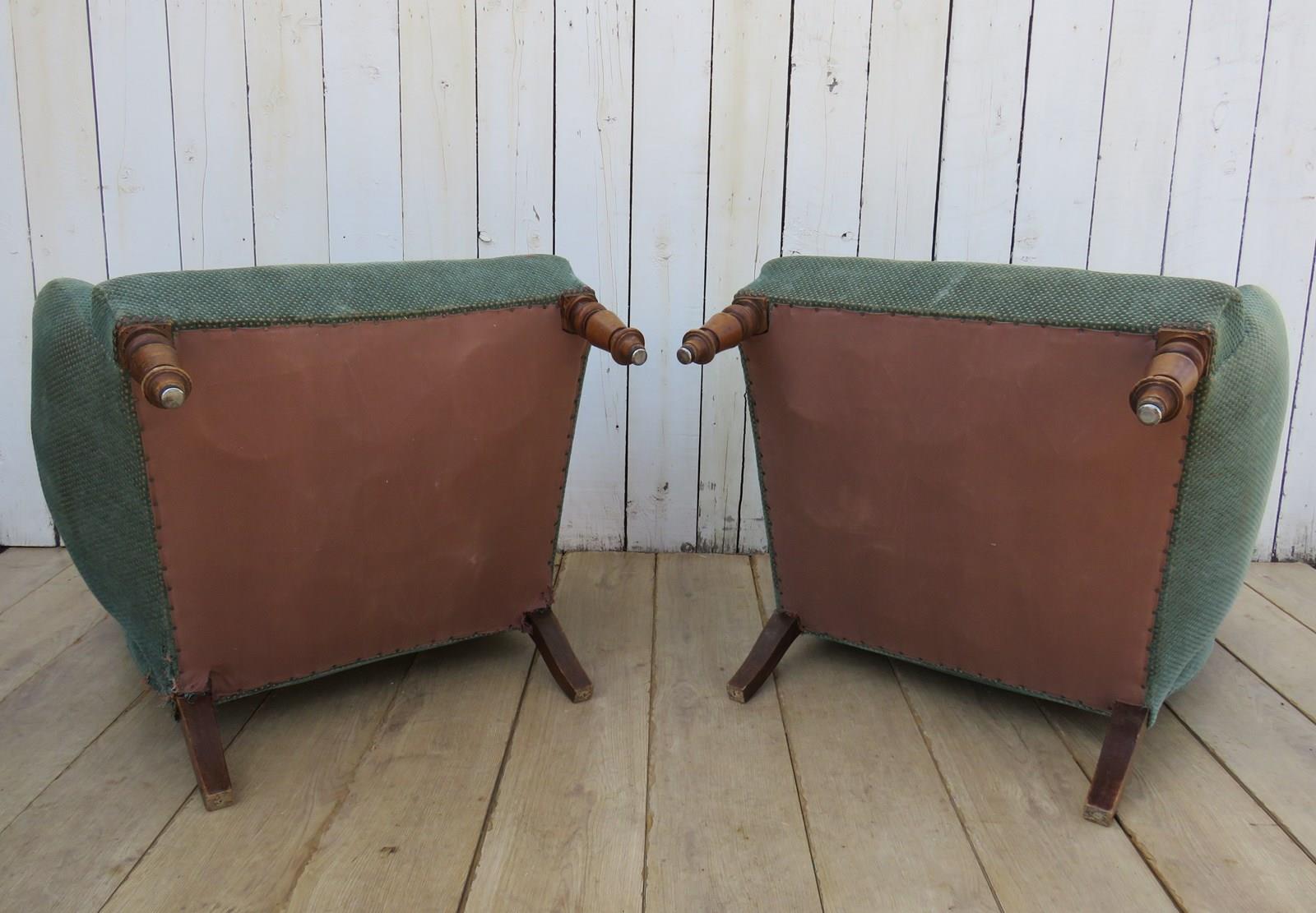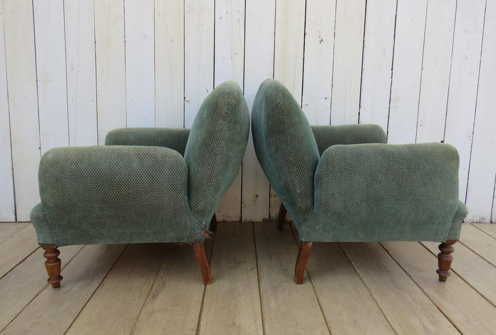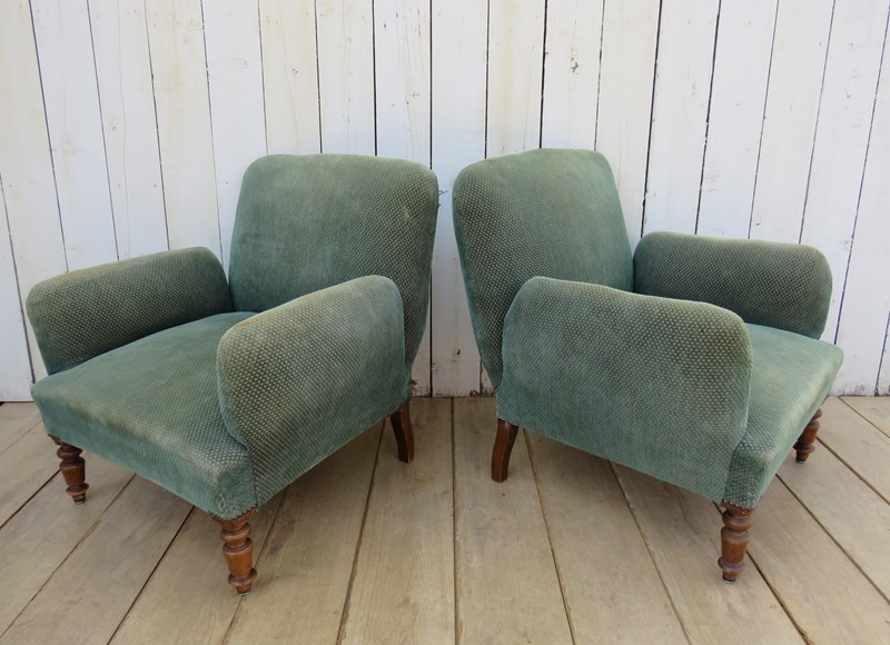 Shapely pair of sound, sturdy and sprung 19th century French fireside Napoleon III chauffeuse armchairs on oak legs for re-upholstery. Seat height 38cm & seat depth 50cm.