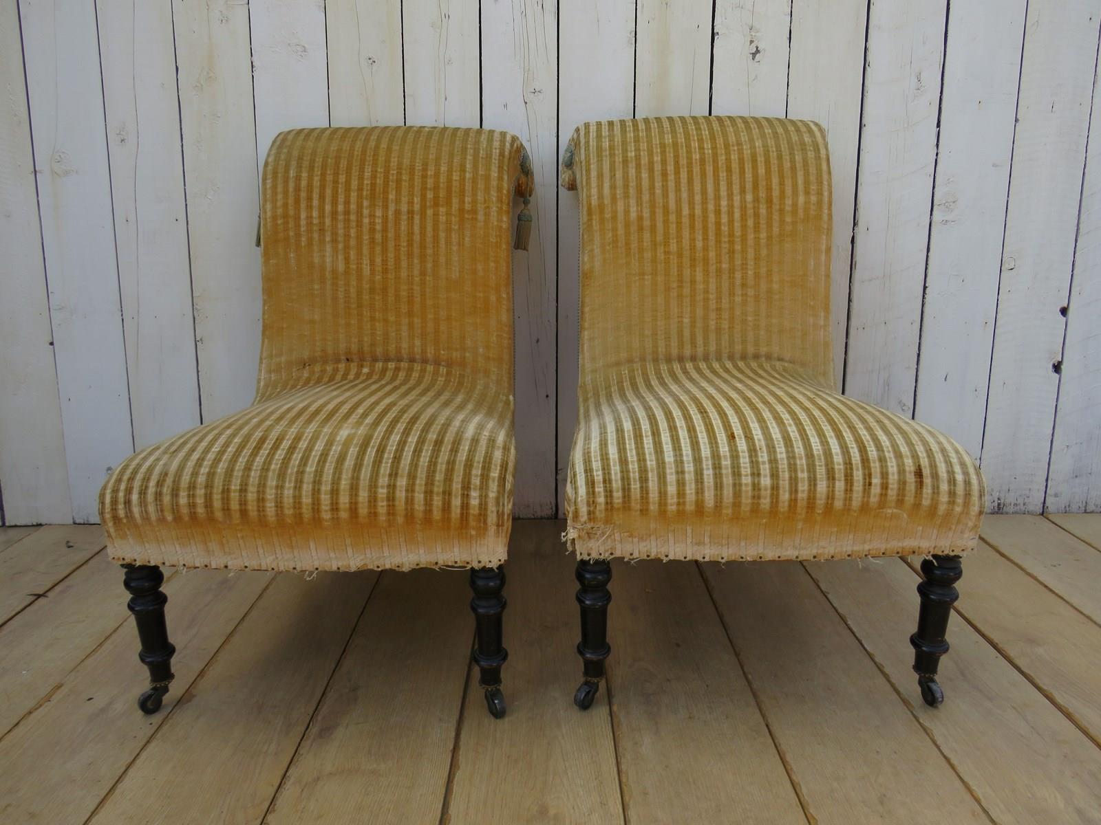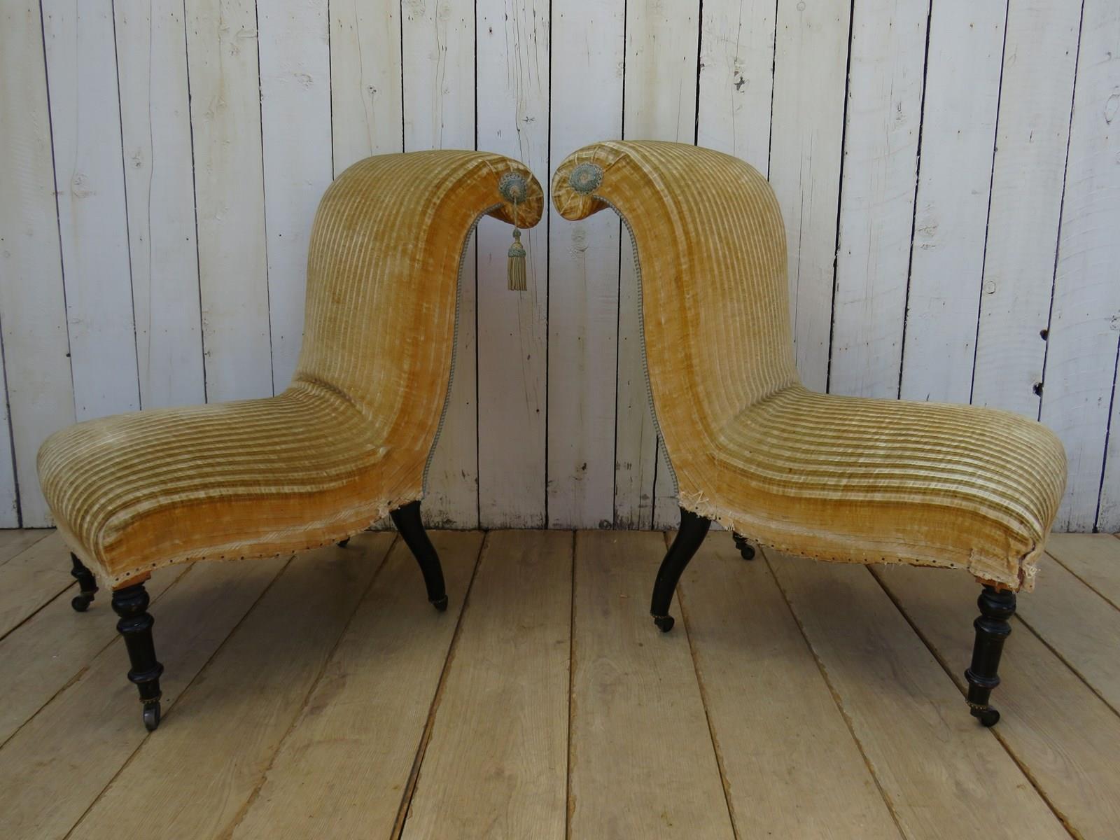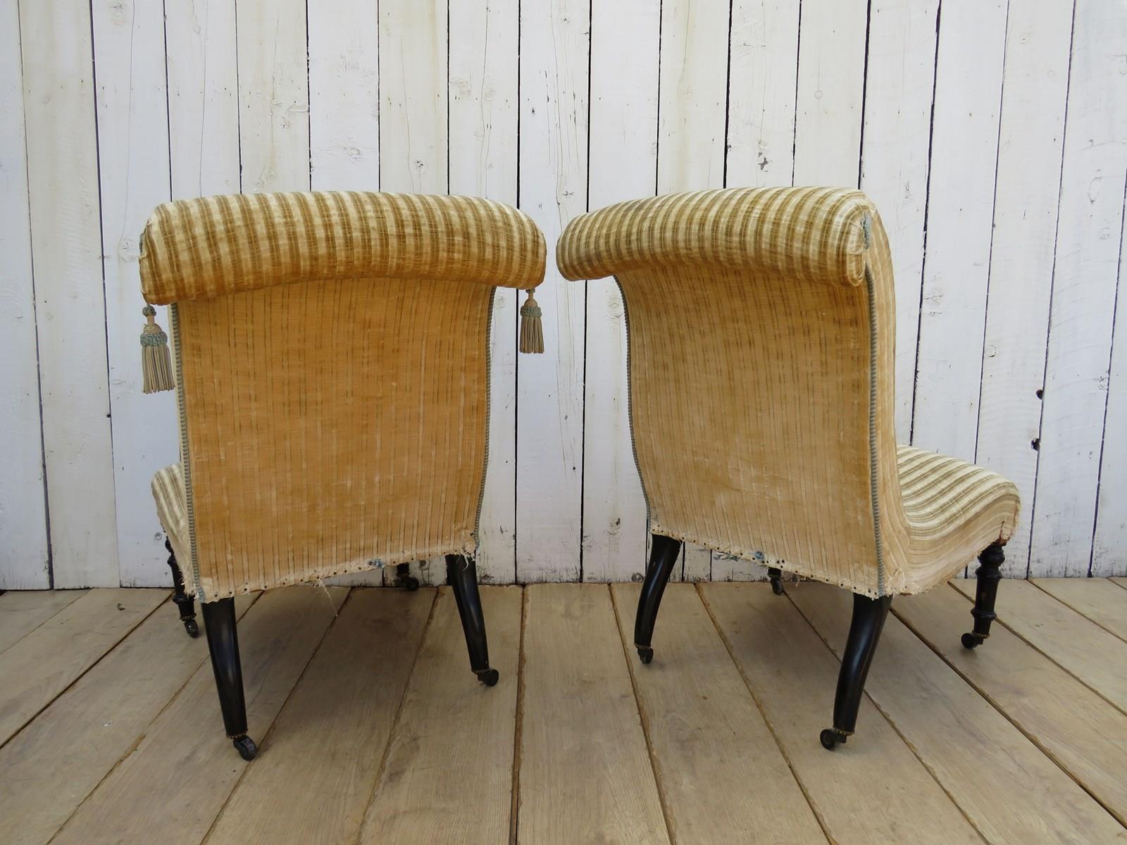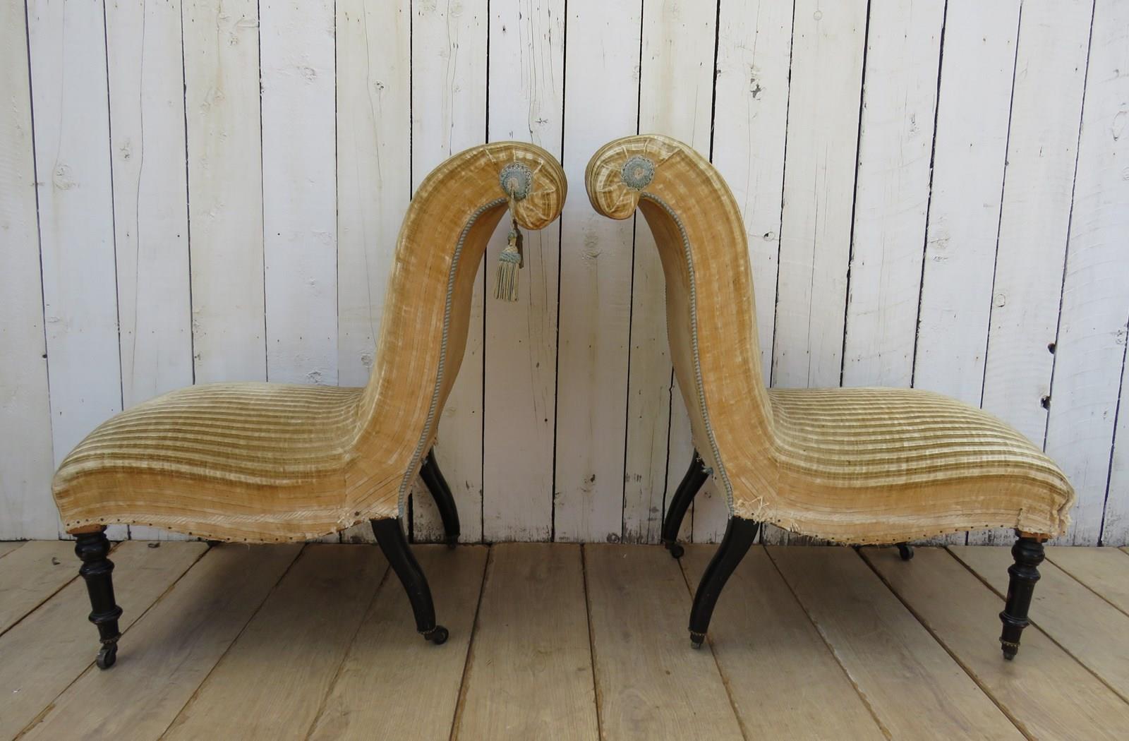Shapely pair of sound, sturdy and sprung 19th century French scroll top Napoleon III slipper, nursing chairs on ebonised legs and castors for re-upholstery. Seat height 38cm & seat depth 44cm.