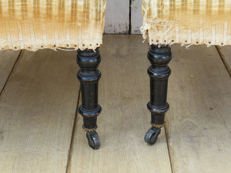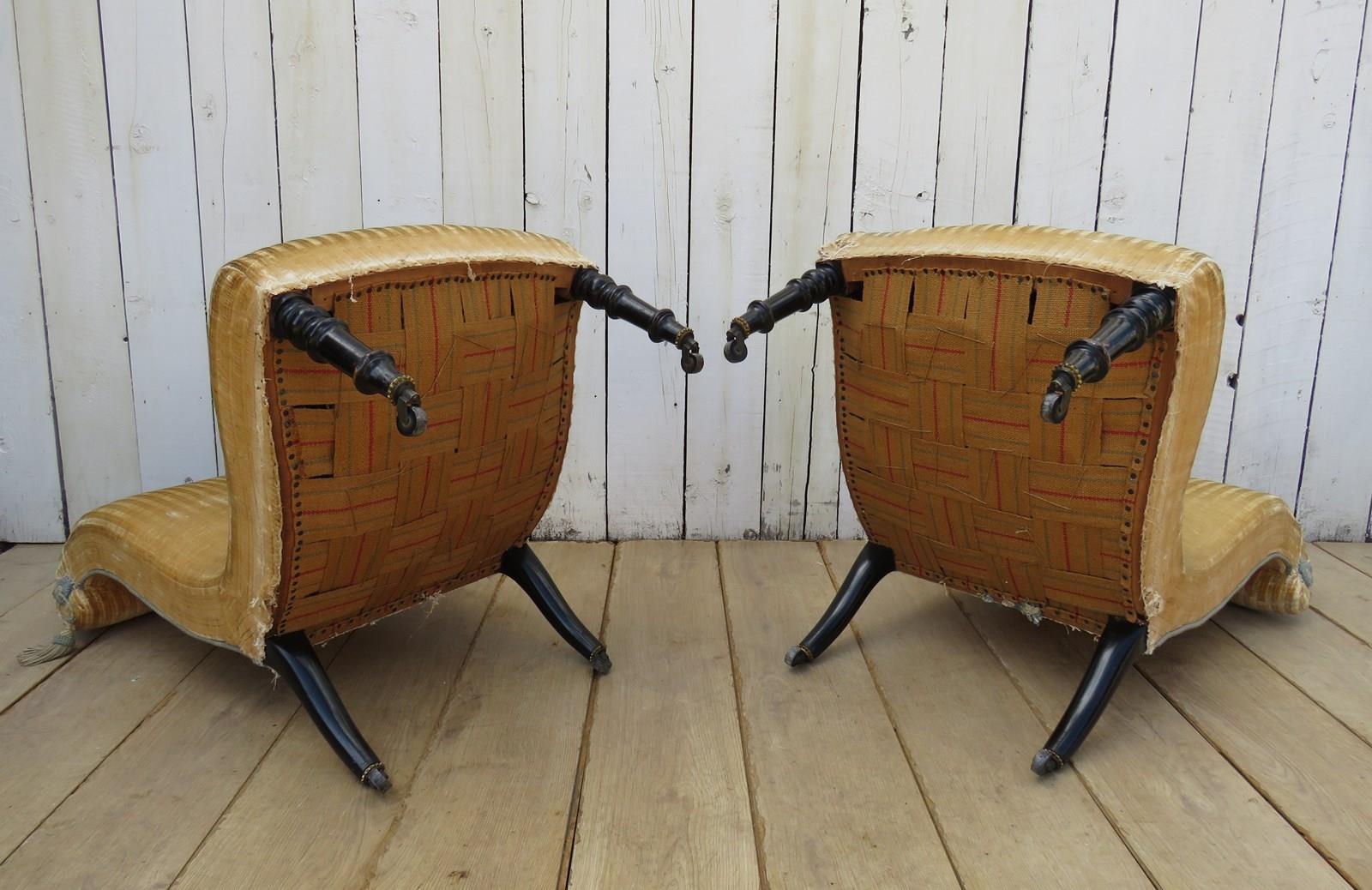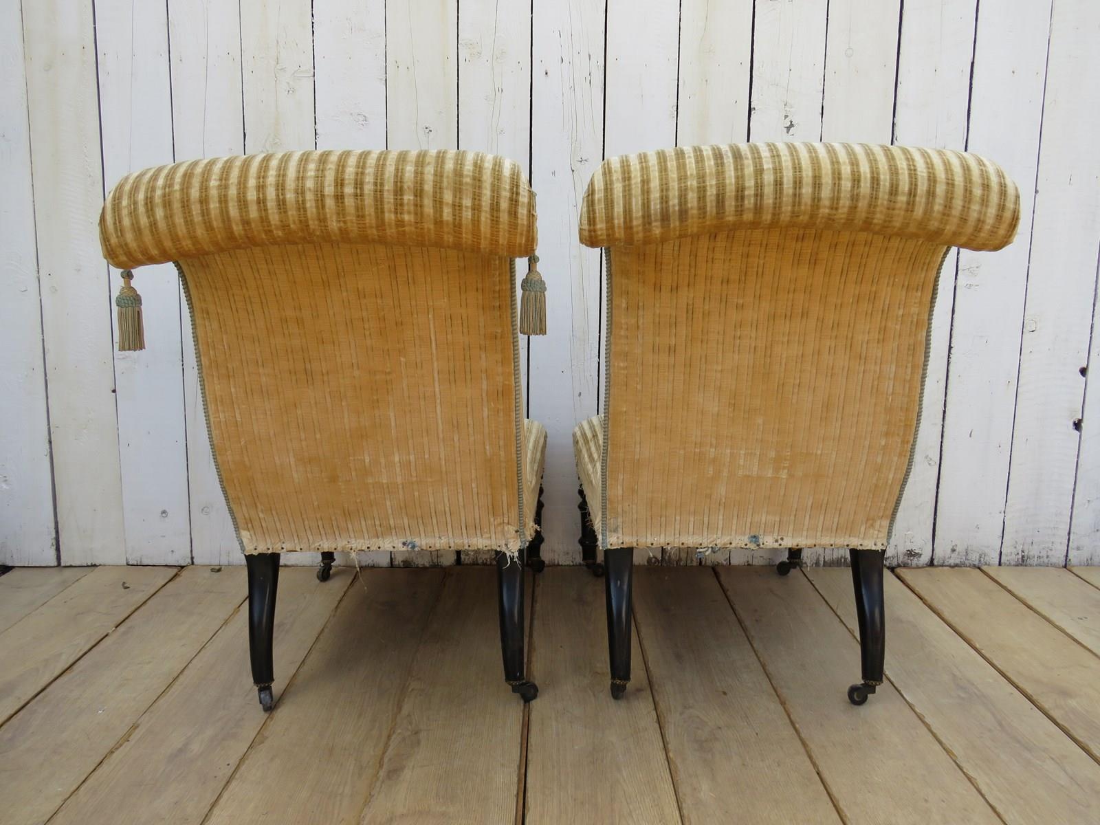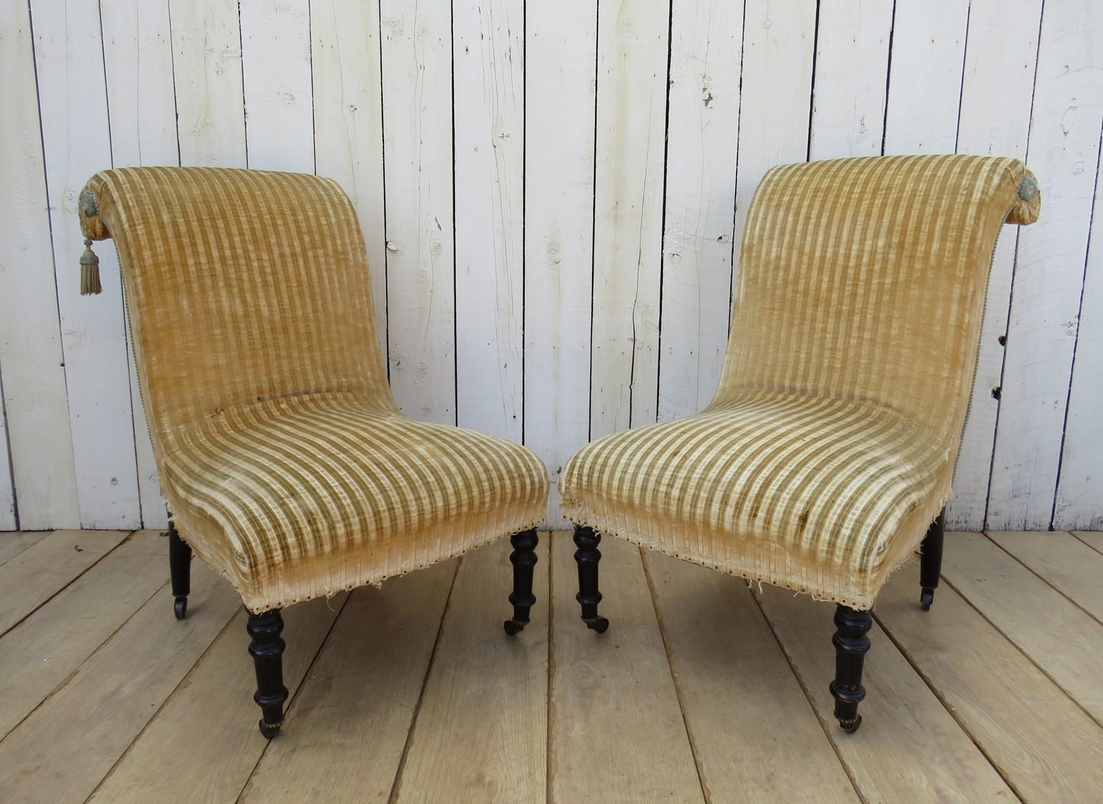 Shapely pair of sound, sturdy and sprung 19th century French scroll top Napoleon III slipper, nursing chairs on ebonised legs and castors for re-upholstery. Seat height 38cm & seat depth 44cm.