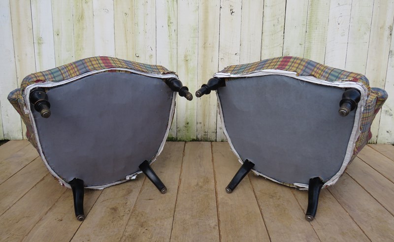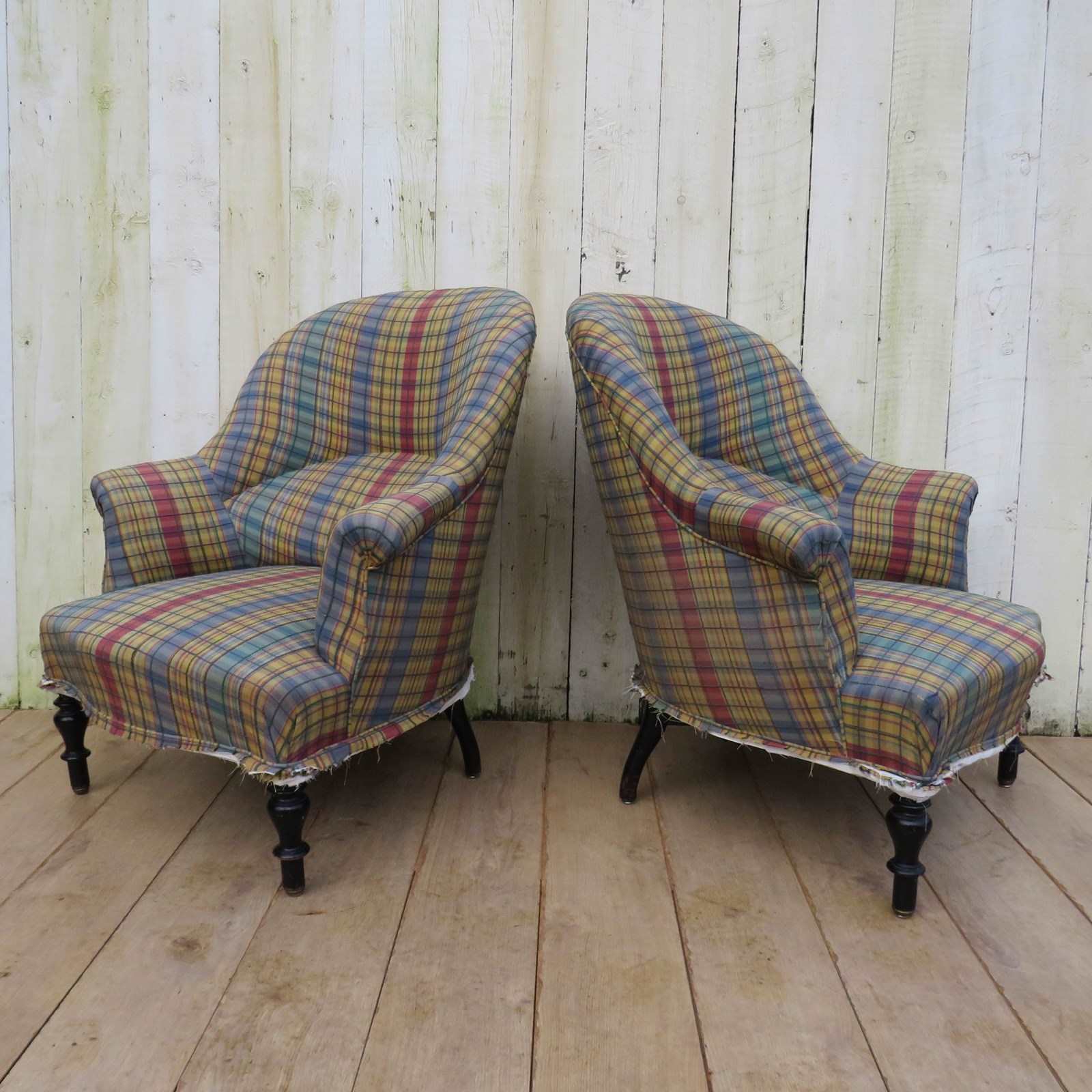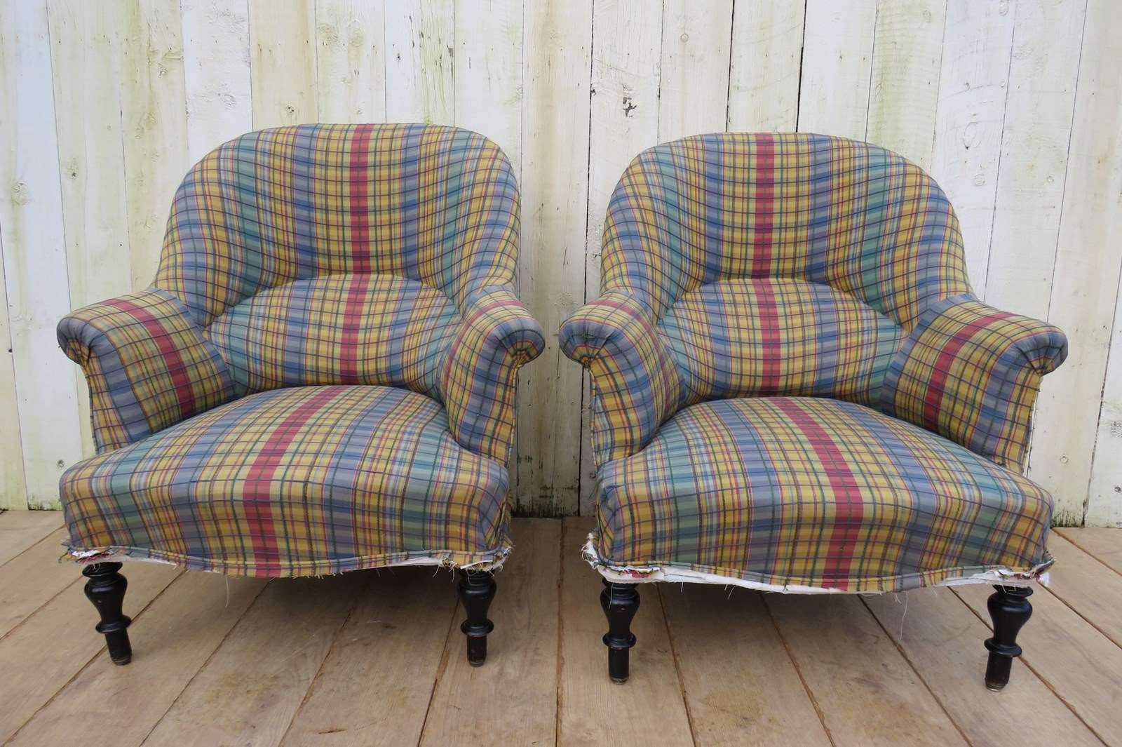 Shapely pair of sound and sturdy 199th century French serpentine fronted Napoleon III crapaud tub armchairs on ebonised legs for re-upholstery. Seat height 40cm & seat depth 50cm.