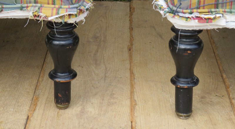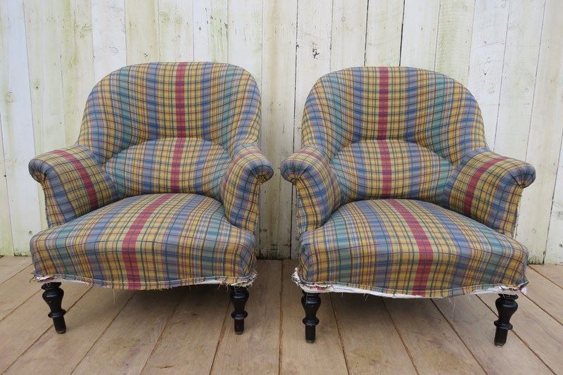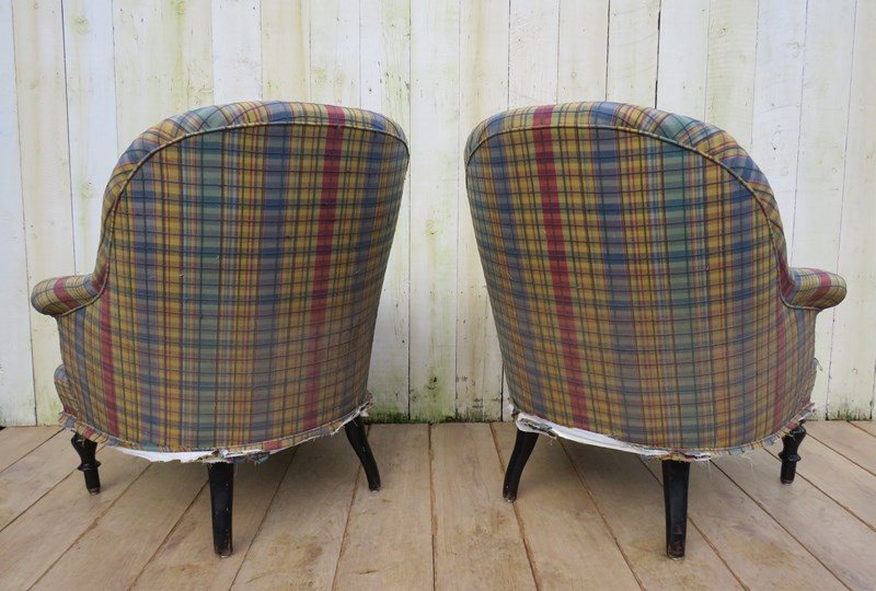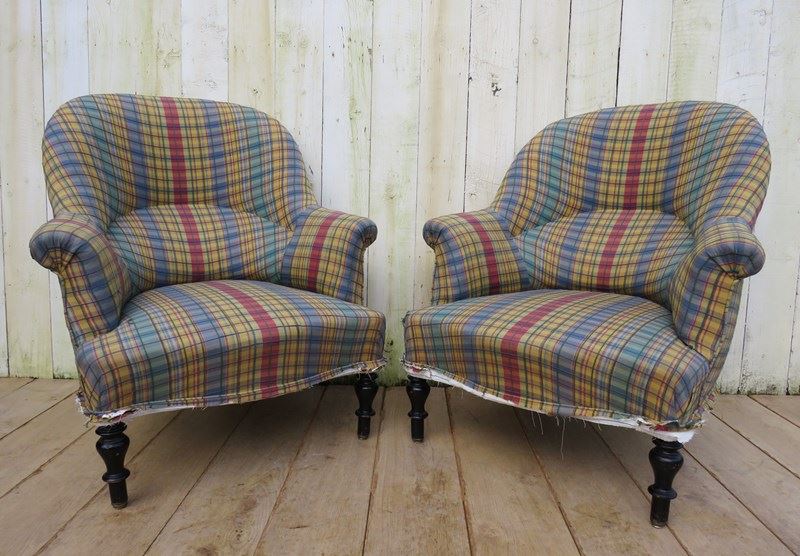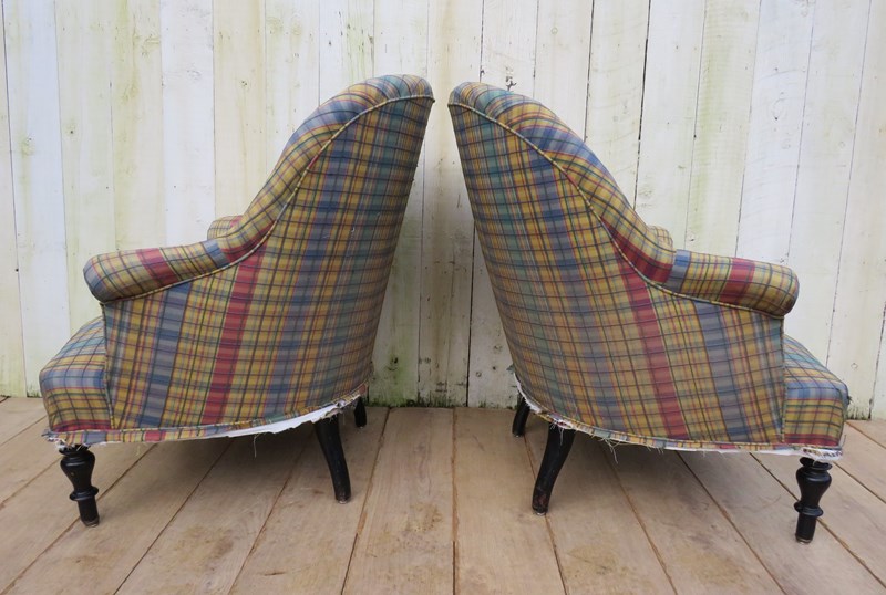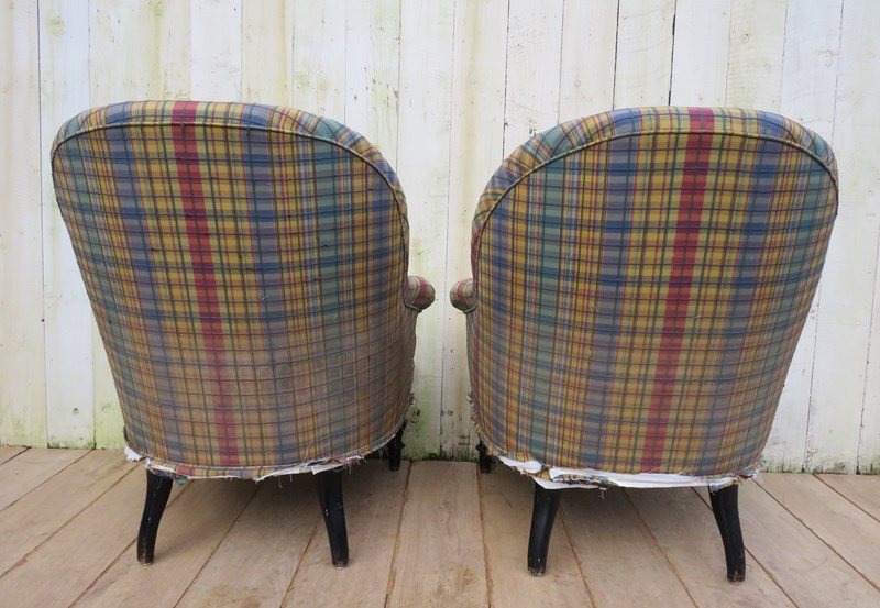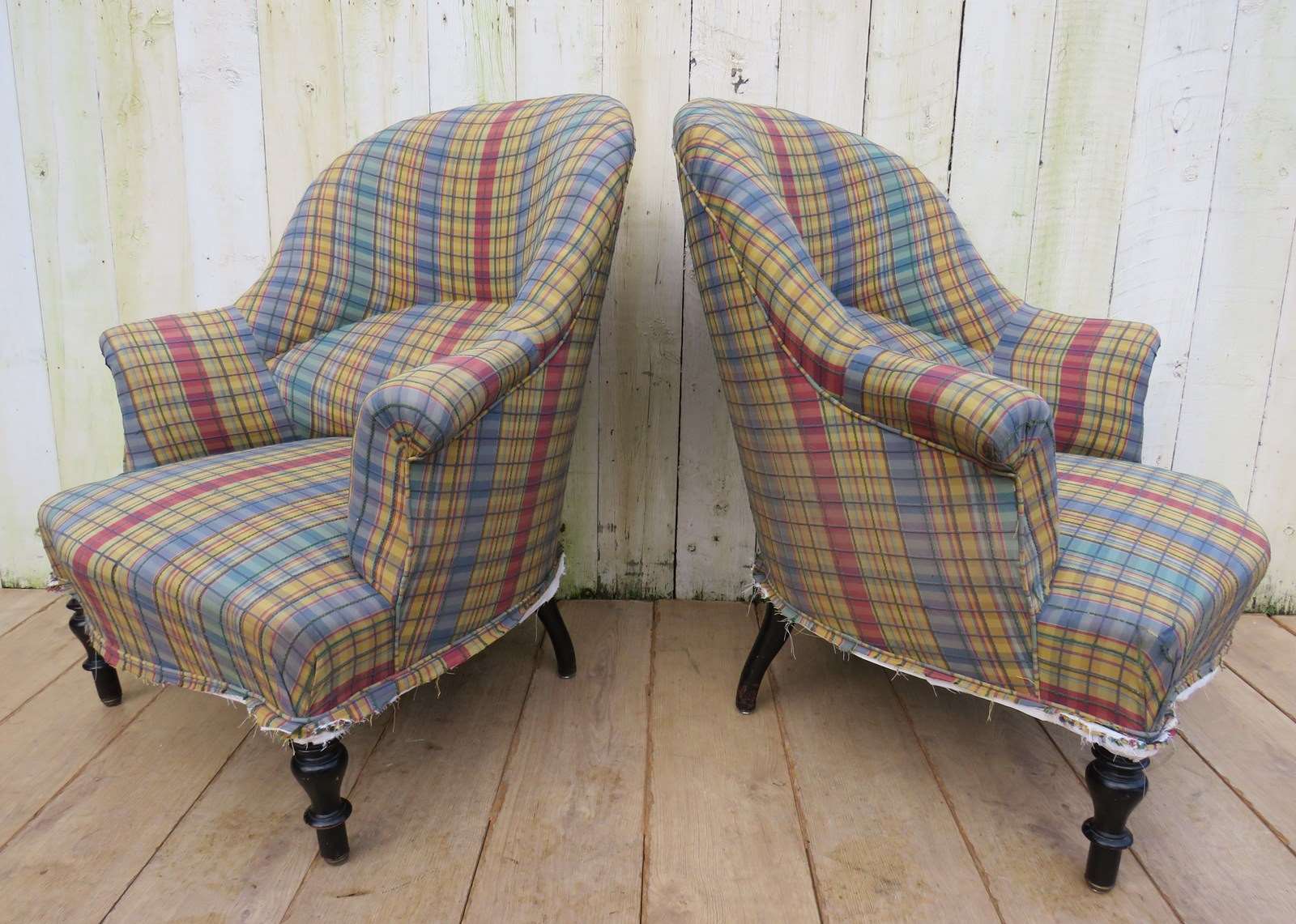 Shapely pair of sound and sturdy 199th century French serpentine fronted Napoleon III crapaud tub armchairs on ebonised legs for re-upholstery. Seat height 40cm & seat depth 50cm.