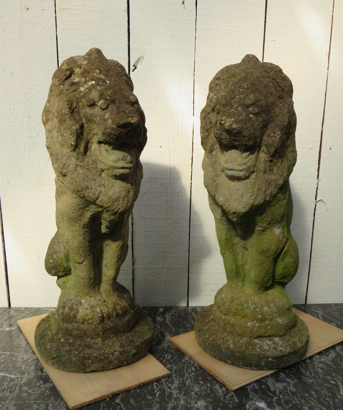 Large pair of vintage English decorative statuary reconstituted stone weathered garden lion ornaments.