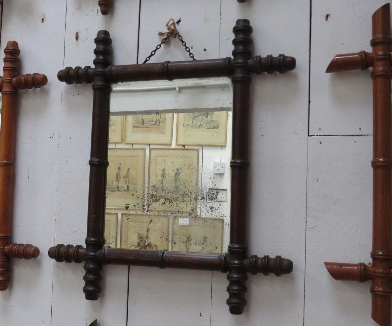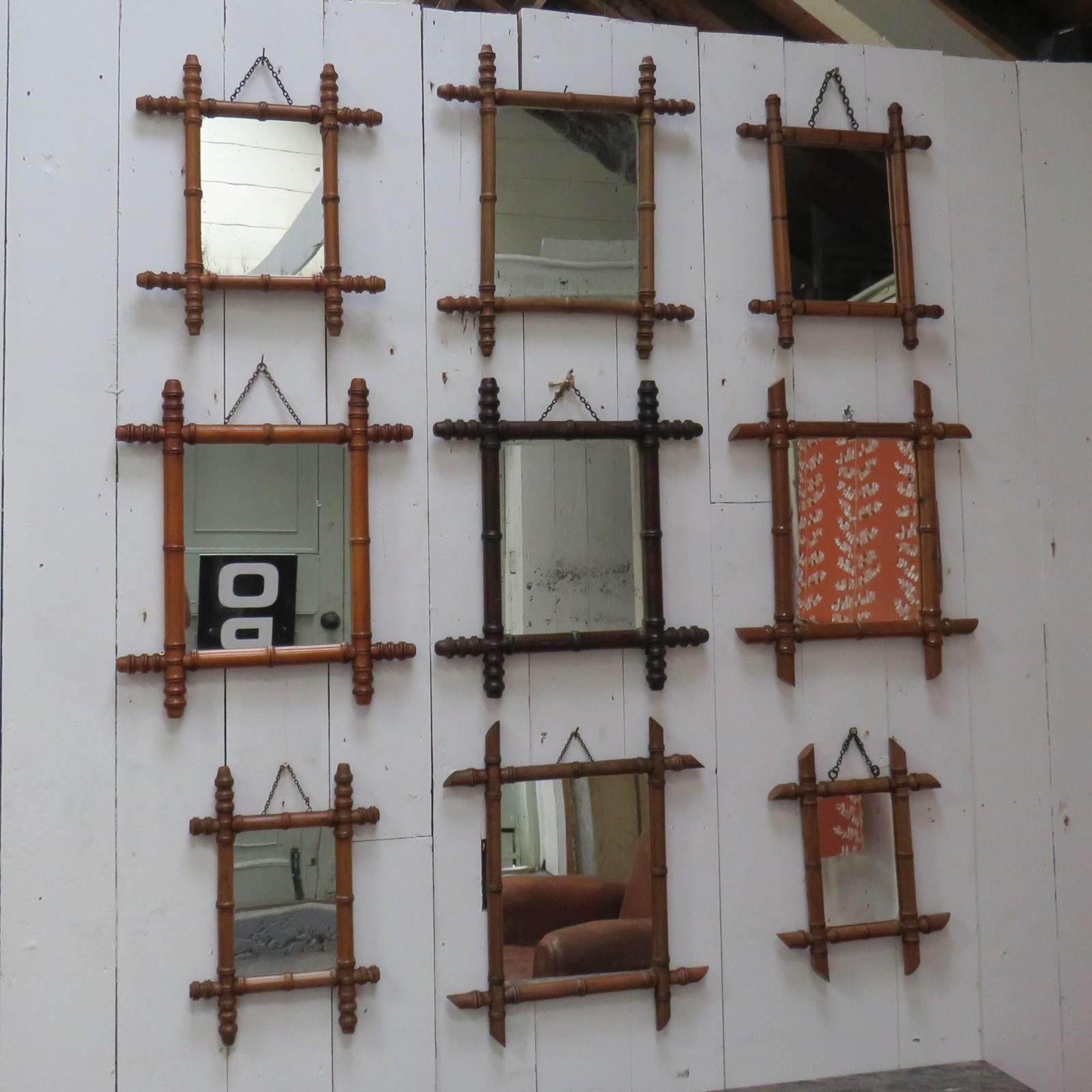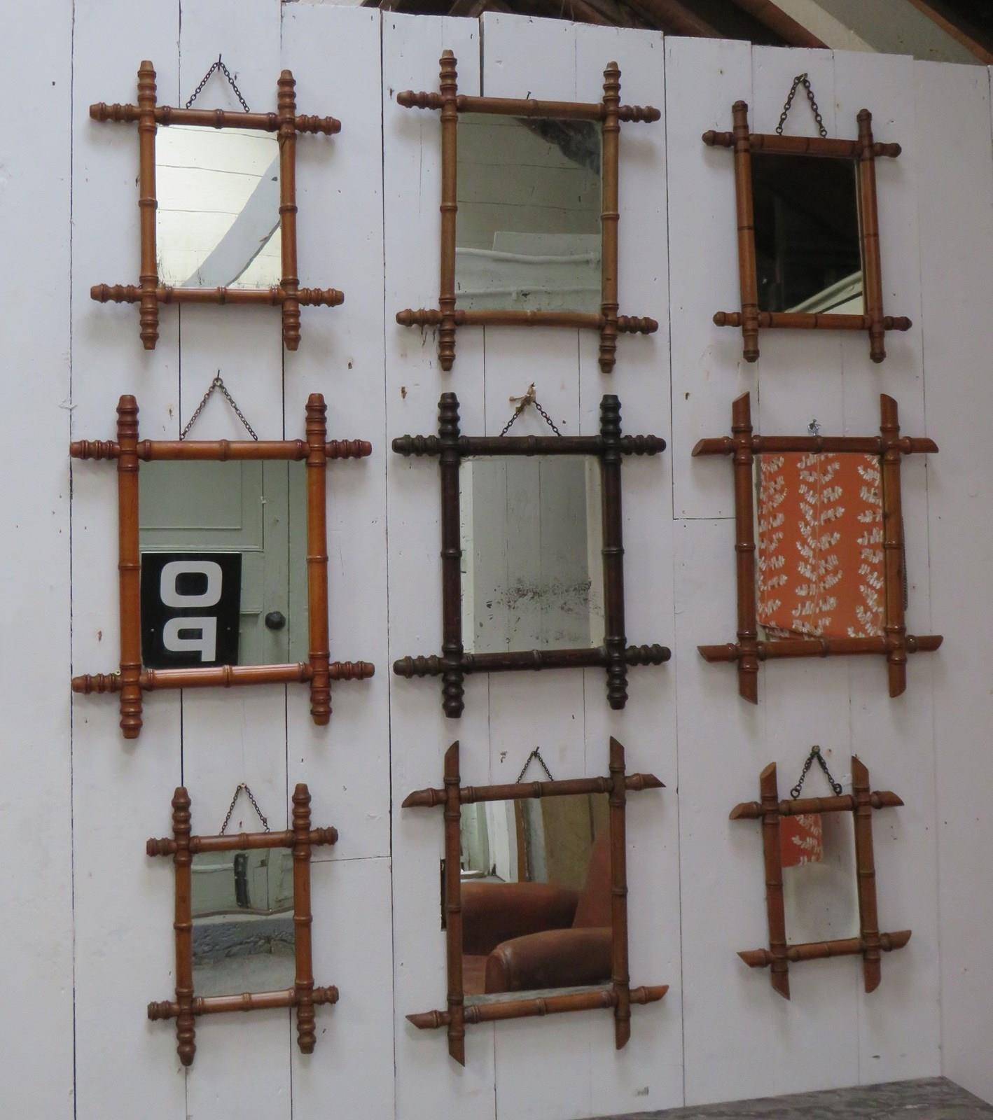 Set of nine late 19th century, early 20th century French decorative faux bamboo wall mirrors with some historical worm holes and foxing to the original glass plates, ready to hang. Various sizes.