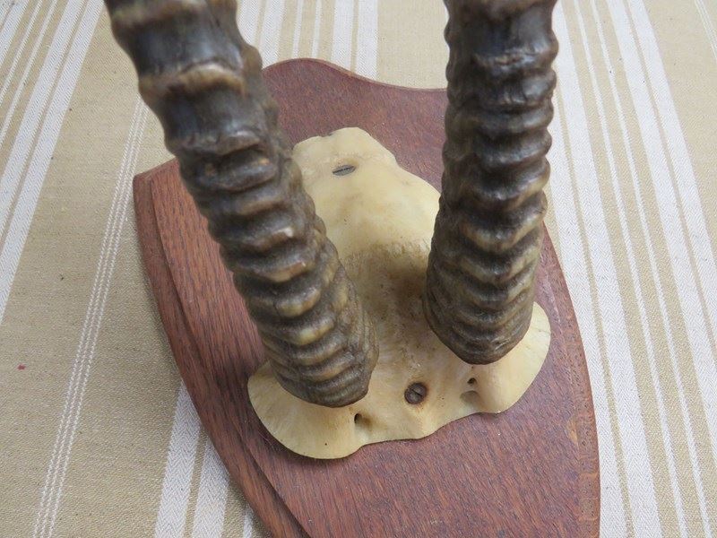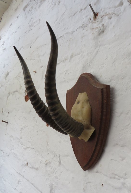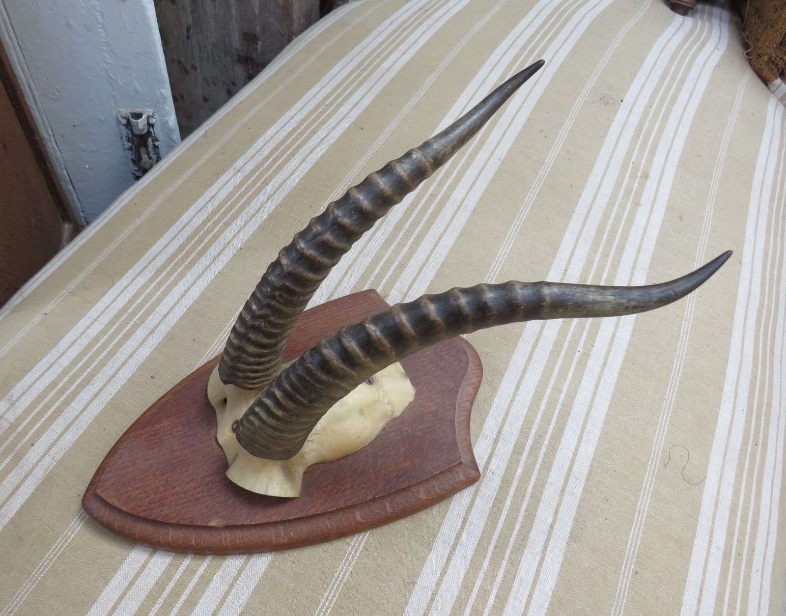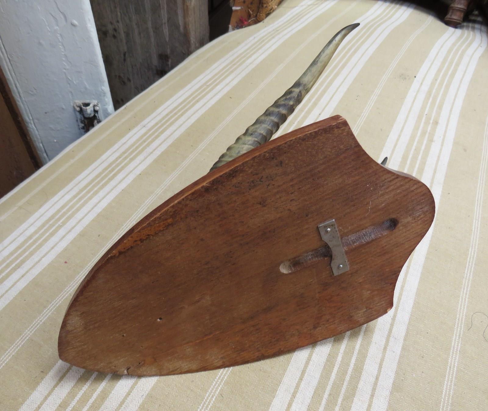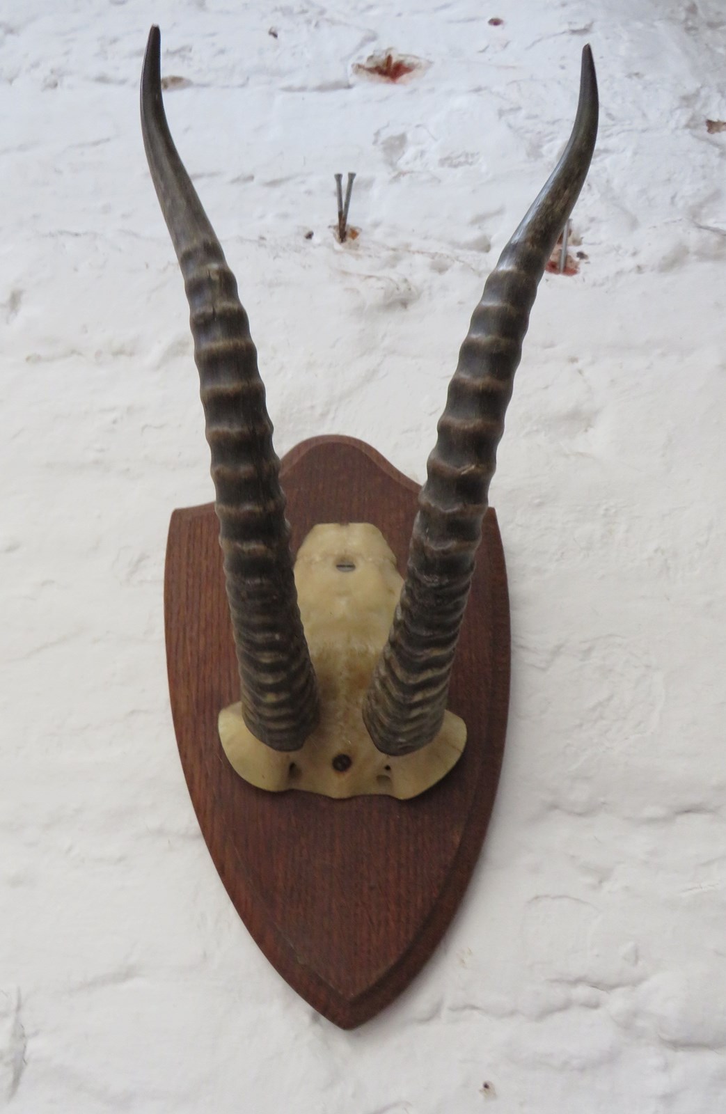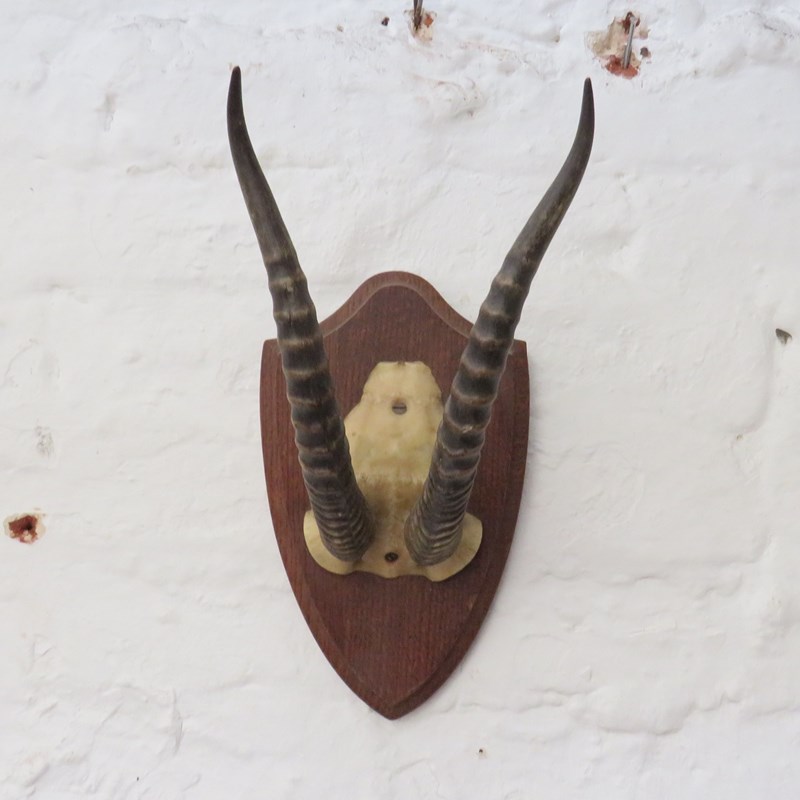 Decorative wall hanging taxidermy antelope antlers and skull mounted on a wooden shield.