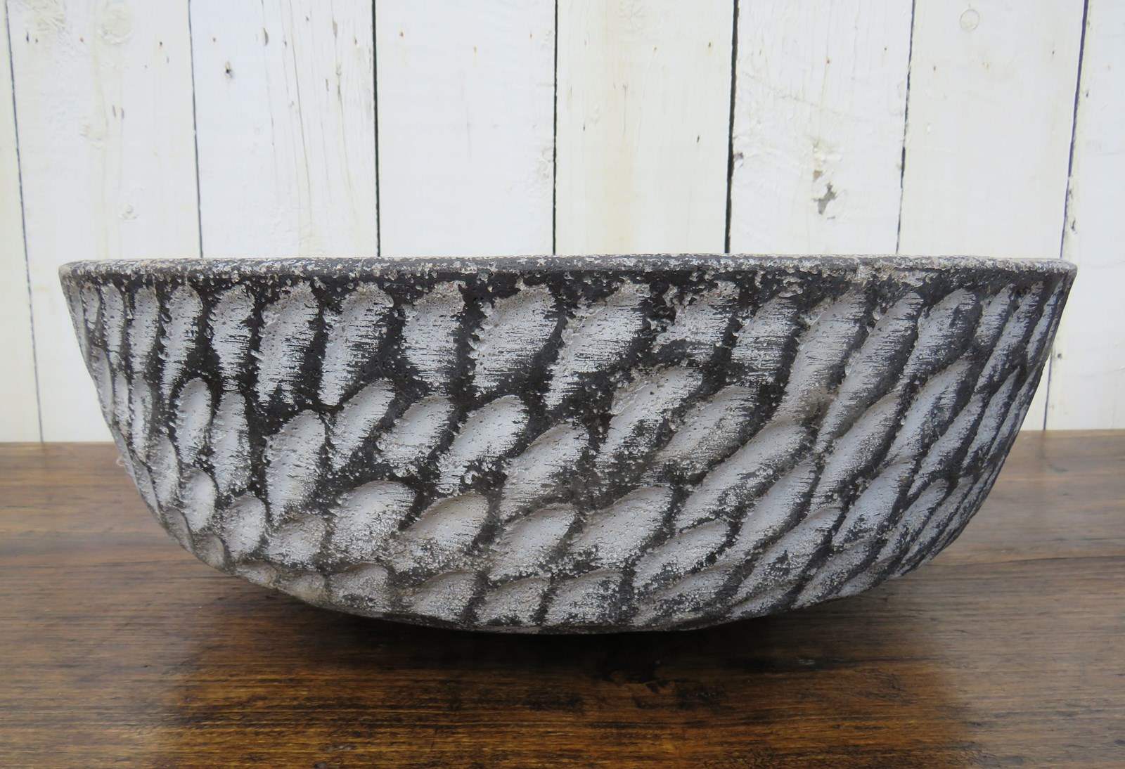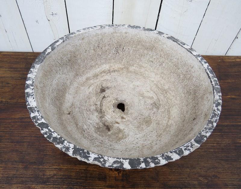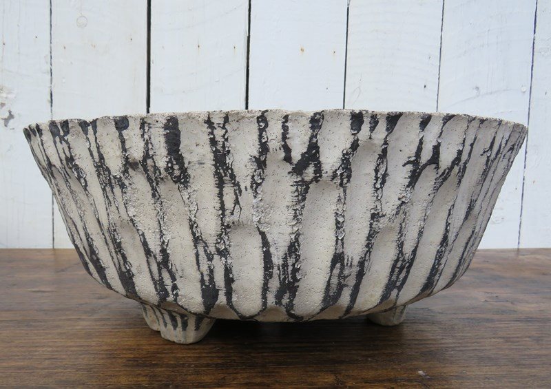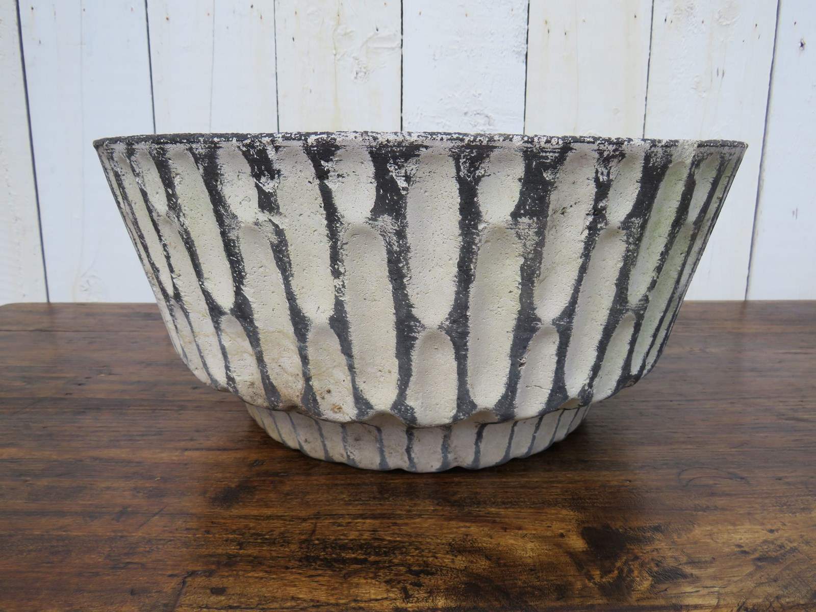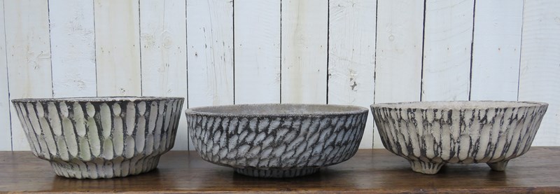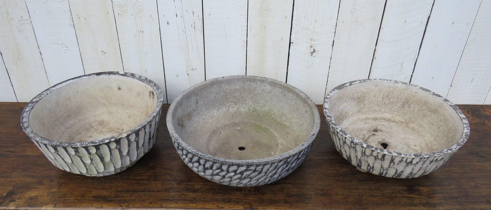 Set of three shapely mid 20th century Swiss decorative concrete garden planters. Other sizes, height 16cm & dia 39cm.