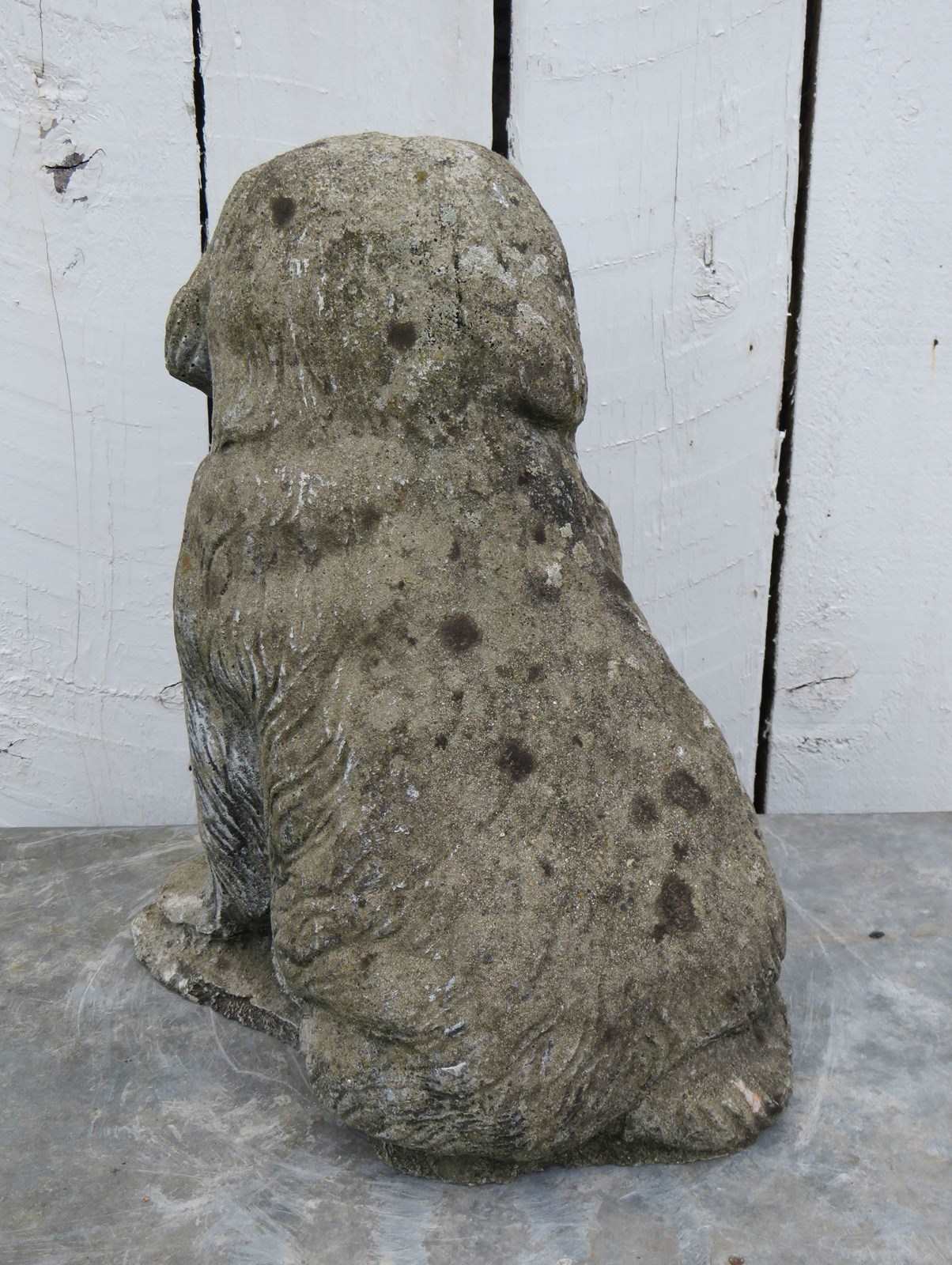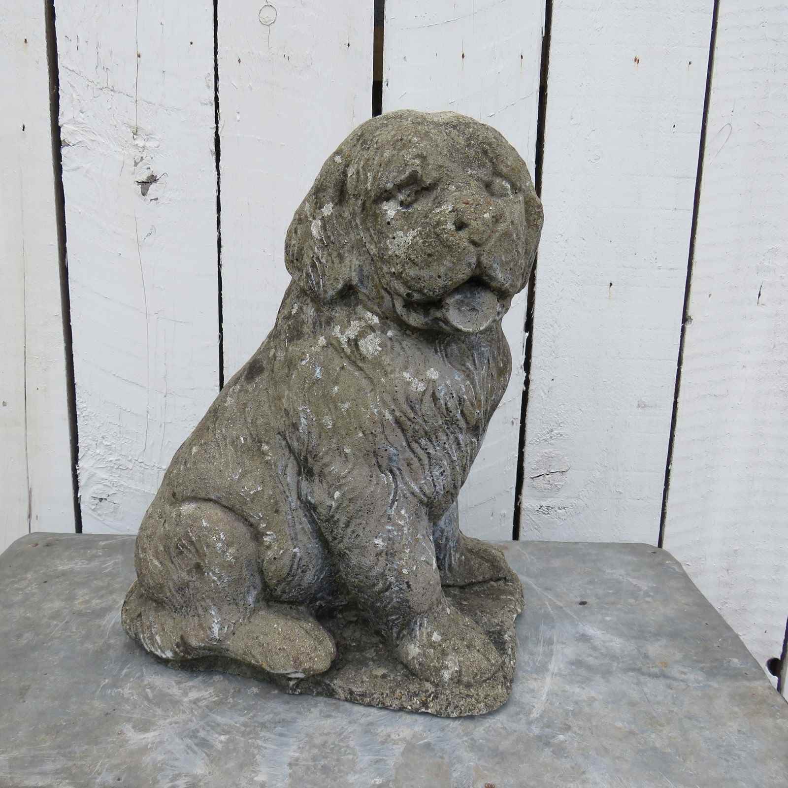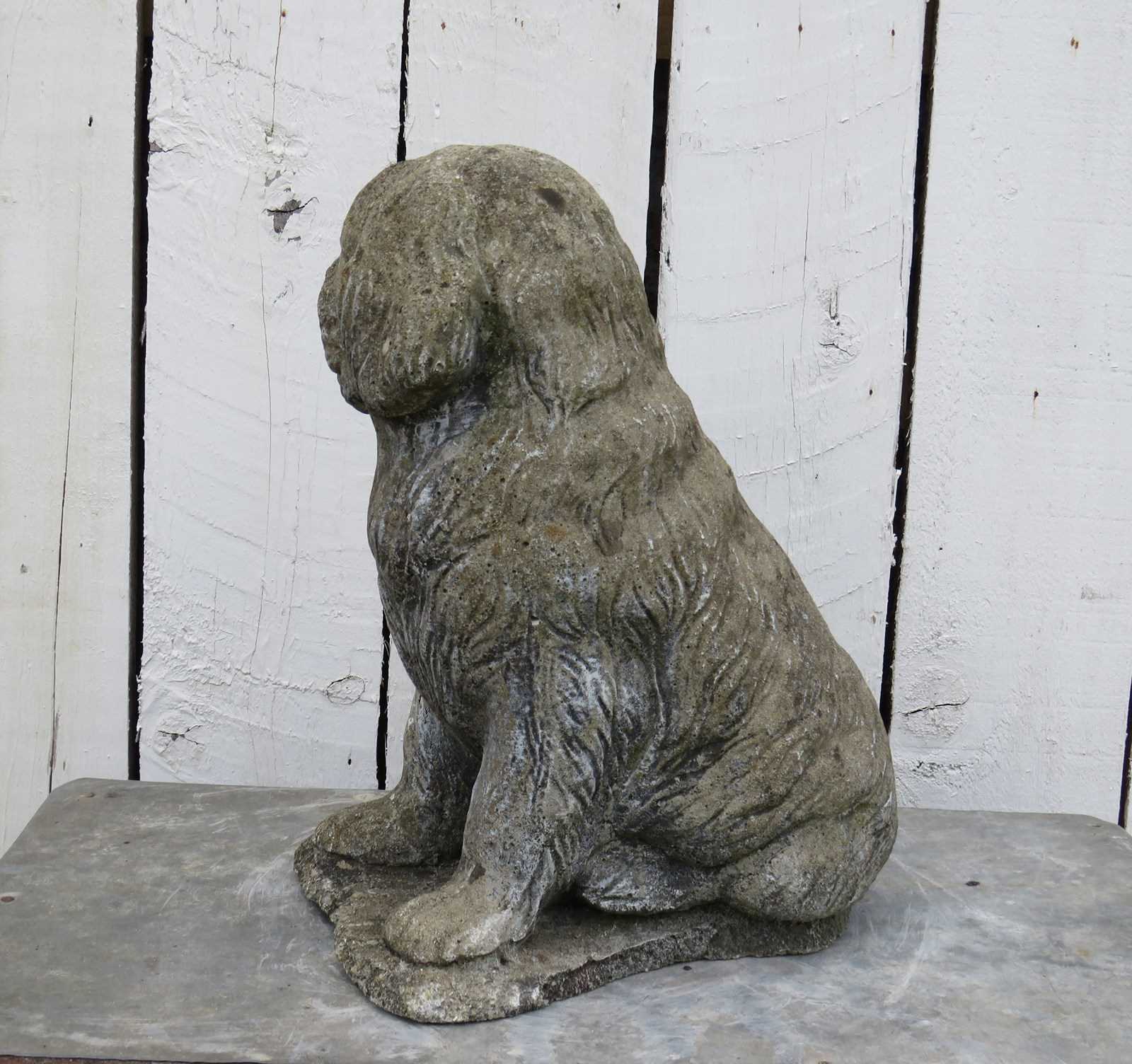 Large and heavy vintage English decorative reconstituted stone statuary weathered garden dog ornament.