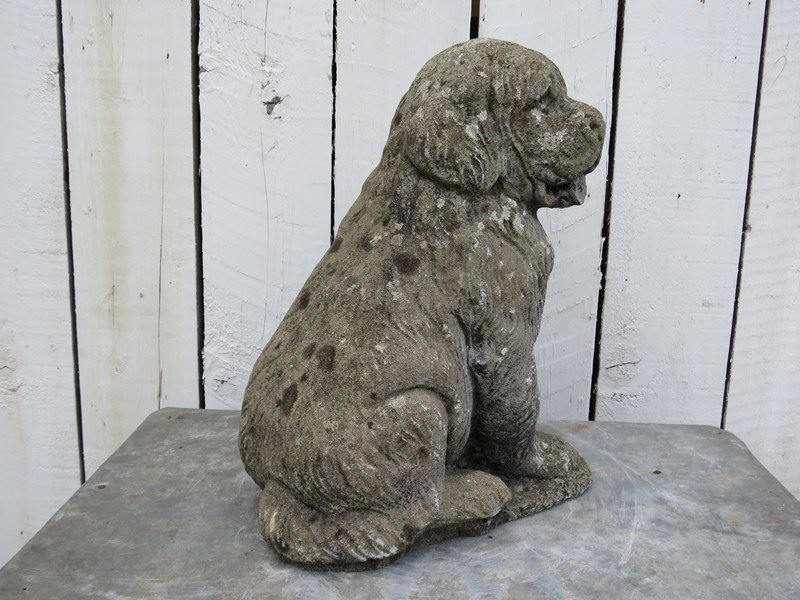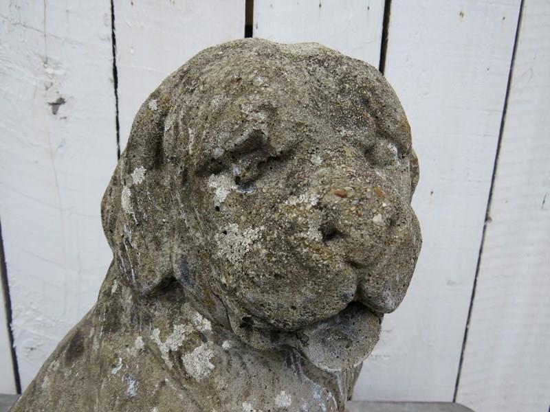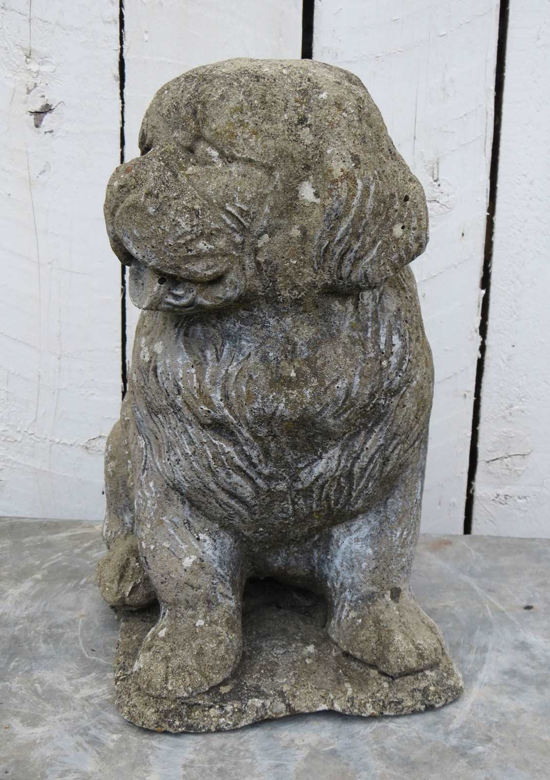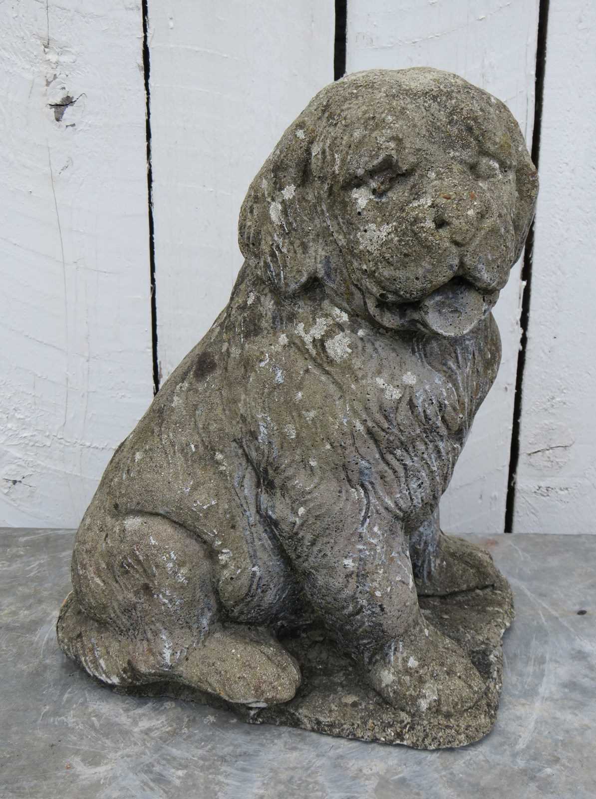 Large and heavy vintage English decorative reconstituted stone statuary weathered garden dog ornament.