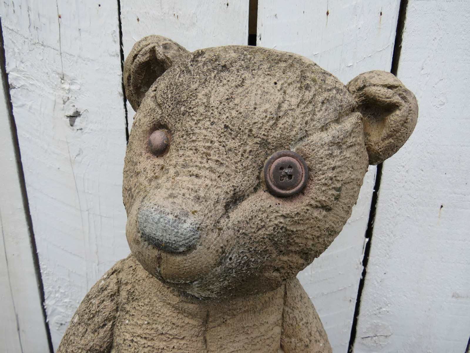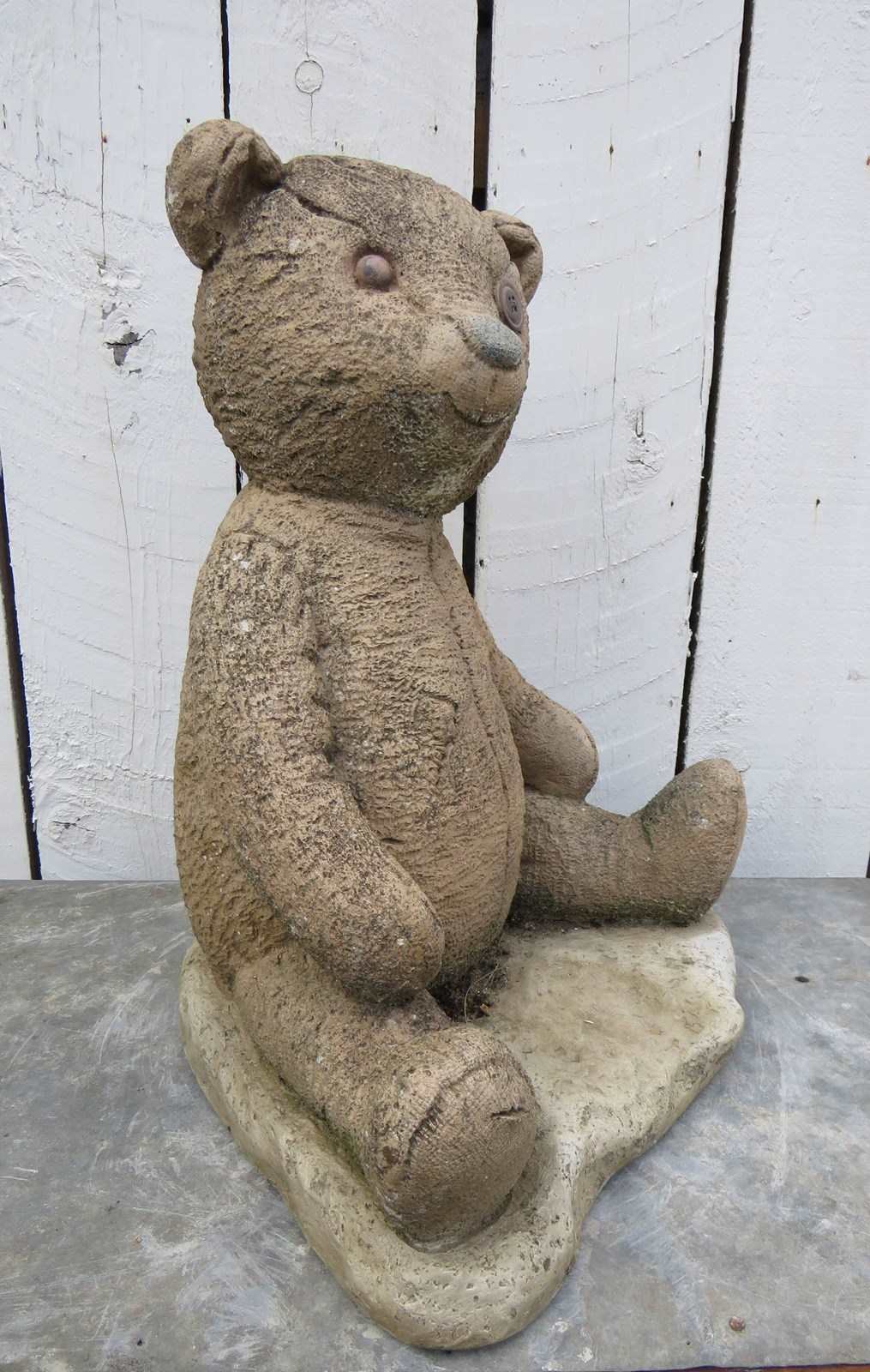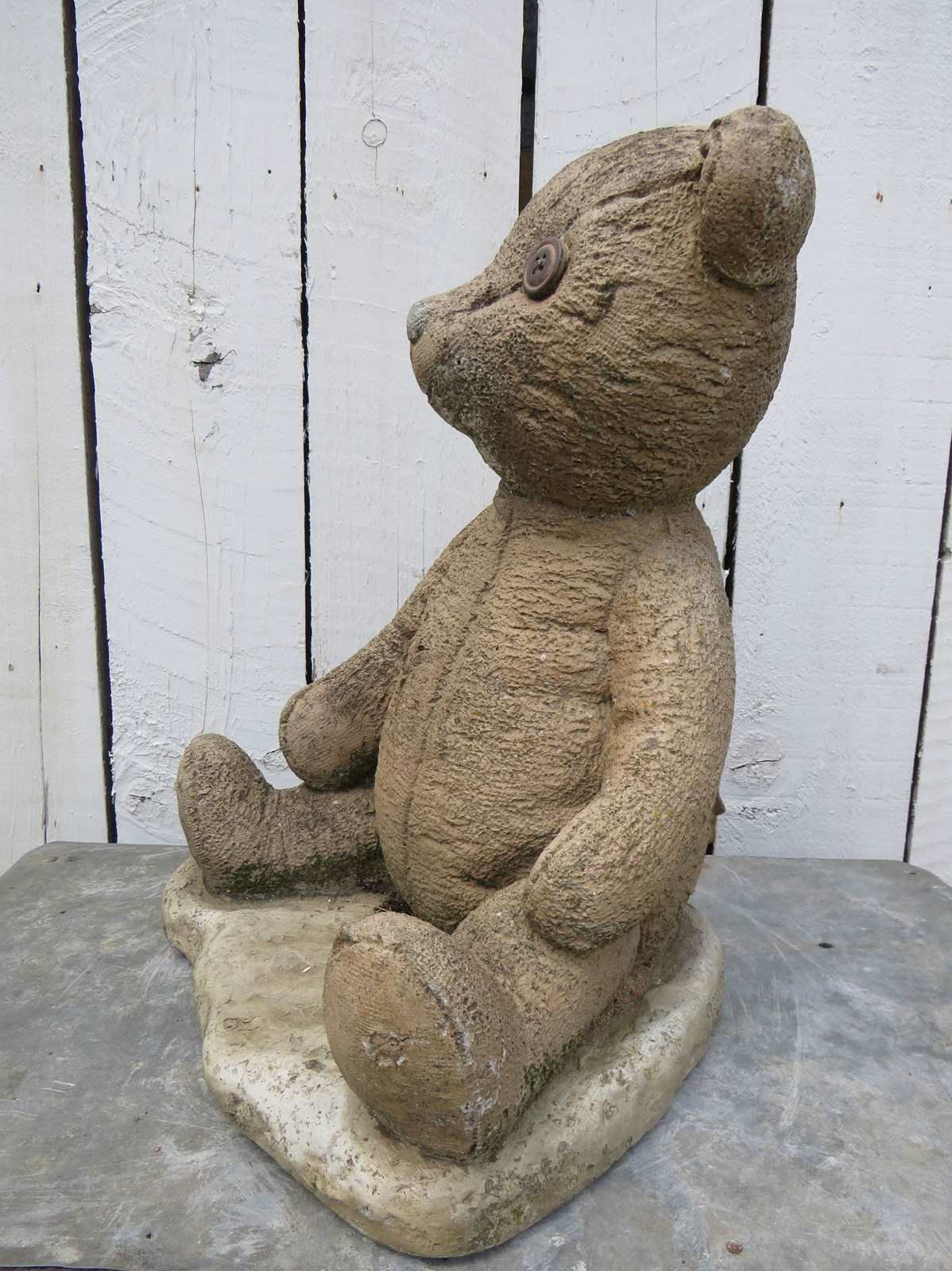 Large and heavy vintage English decorative reconstituted stone statuary weathered garden teddy ornament.