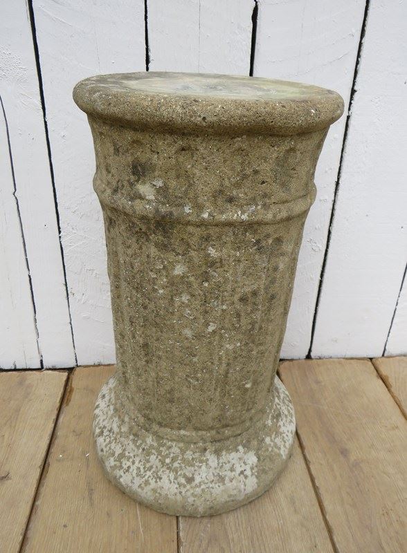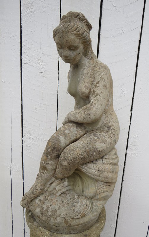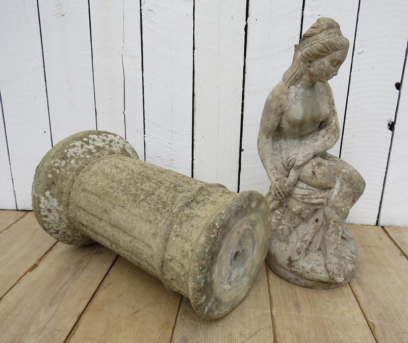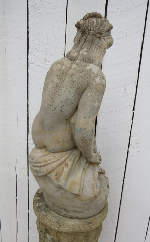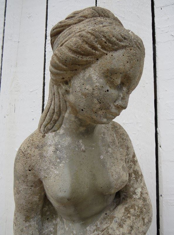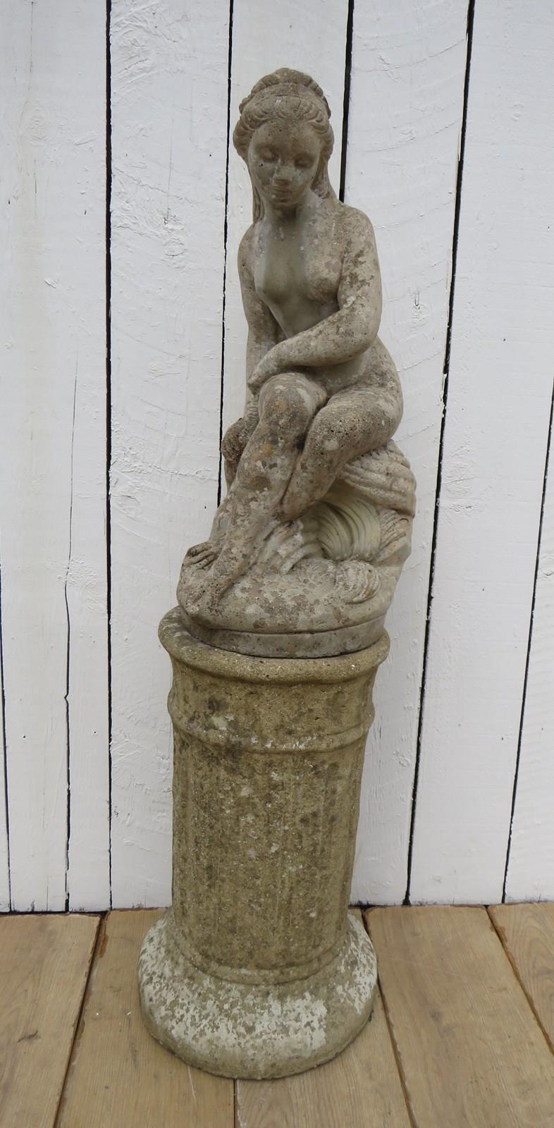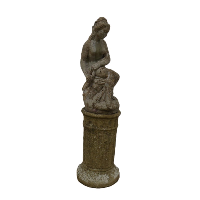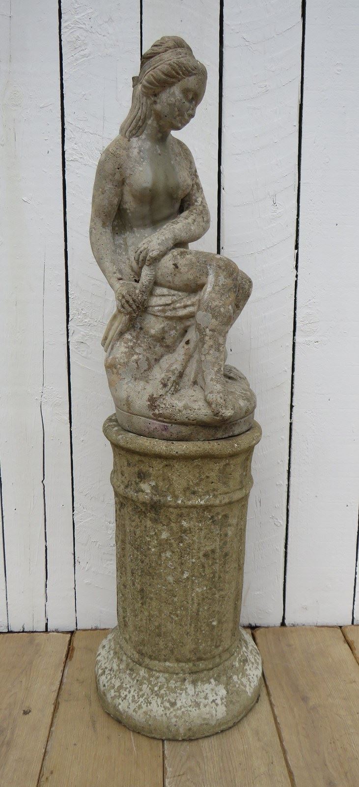 Large and heavy vintage English decorative statuary reconstituted stone weathered garden nude maiden statue and pedestal.