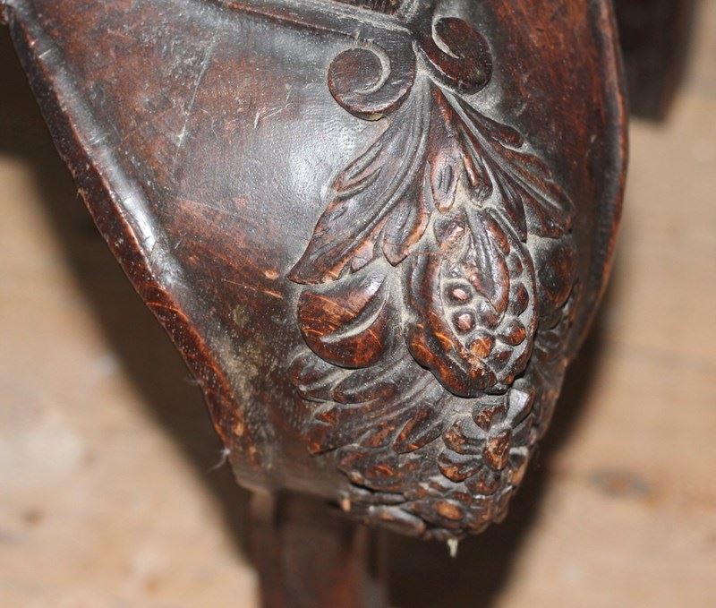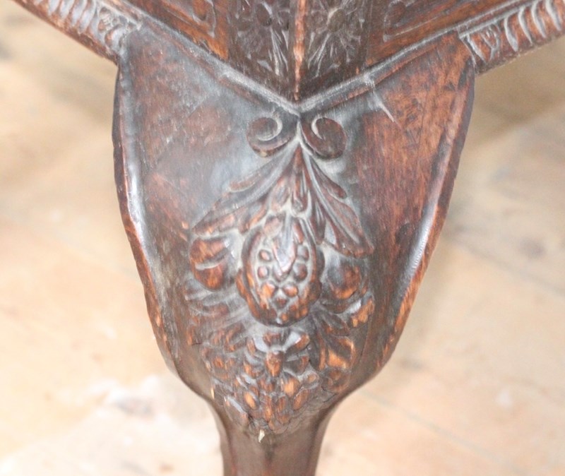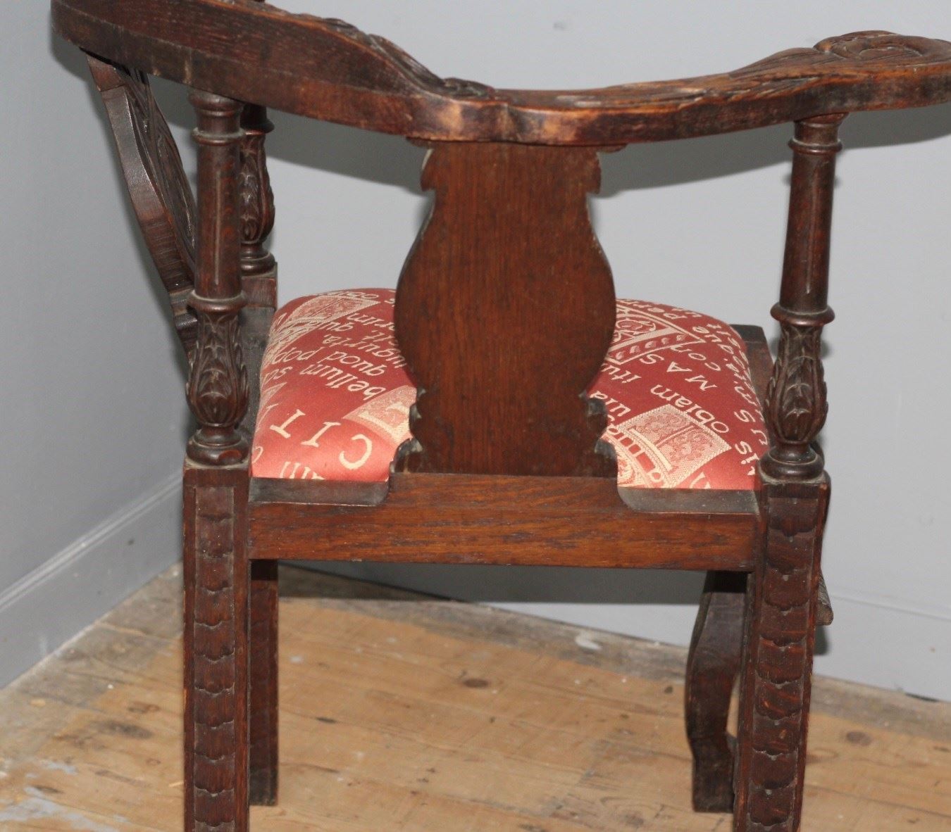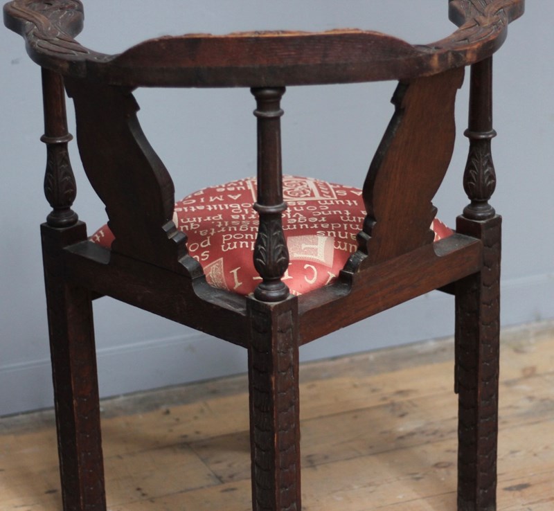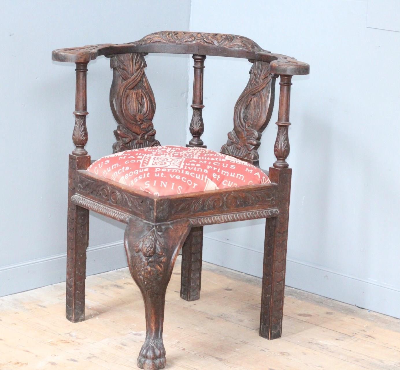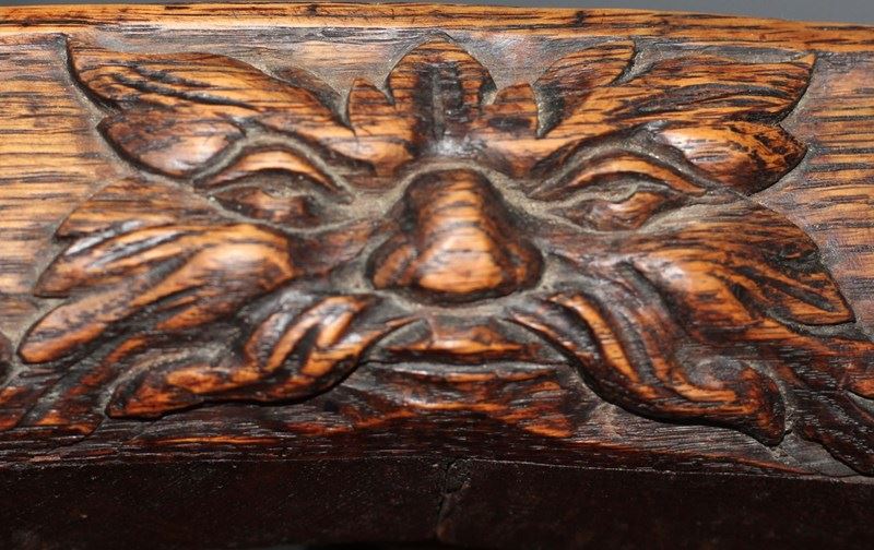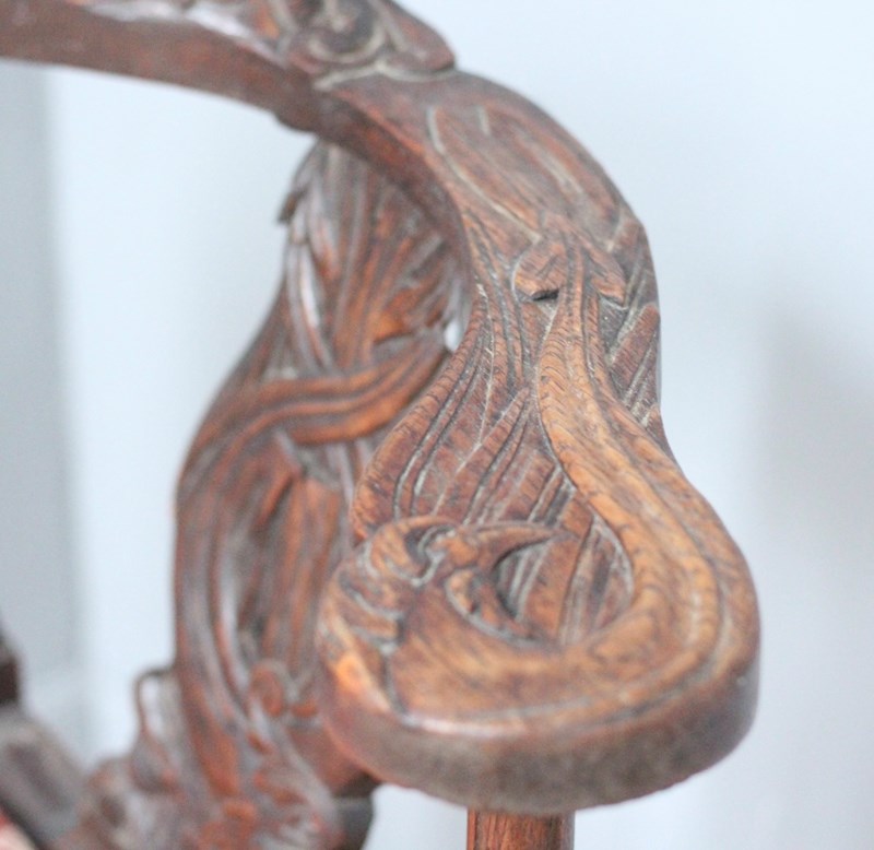 Early oak ‘green man’ corner chair, in need of a new seat cover! Profusely carved with symbolism throughout.