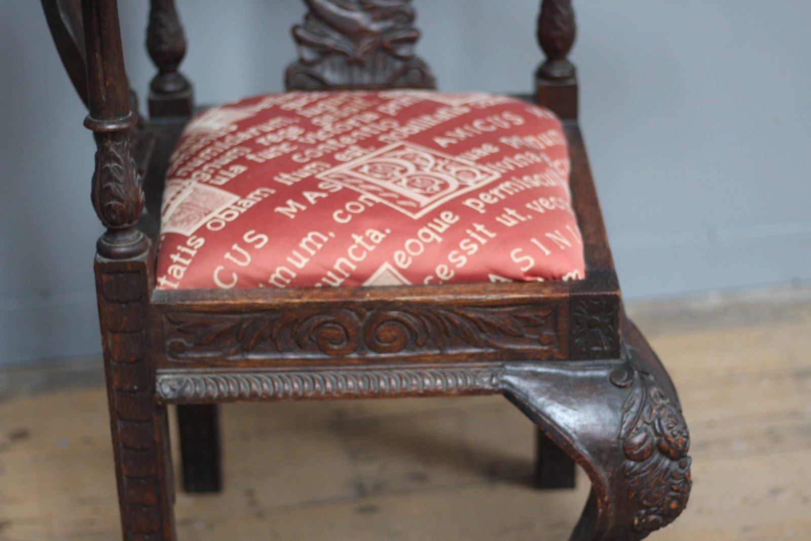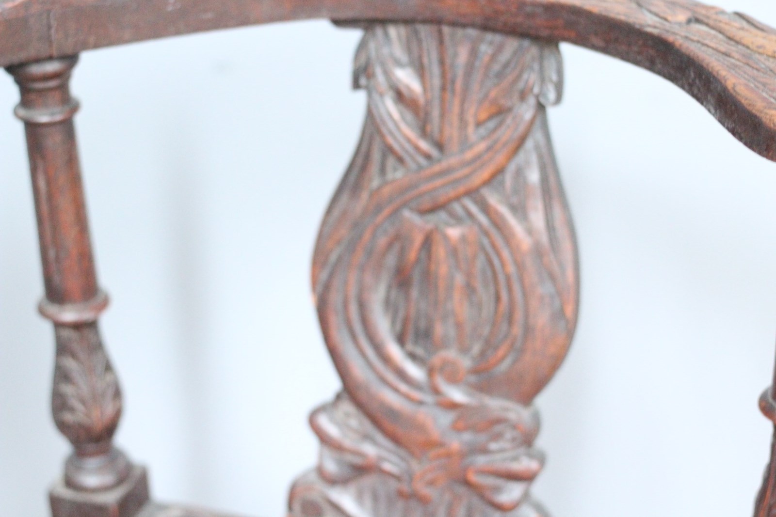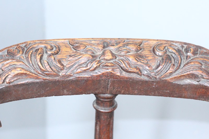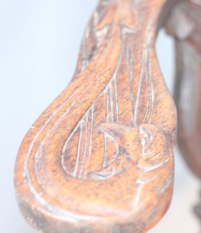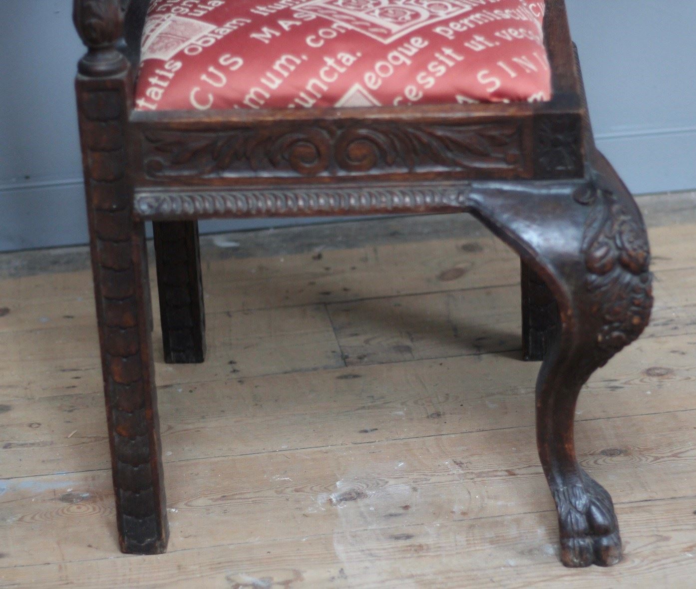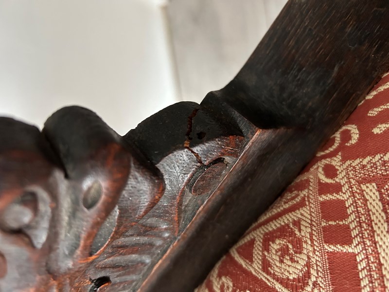 Early oak ‘green man’ corner chair, in need of a new seat cover! Profusely carved with symbolism throughout.