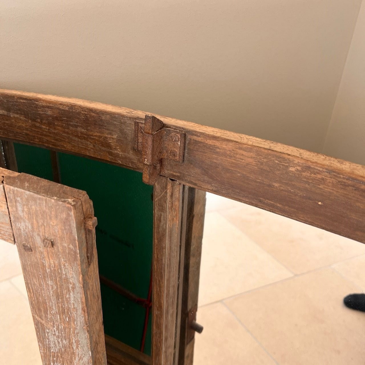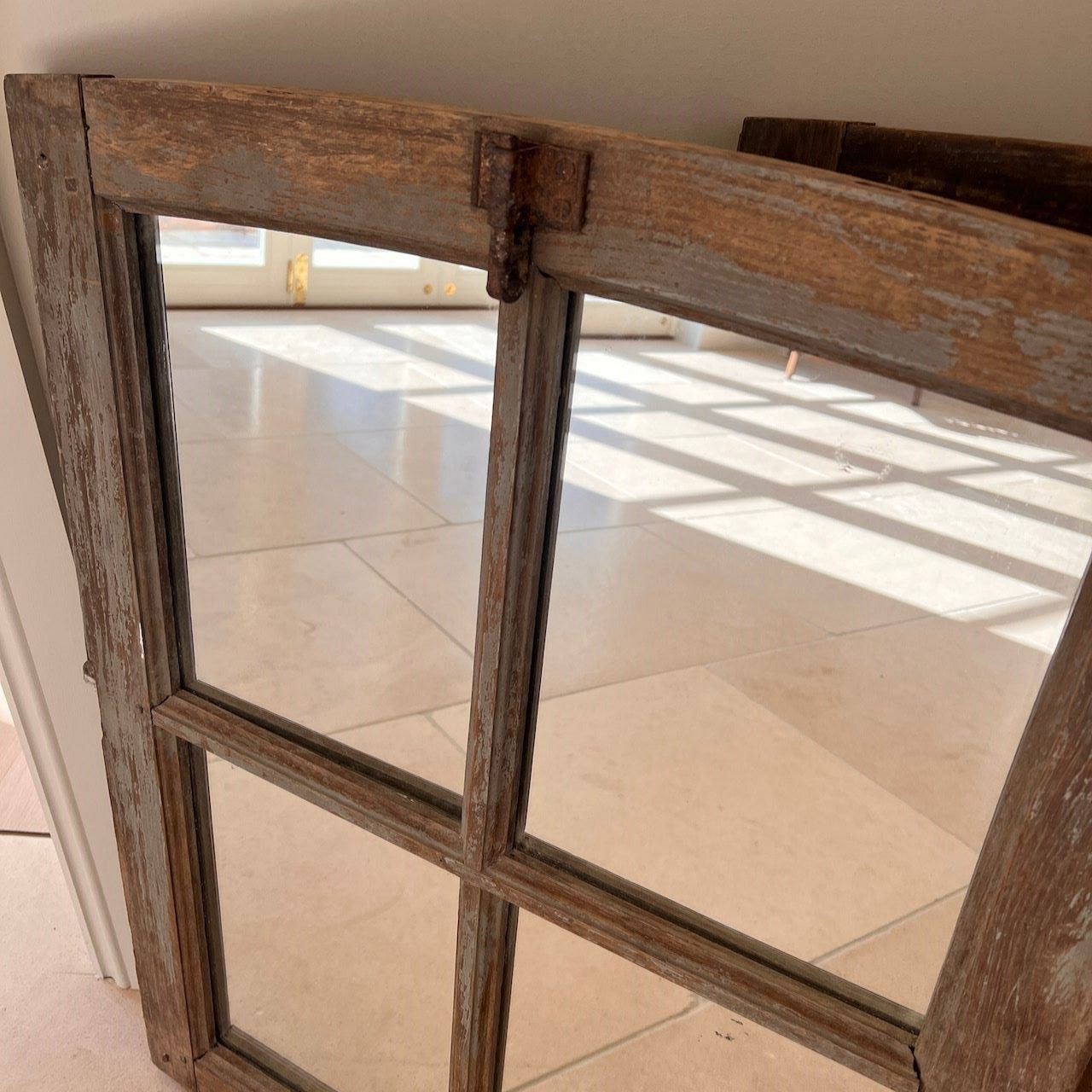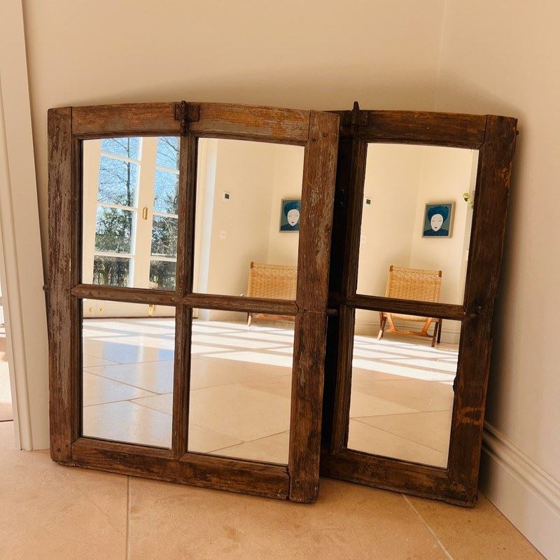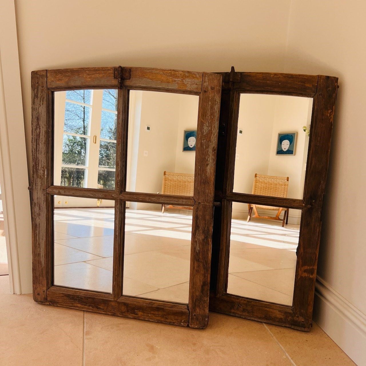 Beautiful, authentic French window mirrors showing wonderful patina – this price is for two. They are solid and the original glass has been replaced. They would complement an outside space or be equally at home inside to create a rustic feel.