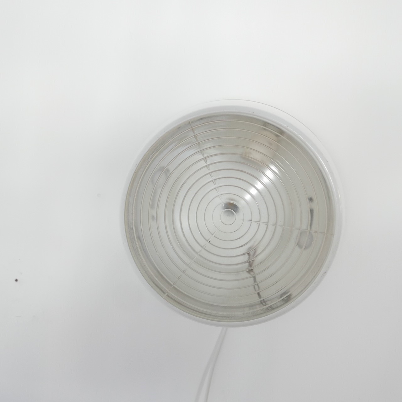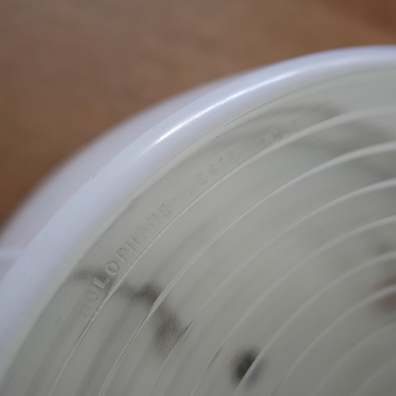 Holophane wall or ceiling lights, Three available, priced and sold individually. Two tone, clear glass with an opaline glass surround.MRe-wired and ready to hang.MEmbossed with holophane and Made in France in the glass. French, c1960s. Dimensions: 16 H x 35 Diameter in cm. Delivery: POA Collection or viewing can be arranged at our Hampton Court Gallery via appointment.