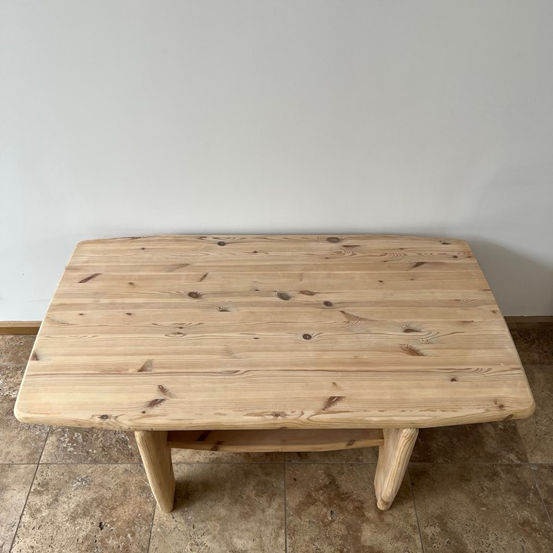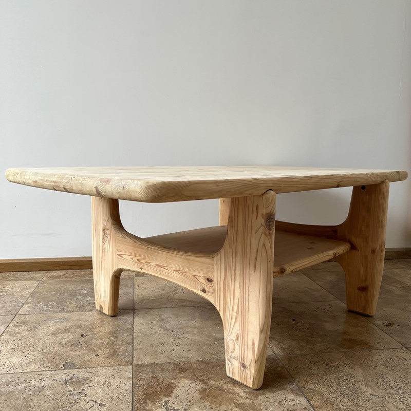 A large pine coffee table. Denmark, c1960s. Sculptural free form. The top seperates for transport. Very good condition, the coffee table has been stripped to bare finish, it can be finished per clients requests. 135 W x 76 D x 52 H in cm. Delivery: POA Viewing or collection can be arranged at our Hampton Court Gallery via appointment.