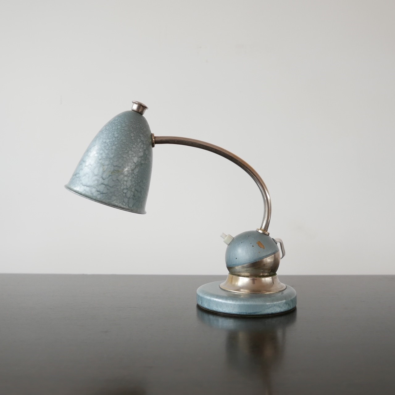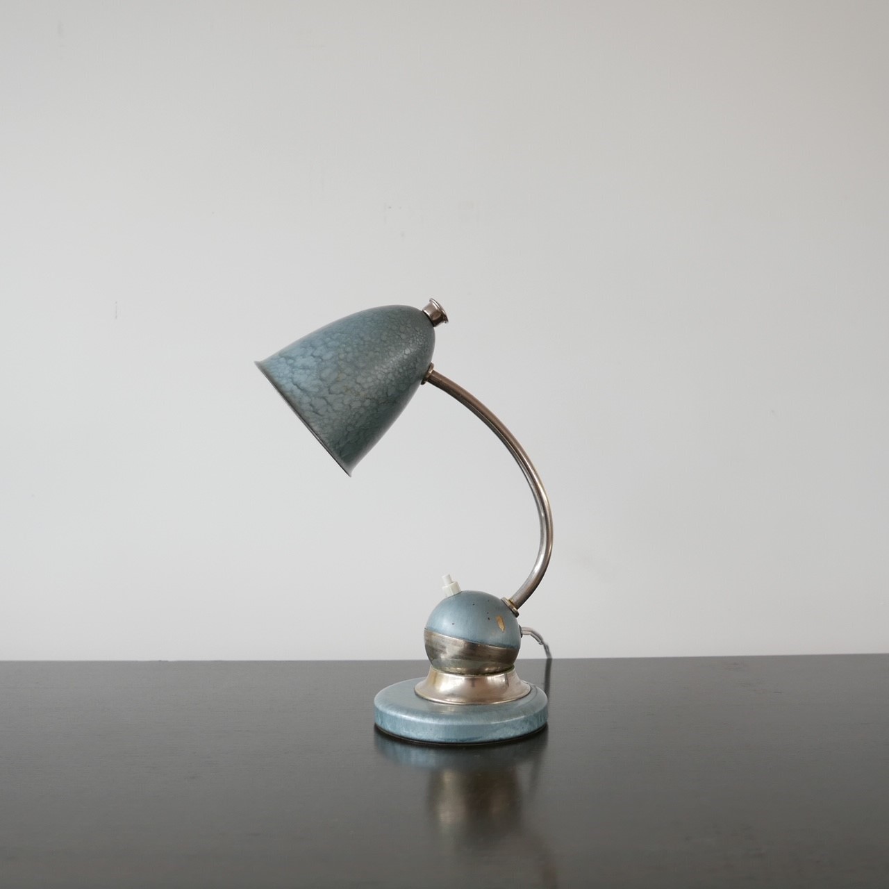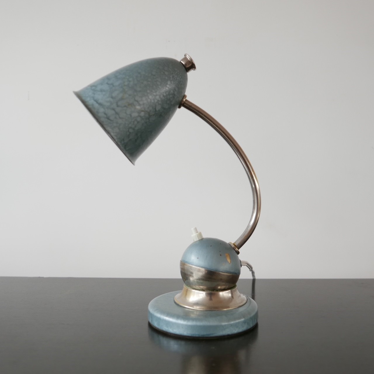 Dutch adjustable ball table lamp. Holland, c1950s. Painted metal and brass, original blue paint finish in near perfect condition, there is the occasional bit of wear to the paint but very small. The light rotates on the ball and at the shade making it functional as well as stylish. Dimensions: 29 H x 23 W x 12 D in cm. Delivery: POA Viewing or collection can be arranged at our Hampton Court Gallery via appointment.