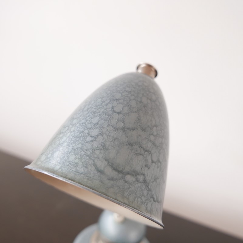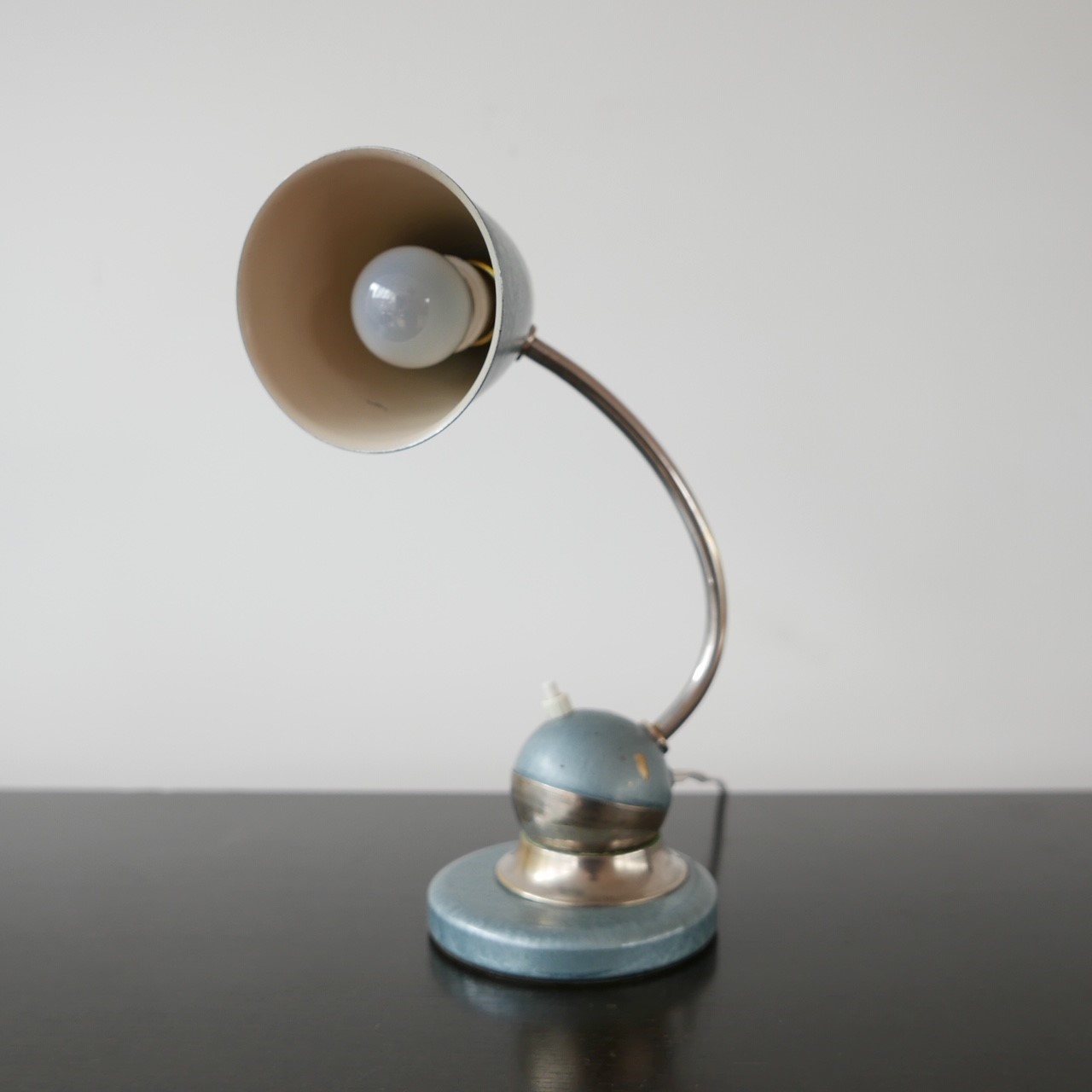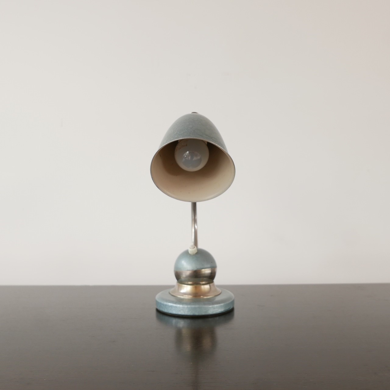 Dutch adjustable ball table lamp. Holland, c1950s. Painted metal and brass, original blue paint finish in near perfect condition, there is the occasional bit of wear to the paint but very small. The light rotates on the ball and at the shade making it functional as well as stylish. Dimensions: 29 H x 23 W x 12 D in cm. Delivery: POA Viewing or collection can be arranged at our Hampton Court Gallery via appointment.