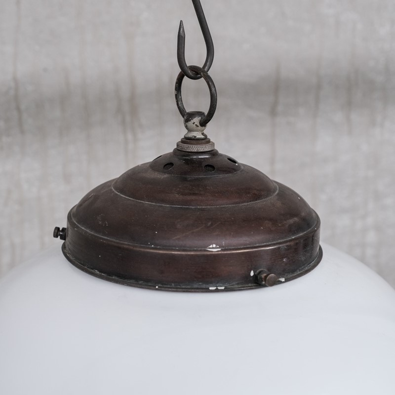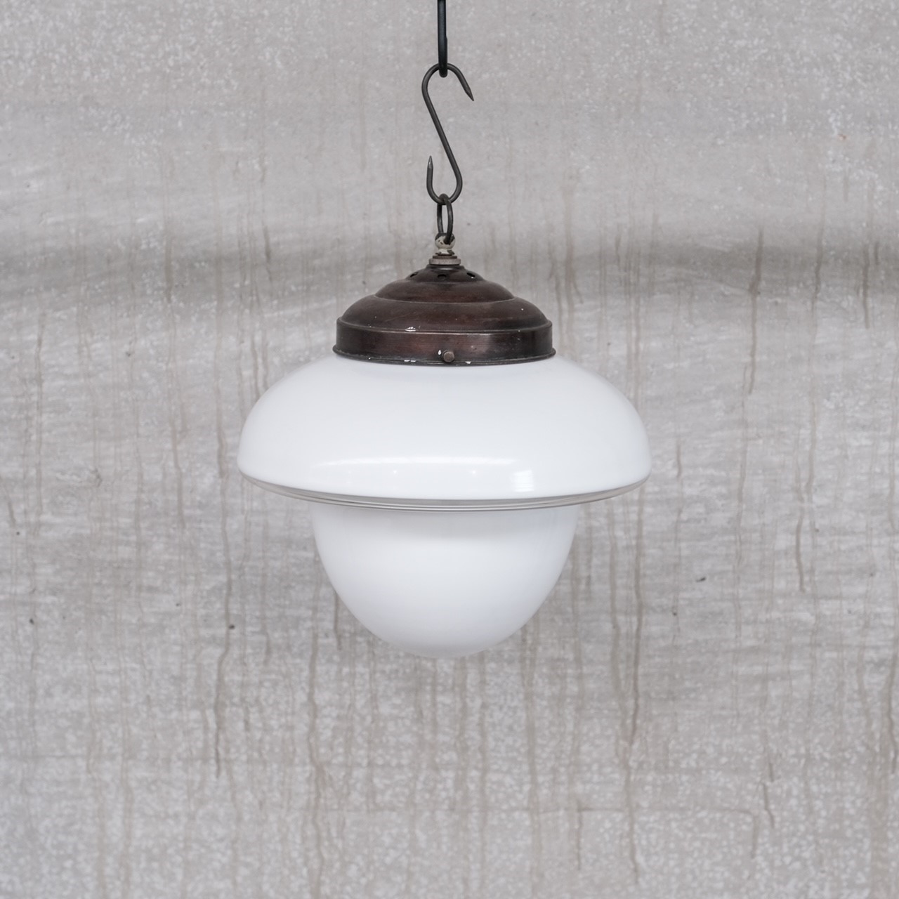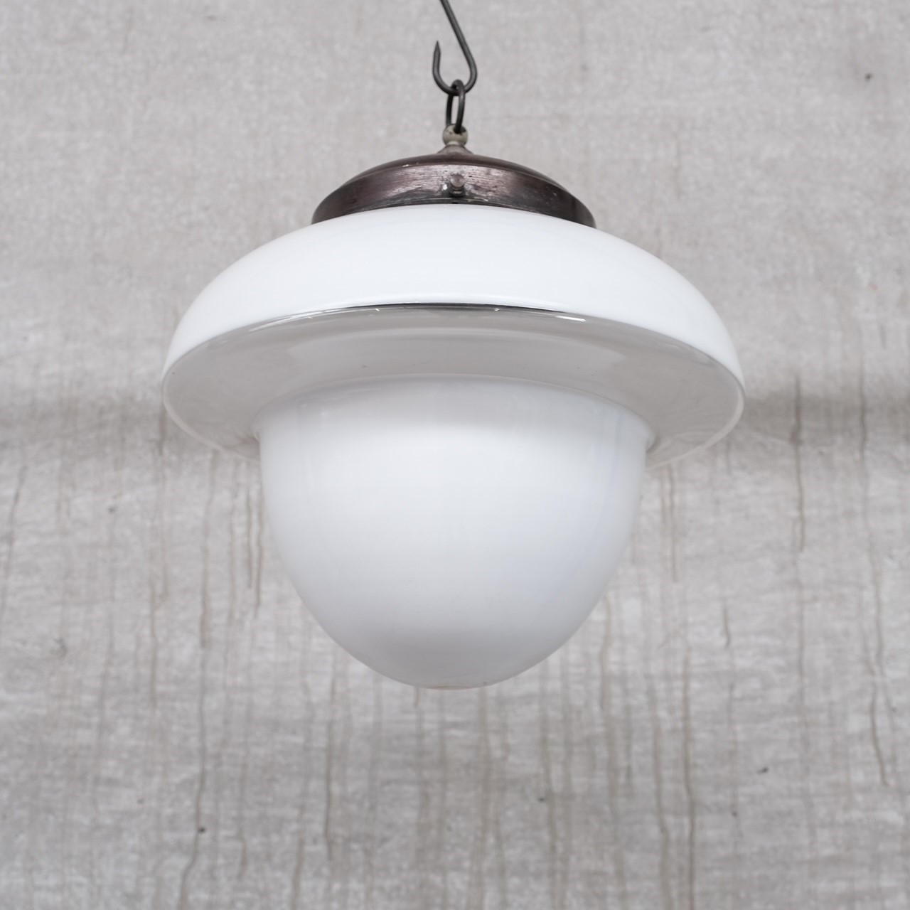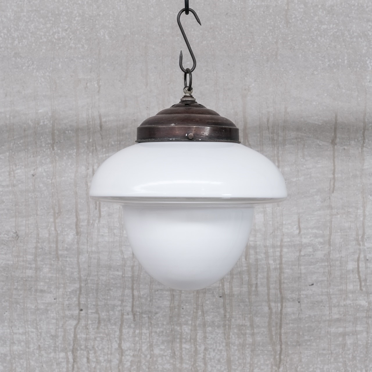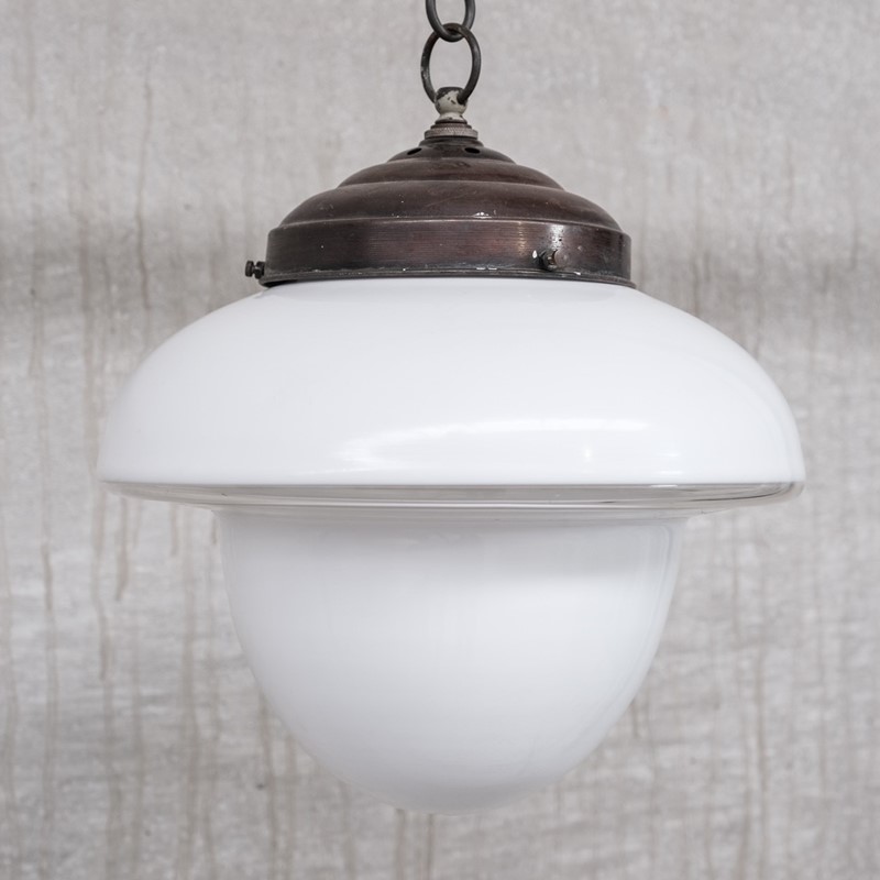 A single opaline church light pendant. France, c1950s. Predominately opaline glass the underside to the rim is clear glass. Good quality naturally patinated stepped brass gallery. Since re-wired and PAT tested. Location: Belgium Gallery. Dimensions: 29 Diameter x 28 H in cm. Delivery: POA We can ship around the world. Can be transferred to our London or Belgium Gallery.