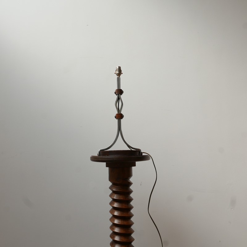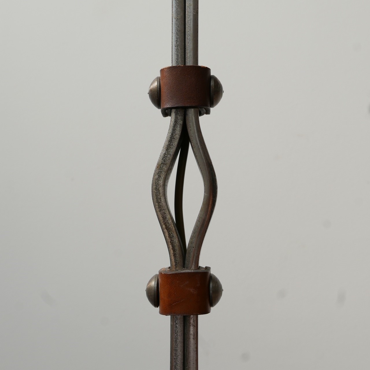 A stylish floor lamp by Jean-Pierre Ryckaert. France, c1950s. Leather and iron. Often attributed to Jacques Adnet because of the quality and style. Good condition. Re-wired and PAT tested. Dimensions: 45 H x 21 Diameter in cm. Delivery: POA Collection or viewing can be made at our Hampton Court Gallery via appointment.