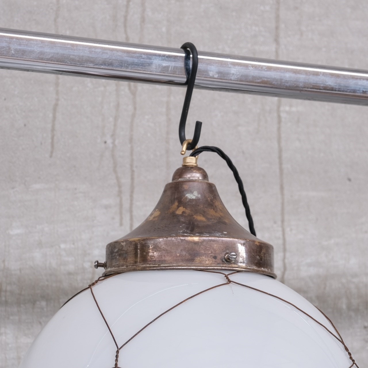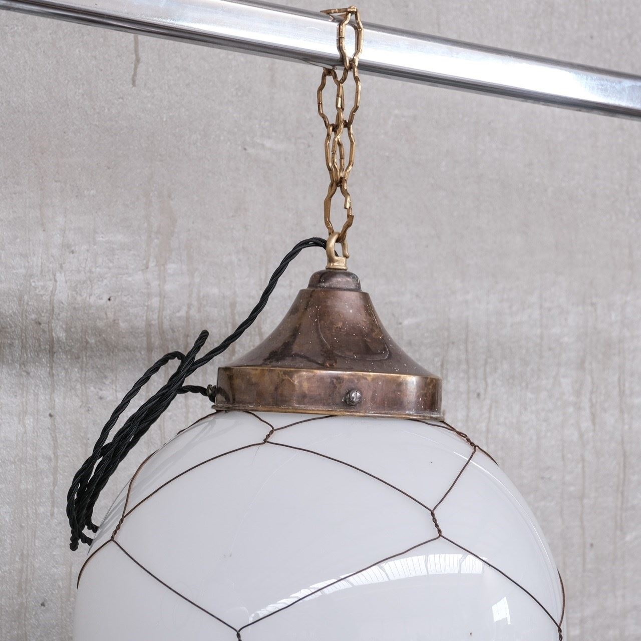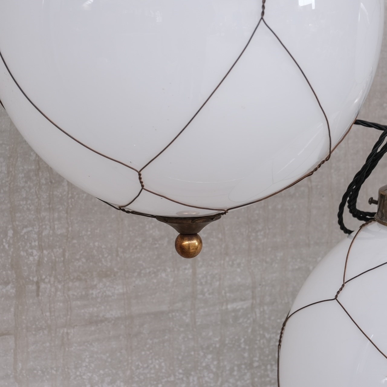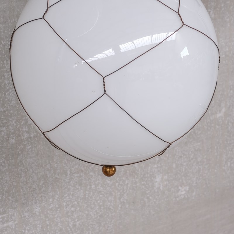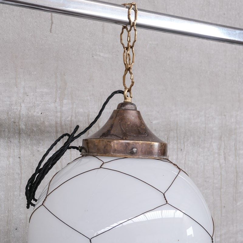 Opaline and brass caged glass pendant lights.Holland, c1950s.Natural patina to the metal.PRICED AND SOLD INDIVIDUALLY.3 available at the time of listing. Please check for updated stock amounts.Re-wired and PAT tested.Location: Belgium Gallery.Dimensions: 50 H x 35 Diameter in cm.Delivery: POAWe can ship around the world. Can be transferred to our London or Belgium Gallery.