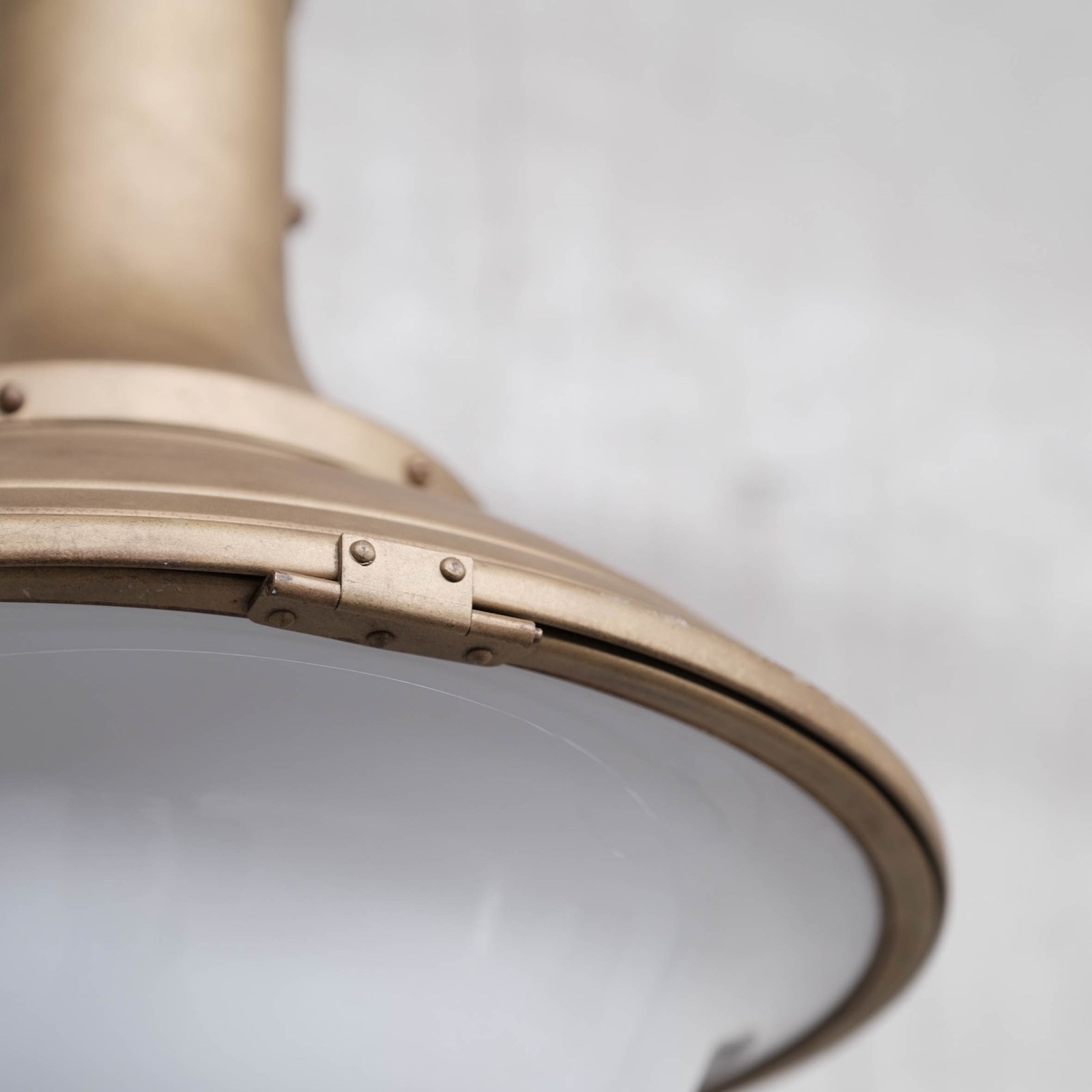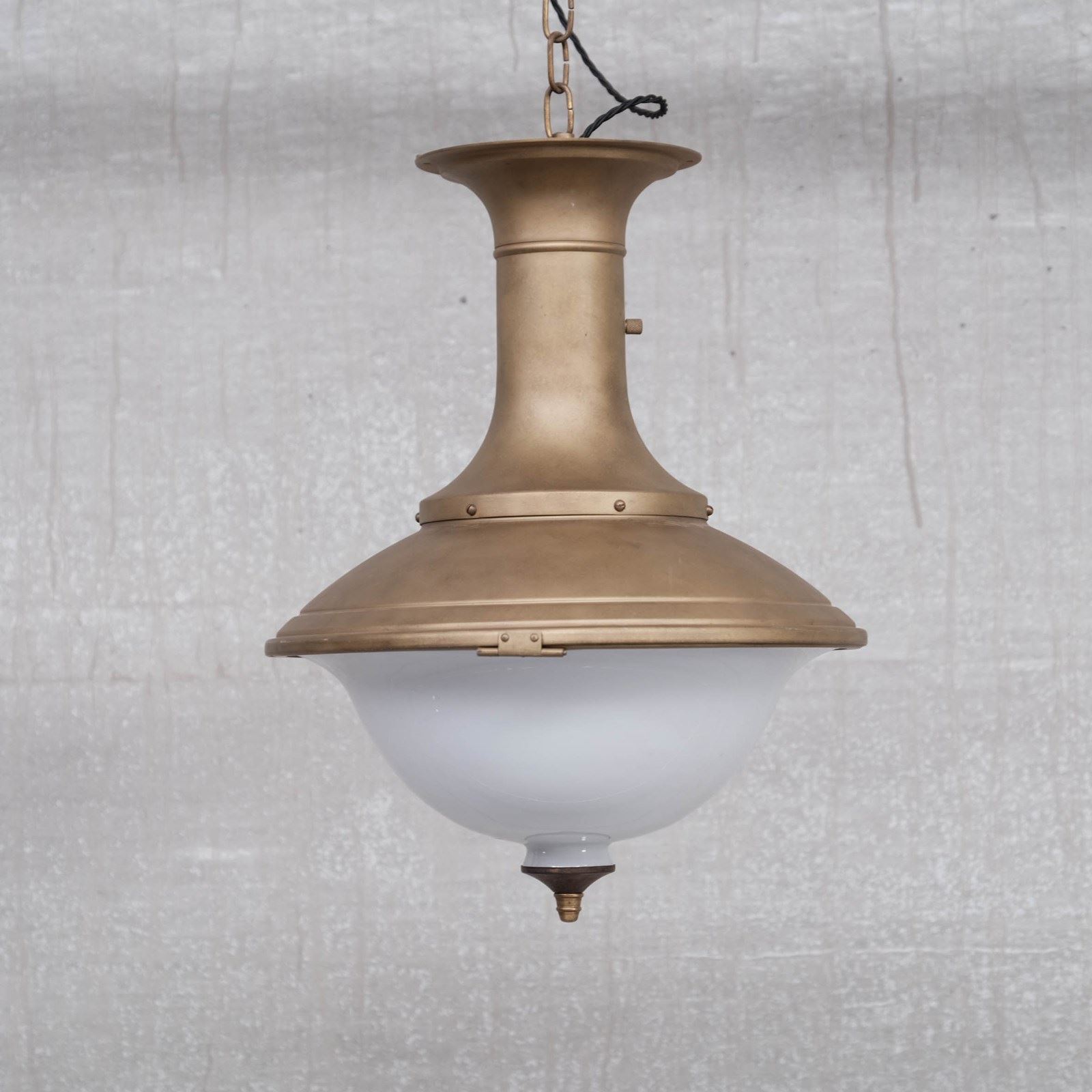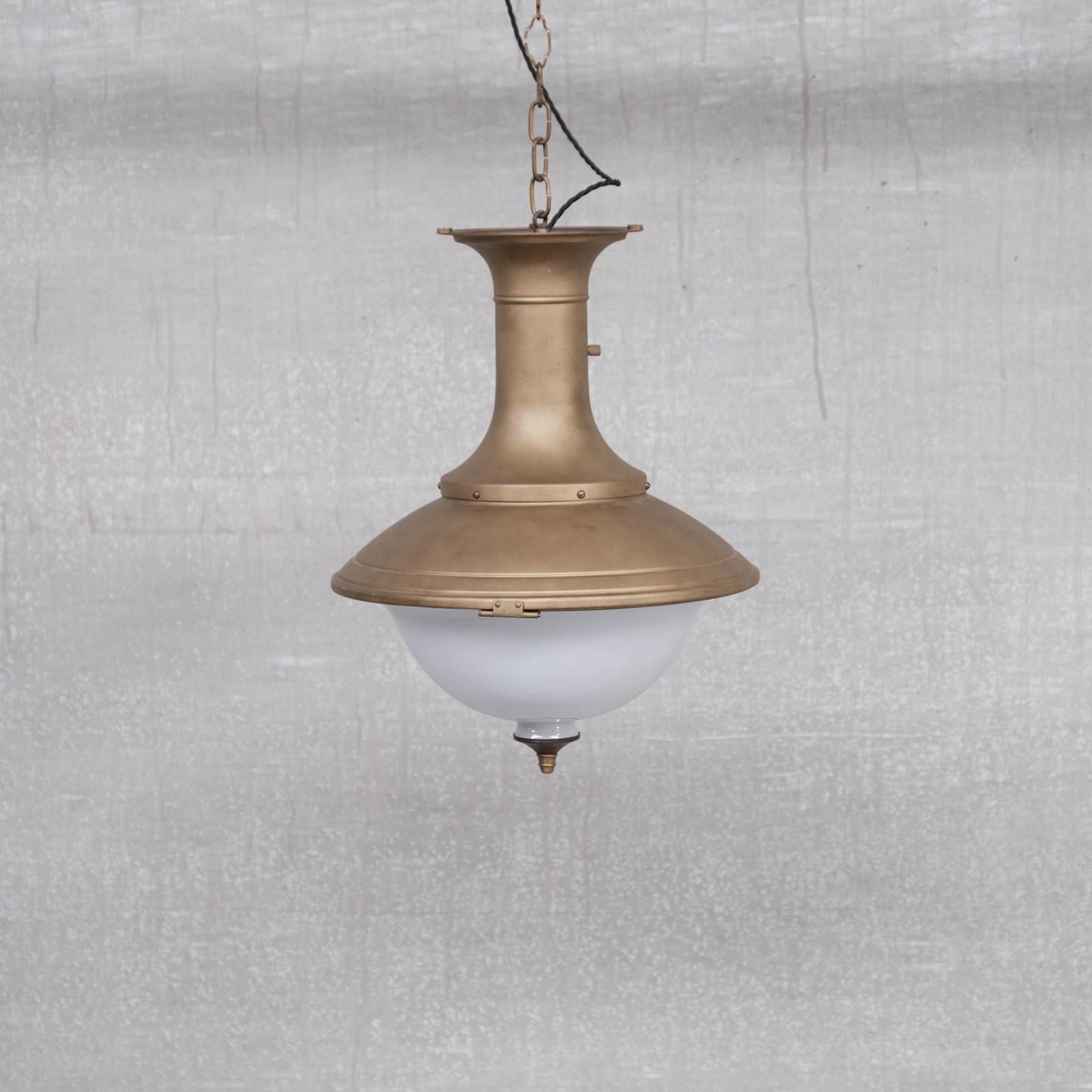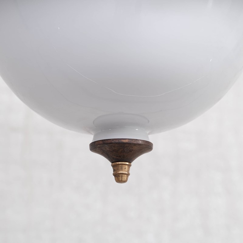 A pair of large brass pendants with opaline glass base, terminating in a brass finial. Holland, c1950s.Heavy and good quality. Price is for the pair.Re-wired and PAT tested. No original chain or ceiling rose was retained but these are easily sourced online.Location: Belgium Gallery.Dimensions: 36 Diameter x 49 H in cm.  Delivery: POAWe can ship around the world. Can be transferred to our London or Belgium Gallery.
